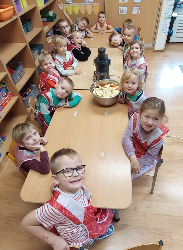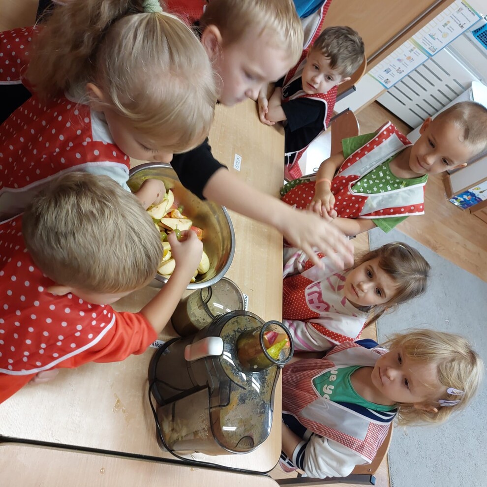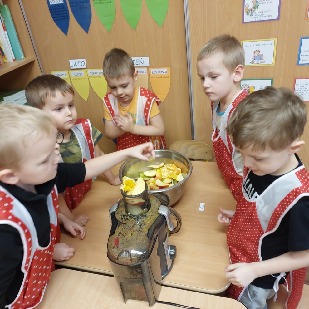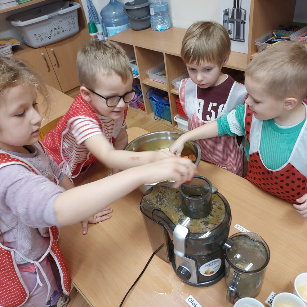 W grupie Biedronki, jak co środę, odbyły się zajęcia kulinarne. Tym razem przedszkolaki przygotowały sok owocowy, ucząc się jednocześnie obsługi sprzętu AGD – sokowirówki – oraz zasad bezpiecznego korzystania z niej.