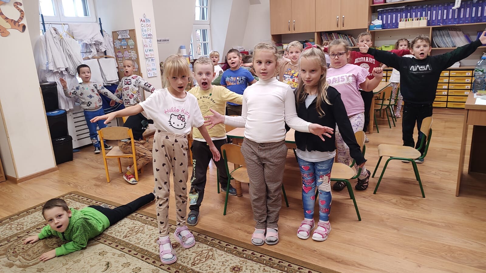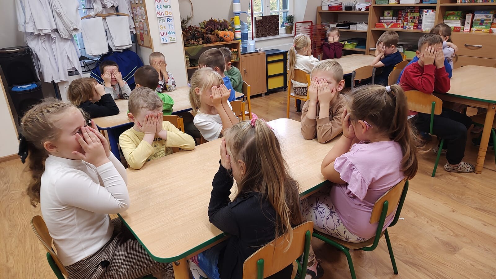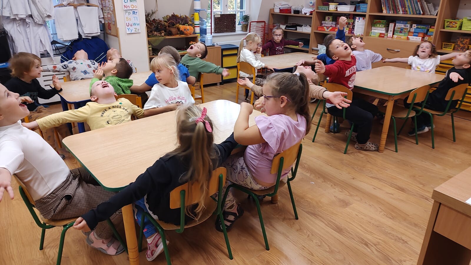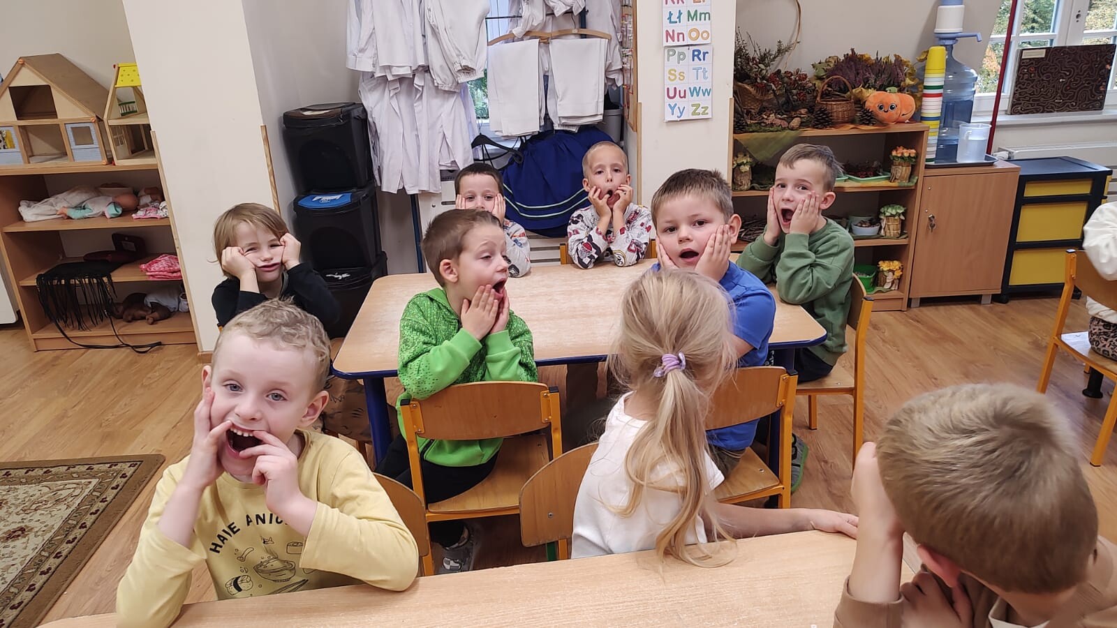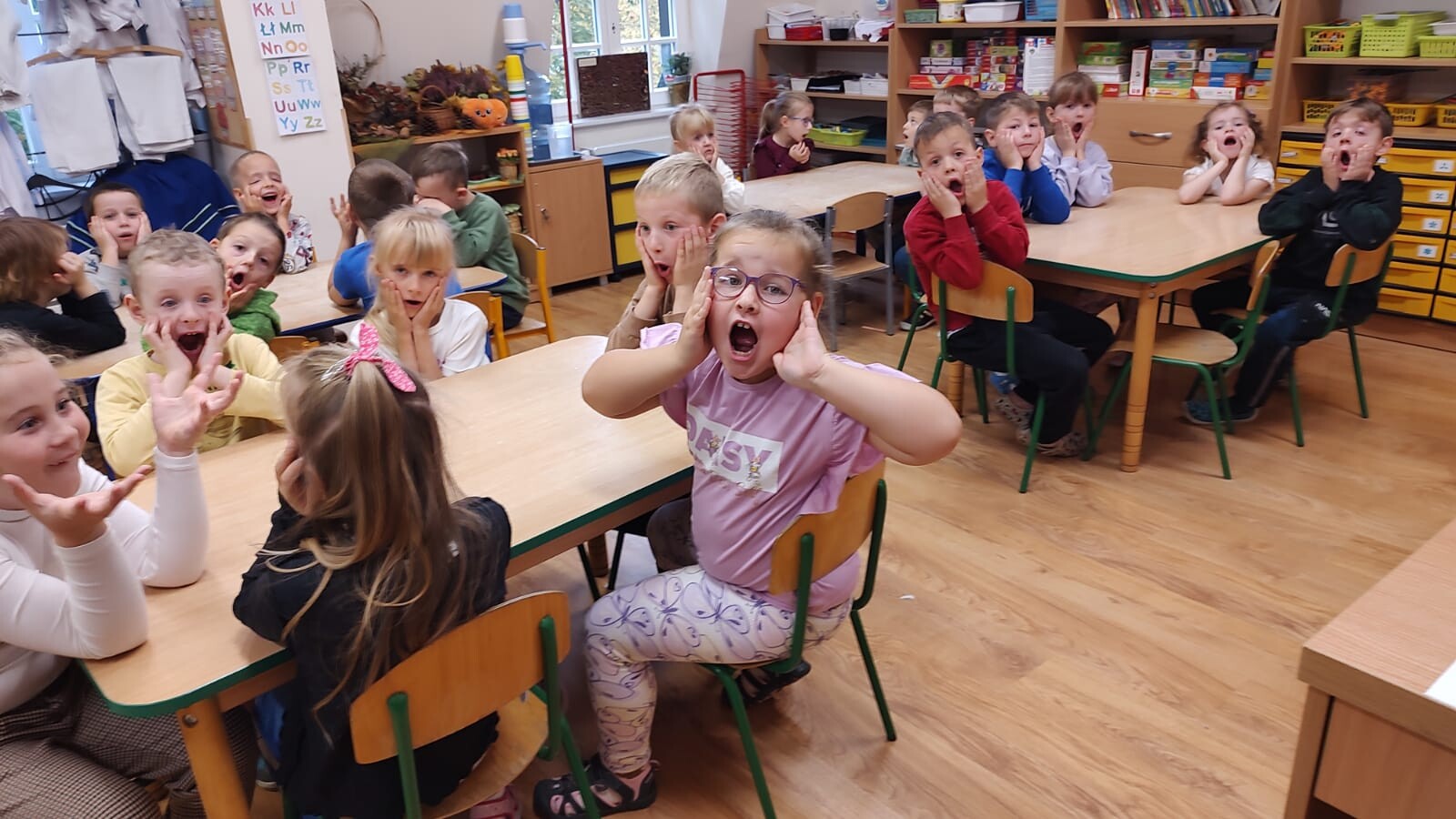 Na początku zajęć przedszkolaki wysłuchały opowiadania o Panu Łału, a następnie rozmawiały o sytuacjach, w których mogą się zdziwić. Dzieci ćwiczyły wyrażanie emocji mimiką i gestem – było przy tym mnóstwo śmiechu i spontanicznej radości.