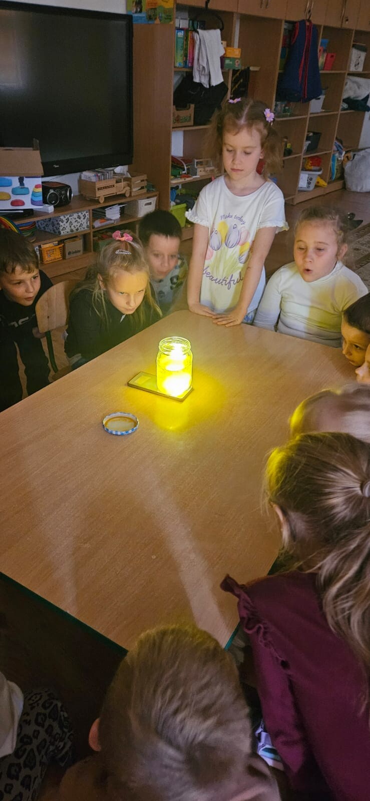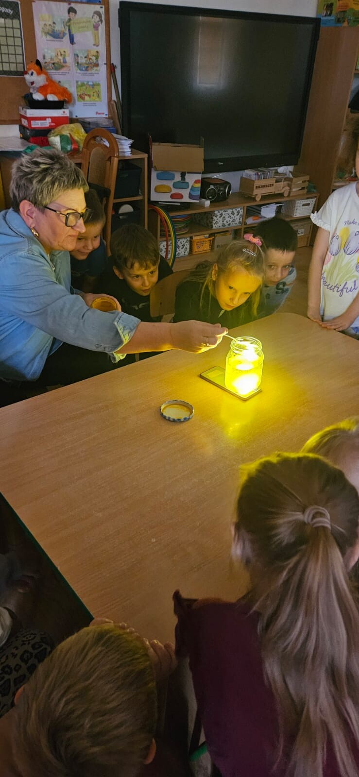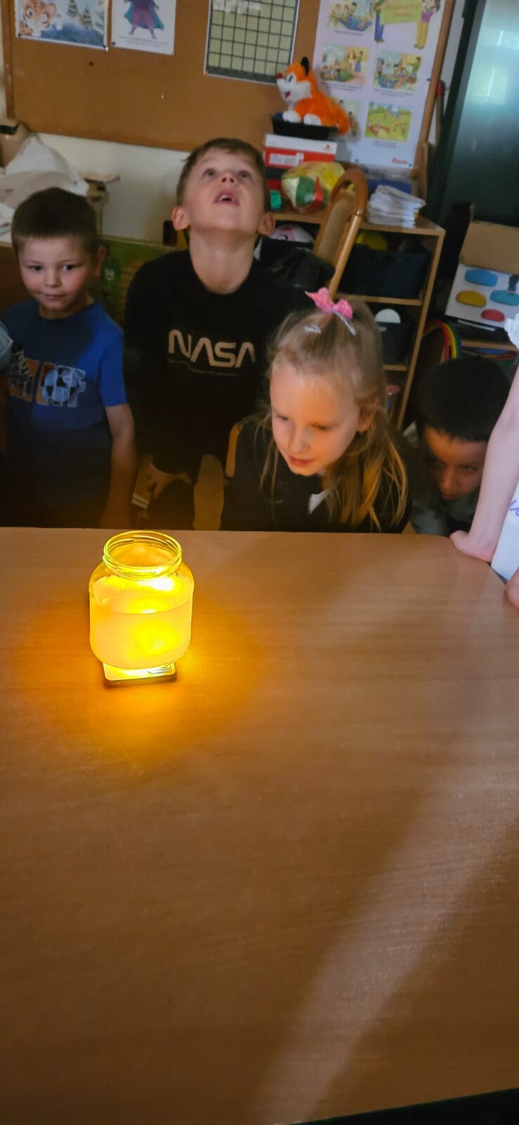 W ramach doświadczeń badawczych Tygryski uczestniczyły w zabawie „Spadające meteoryty”. Podczas eksperymentu obserwowały opadający proszek, który tworzył świetliste smugi, przypominające deszcz meteorytów i spadające gwiazdy. Widok ten wywołał w dzieciach zachwyt, ciekawość i prawdziwe zdziwienie. Przedszkolaki dzieliły się swoimi spostrzeżeniami i wrażeniami, rozwijając umiejętność obserwacji i formułowania własnych wniosków.
