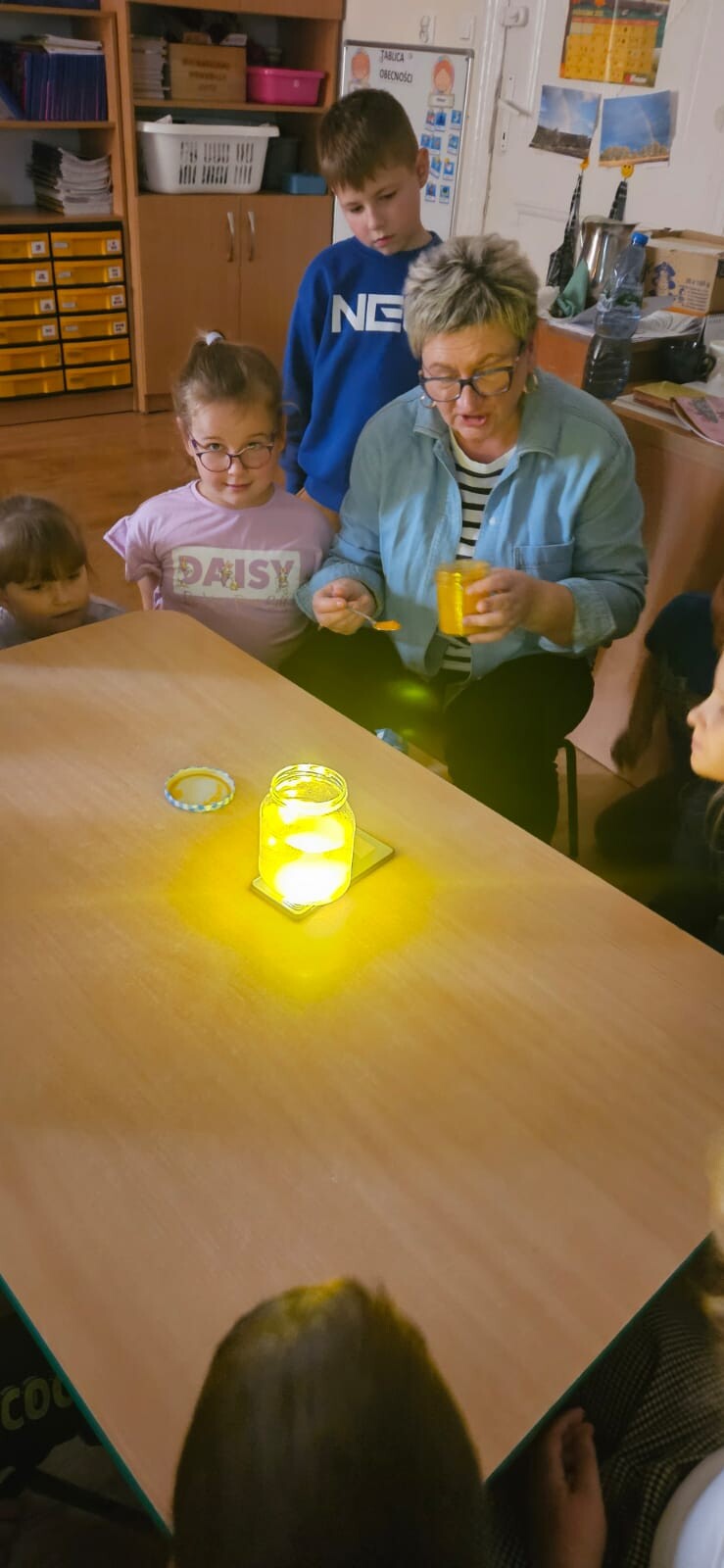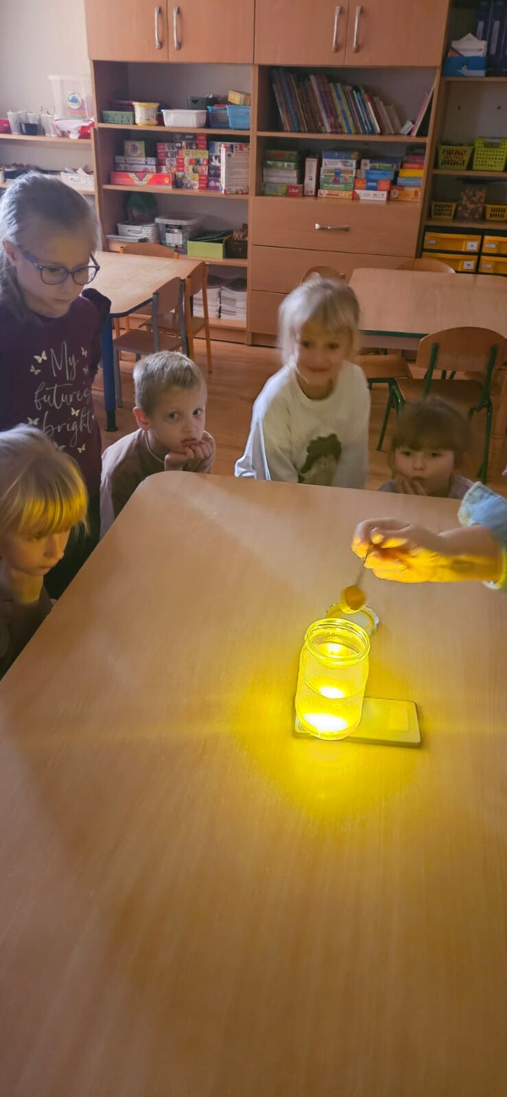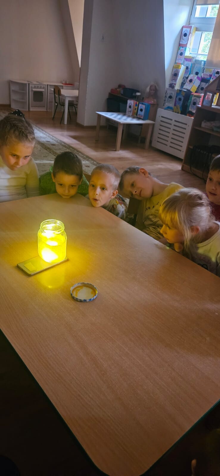 W ramach doświadczeń badawczych Tygryski uczestniczyły w zabawie „Spadające meteoryty”. Podczas eksperymentu obserwowały opadający proszek, który tworzył świetliste smugi, przypominające deszcz meteorytów i spadające gwiazdy. Widok ten wywołał w dzieciach zachwyt, ciekawość i prawdziwe zdziwienie. Przedszkolaki dzieliły się swoimi spostrzeżeniami i wrażeniami, rozwijając umiejętność obserwacji i formułowania własnych wniosków.