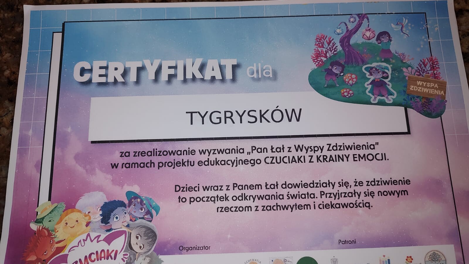 Dzieci z grupy Tygryski wzięły udział w kolejnym etapie projektu edukacyjnego „Czuciaki z krainy Emocji”. Tym razem odwiedziły Wyspę Zdziwienia, na której mieszka Pan Łał – Czuciak uczący, że zdziwienie to emocja pojawiająca się, gdy spotykamy coś nowego, nieznanego i niezwykłego.