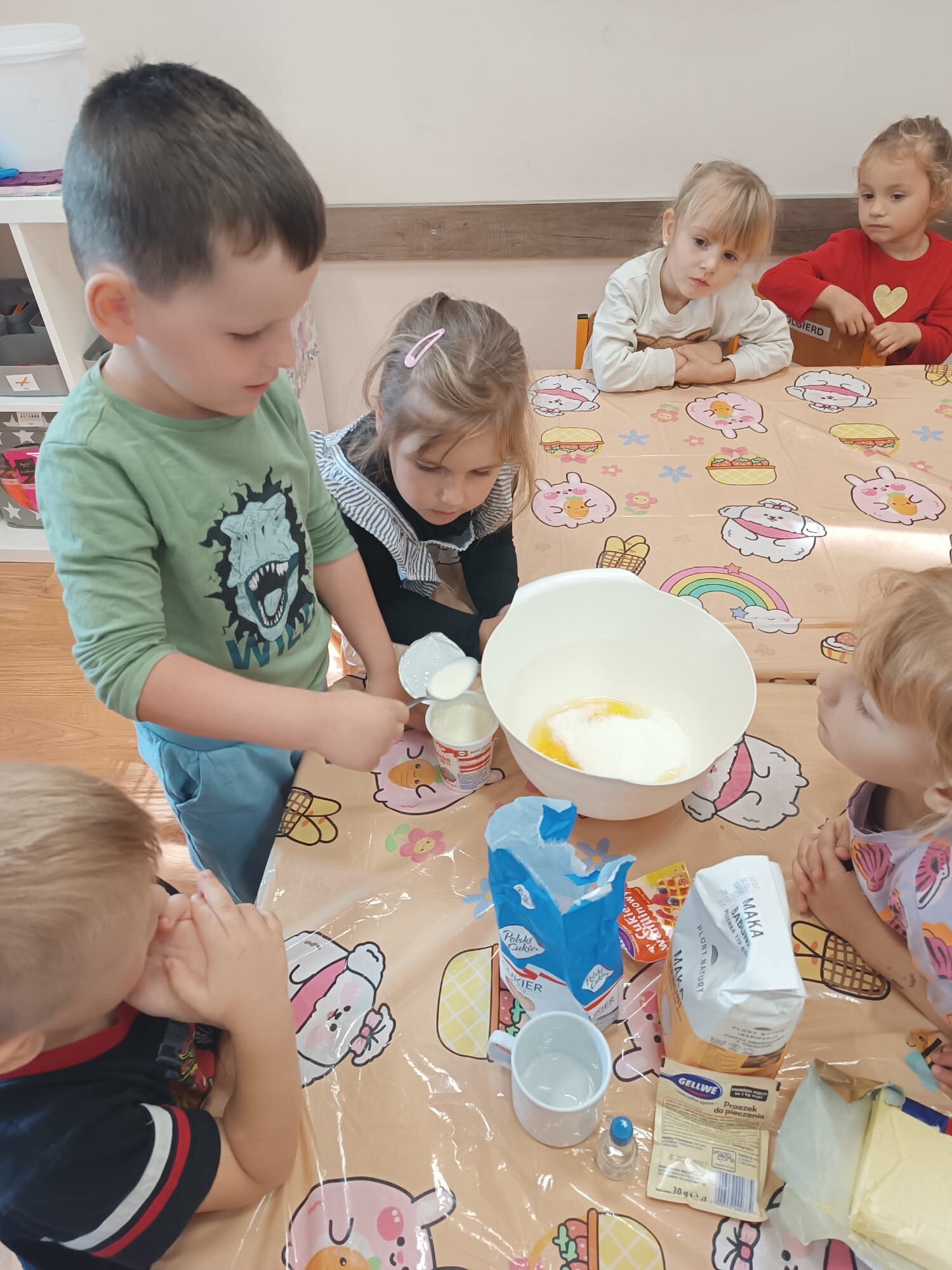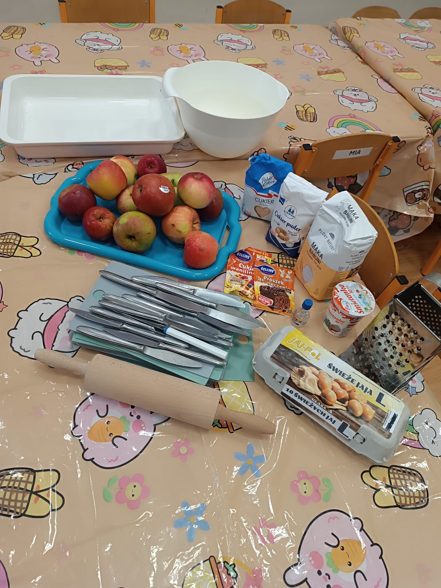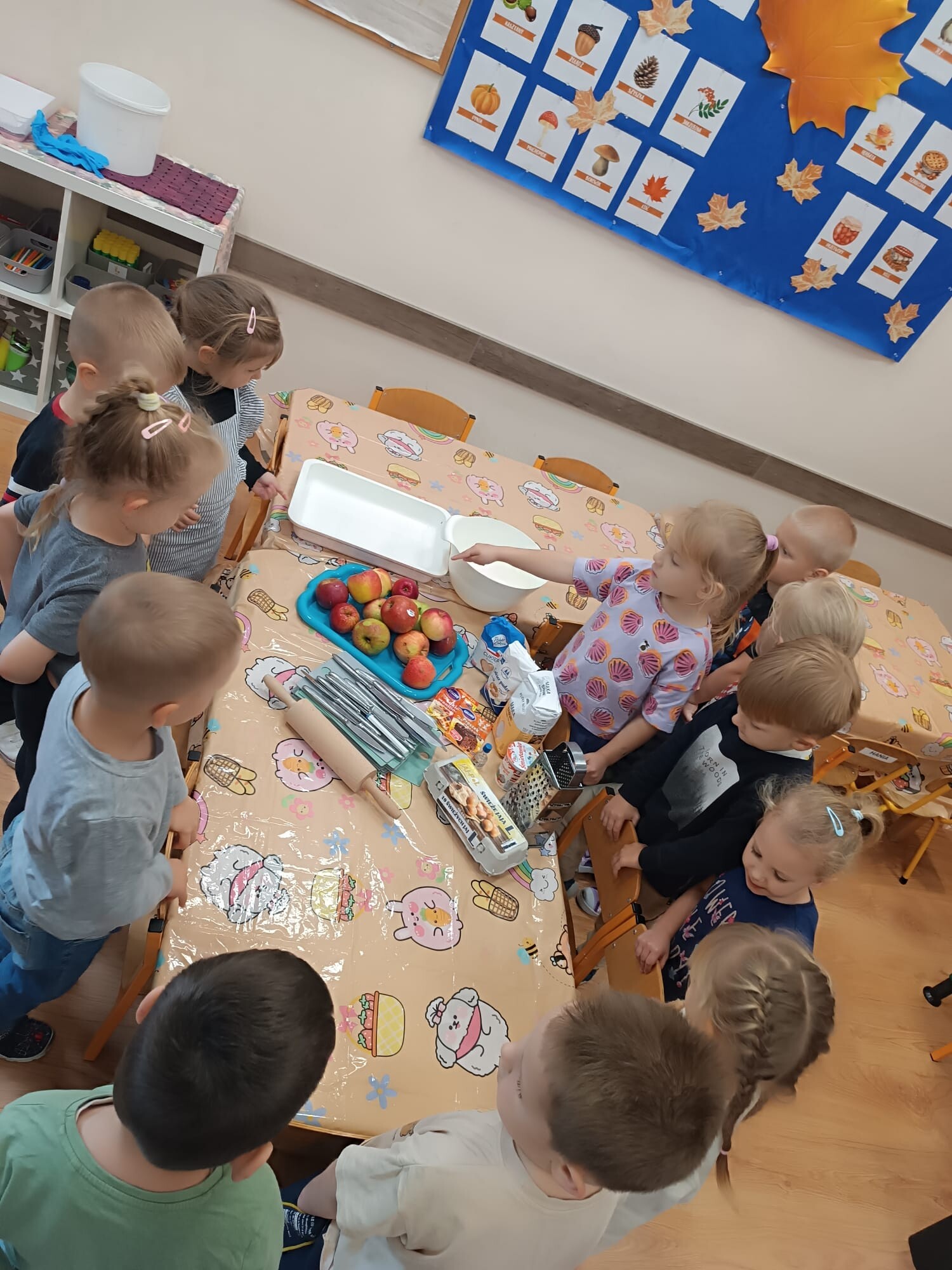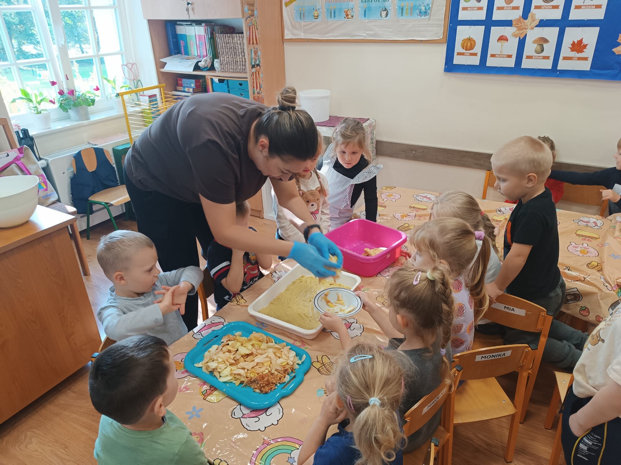 Kolejnym etapem było kulinarne wyzwanie – przygotowanie szarlotki. Dzieci krok po kroku uczyły się, jak należy kroić jabłka, a później wspólnie wsypywały wszystkie potrzebne składniki. Z wielką cierpliwością obserwowały ciasto piekące się w piekarniku, z którego unosił się coraz piękniejszy zapach.