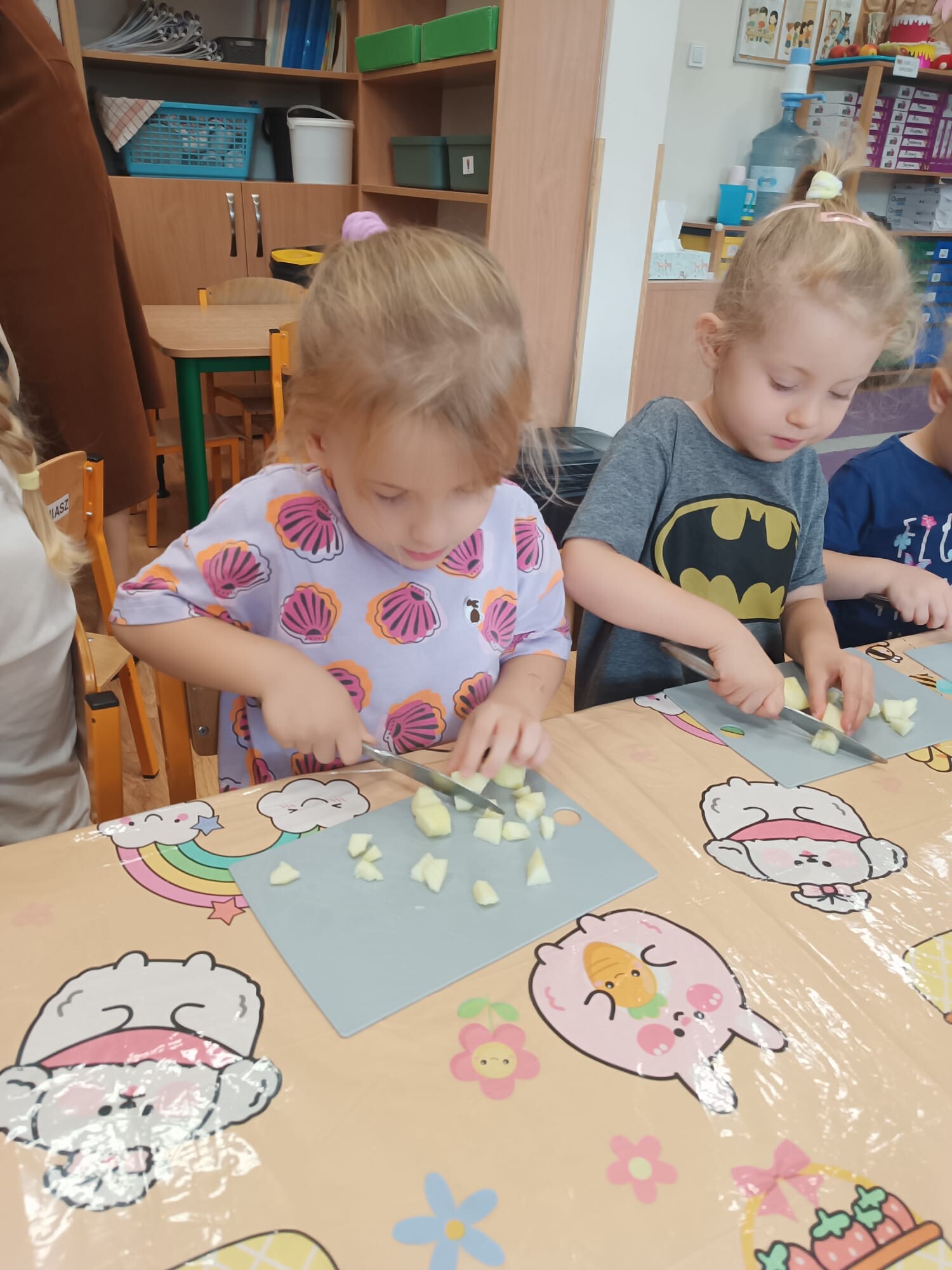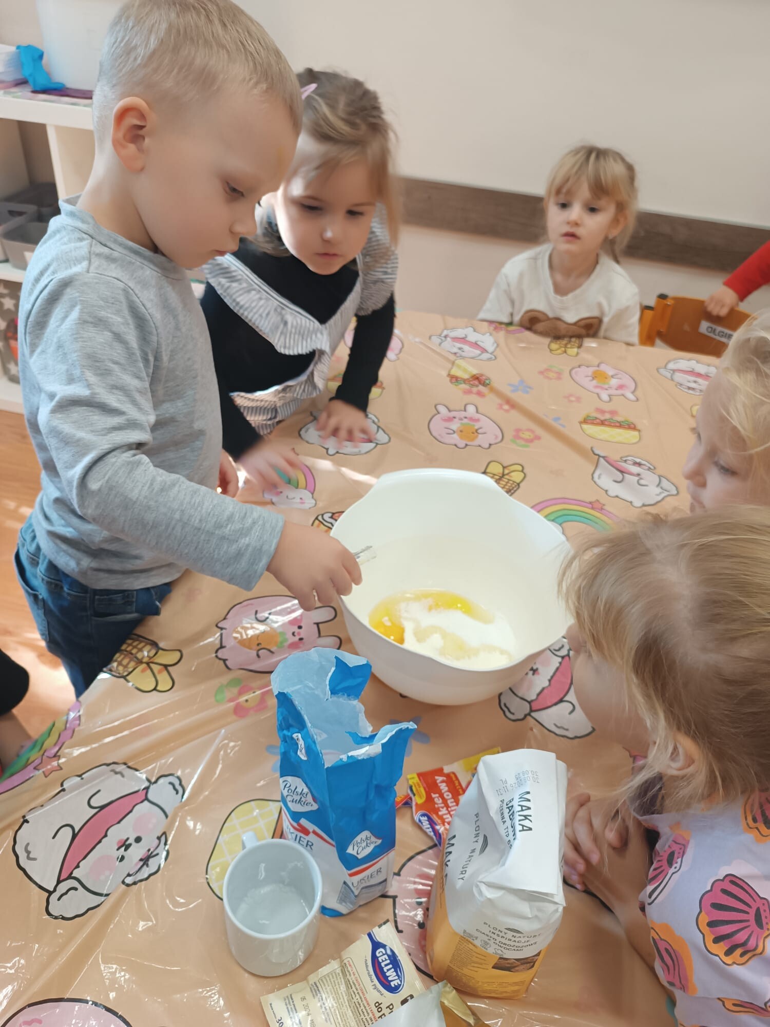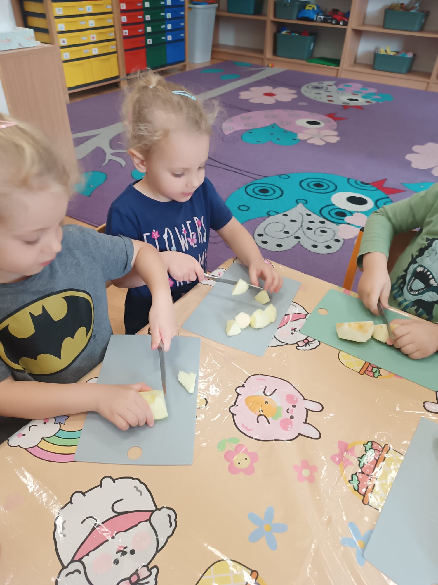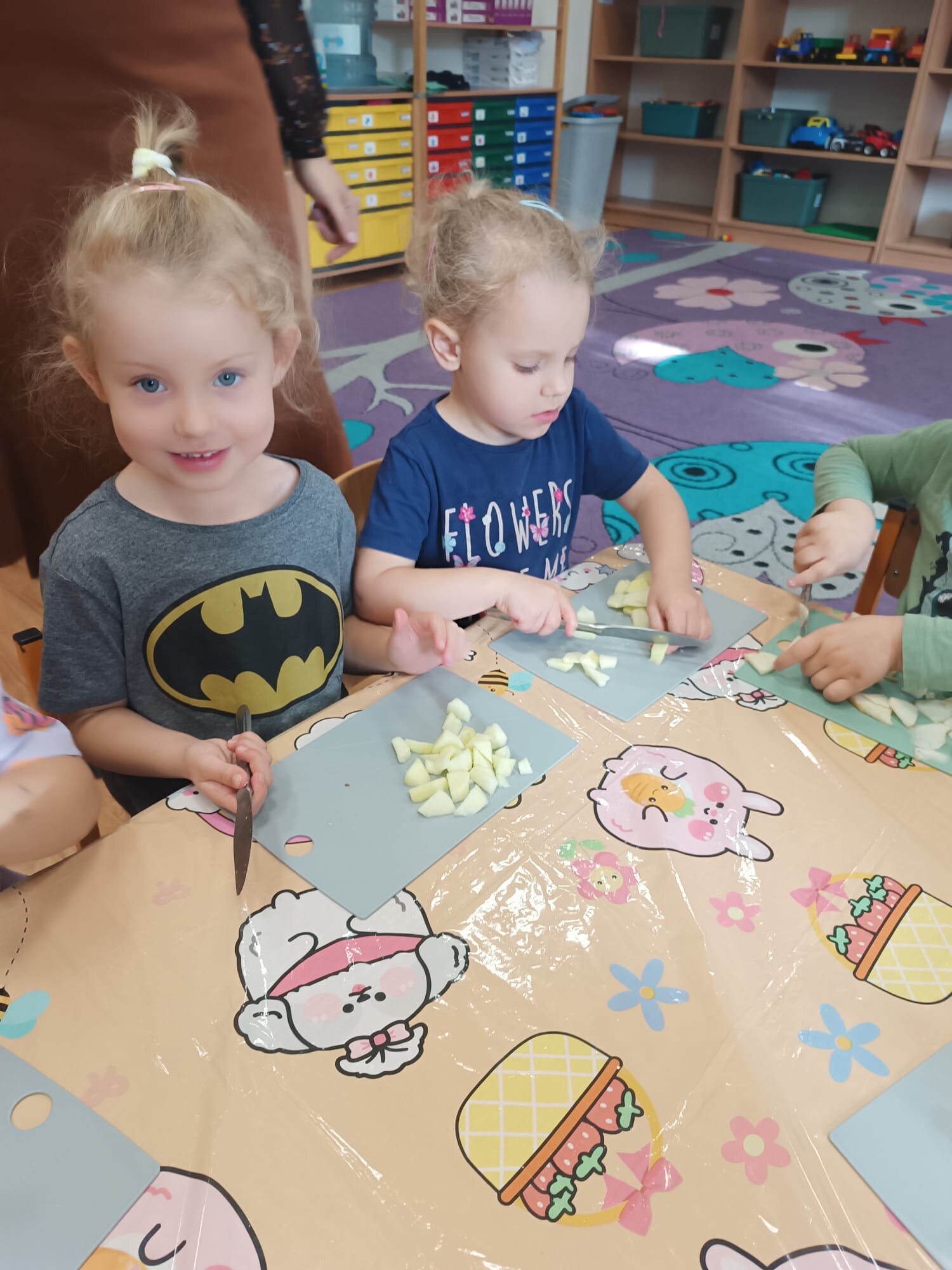 Kolejnym etapem było kulinarne wyzwanie – przygotowanie szarlotki. Dzieci krok po kroku uczyły się, jak należy kroić jabłka, a później wspólnie wsypywały wszystkie potrzebne składniki. Z wielką cierpliwością obserwowały ciasto piekące się w piekarniku, z którego unosił się coraz piękniejszy zapach.