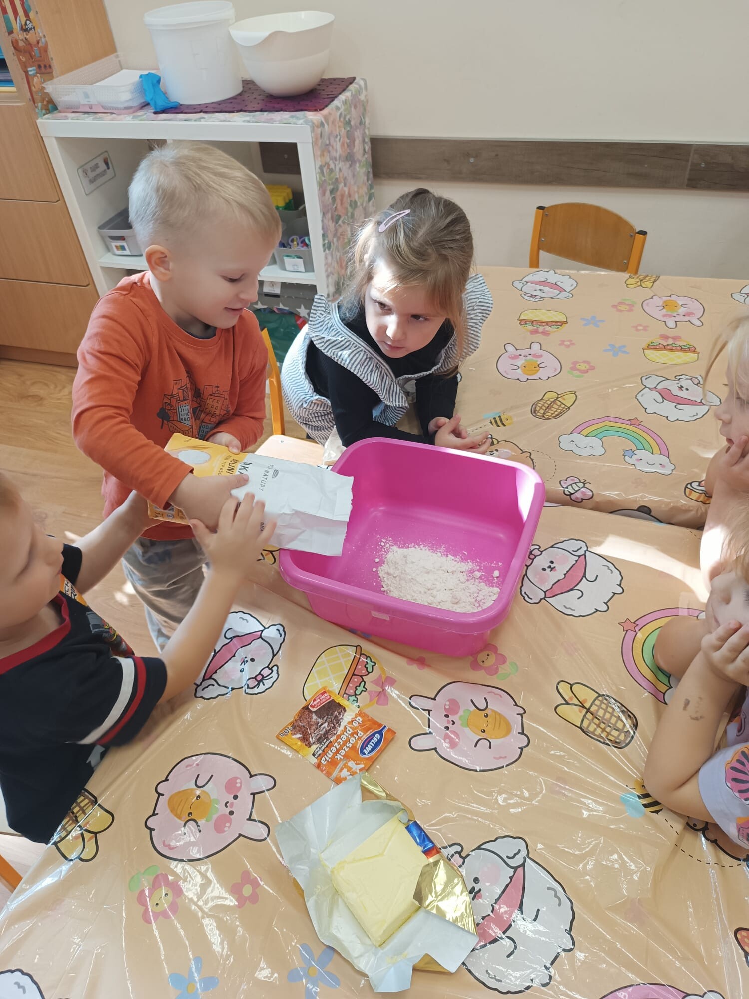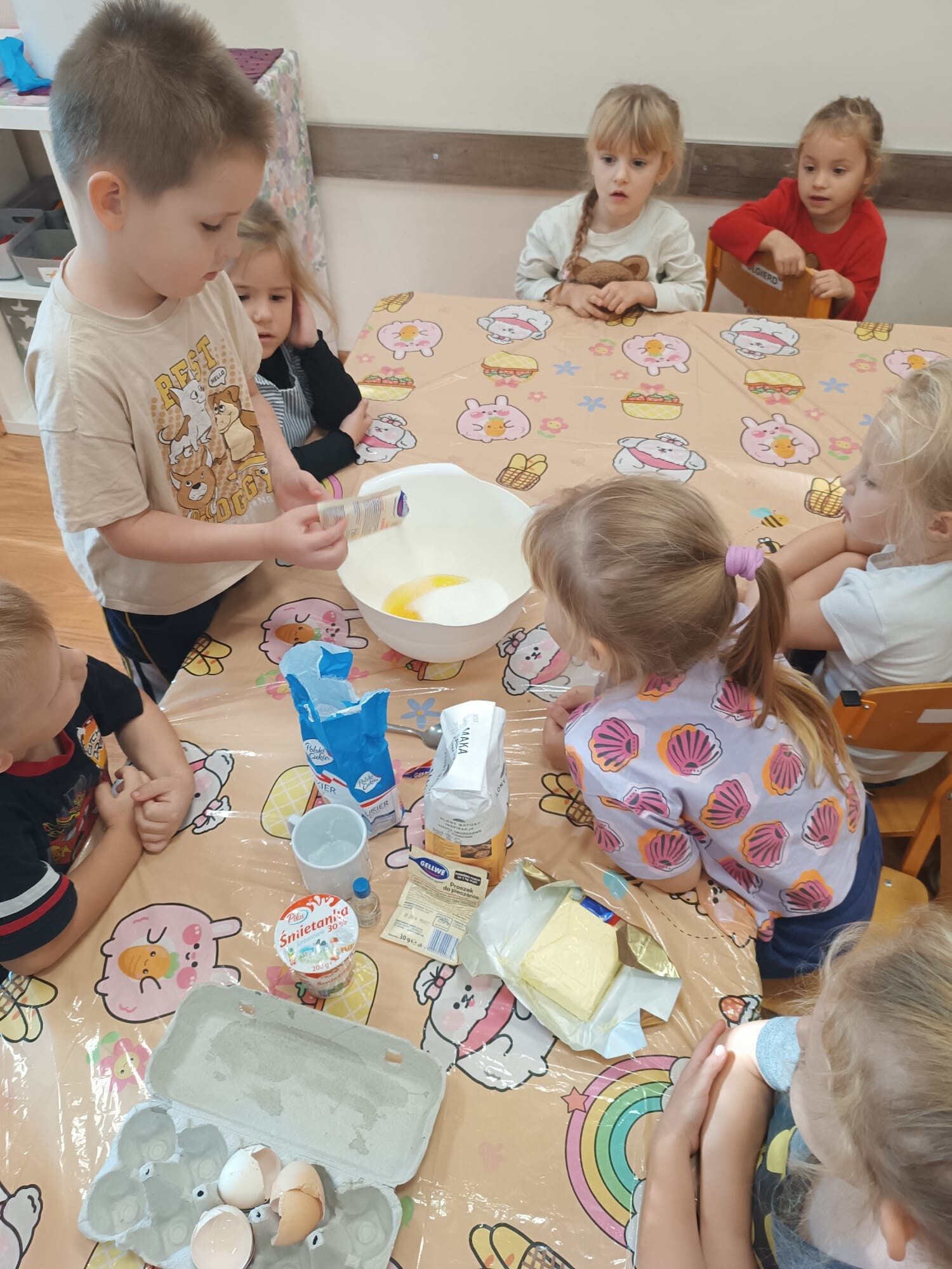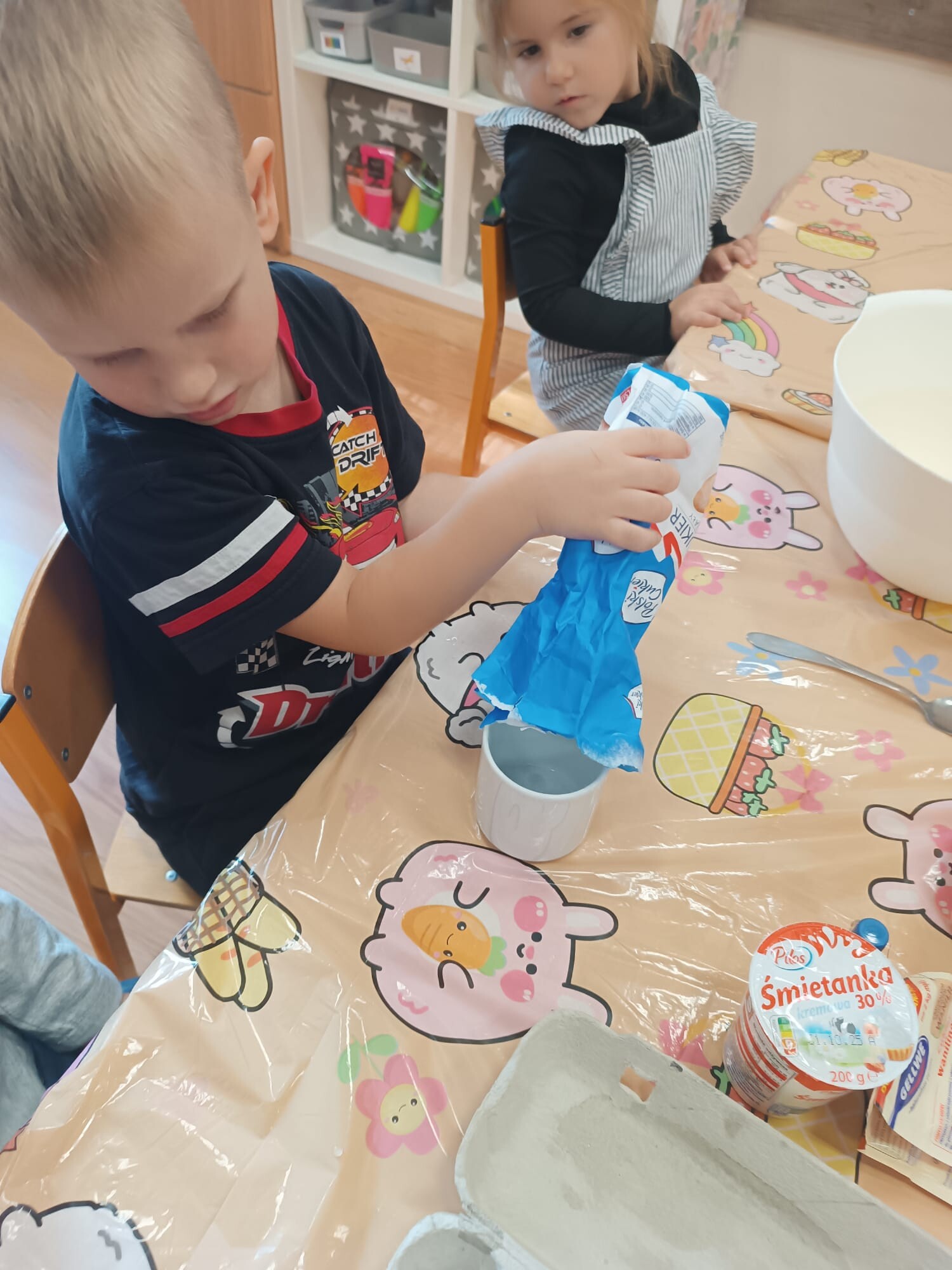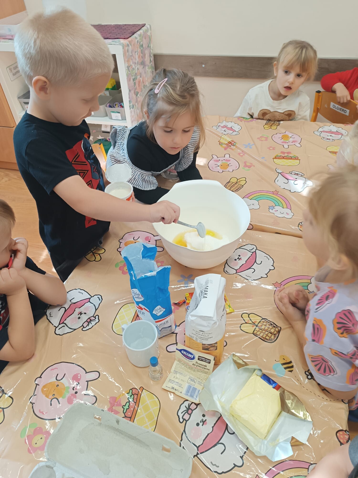 Kolejnym etapem było kulinarne wyzwanie – przygotowanie szarlotki. Dzieci krok po kroku uczyły się, jak należy kroić jabłka, a później wspólnie wsypywały wszystkie potrzebne składniki. Z wielką cierpliwością obserwowały ciasto piekące się w piekarniku, z którego unosił się coraz piękniejszy zapach.