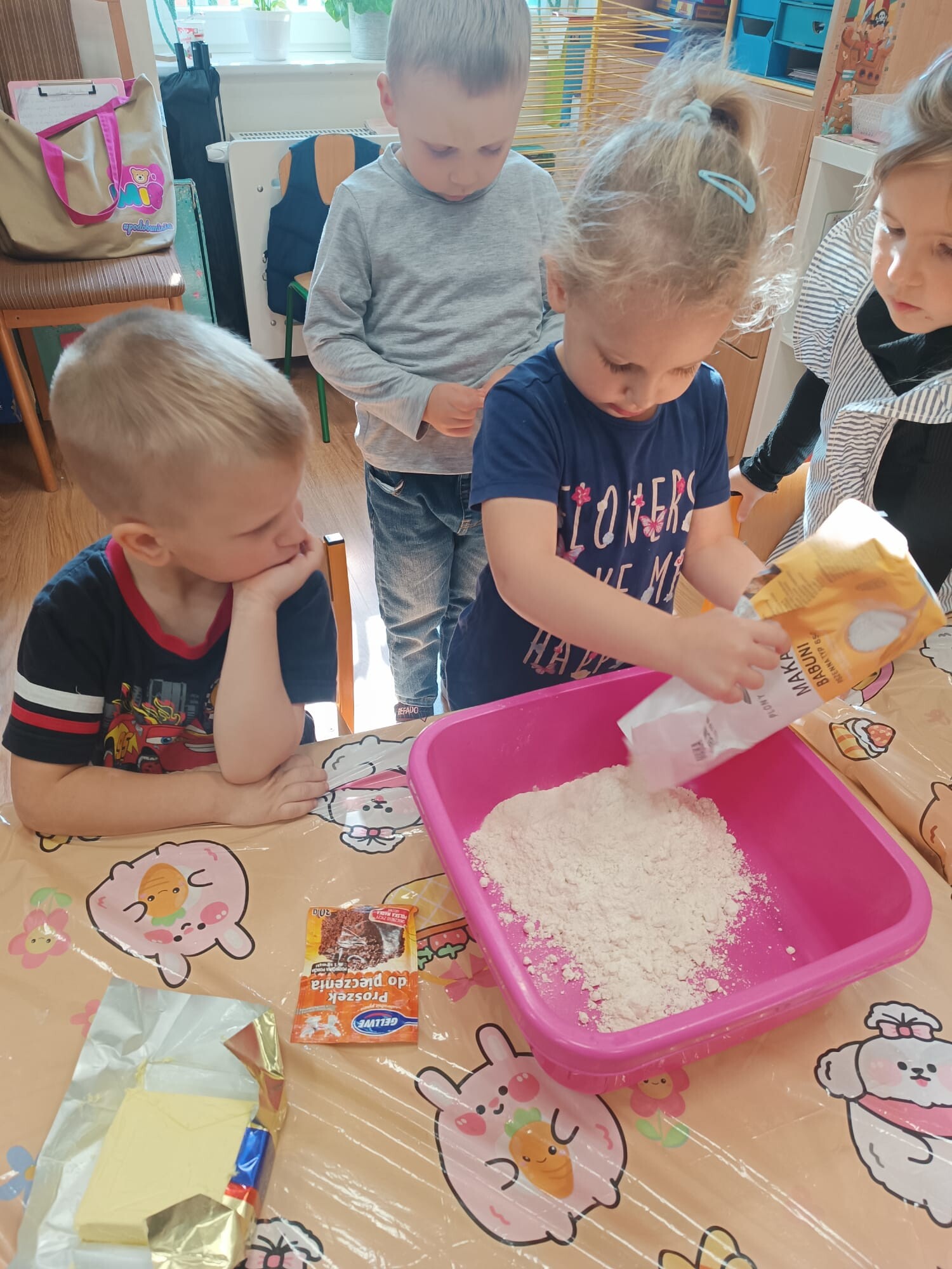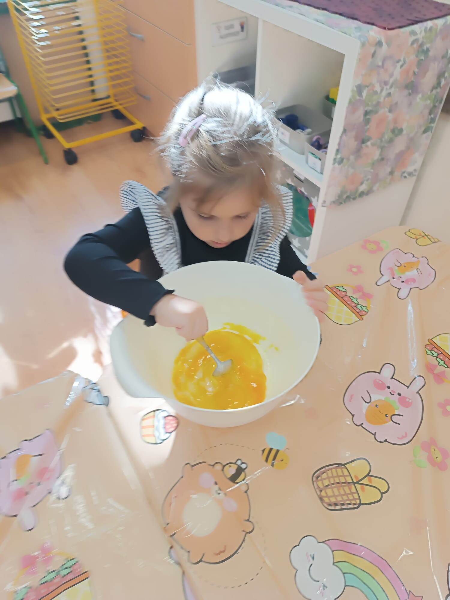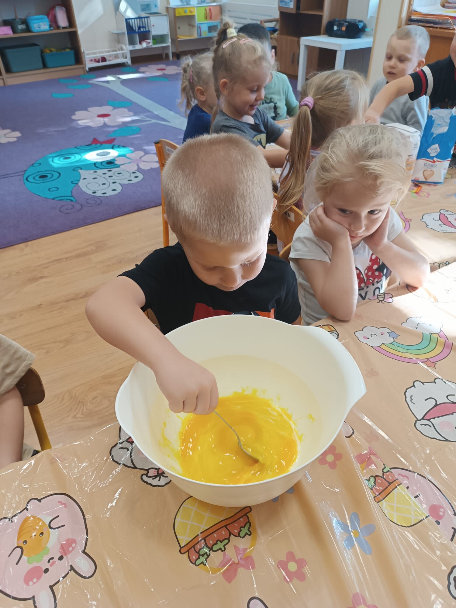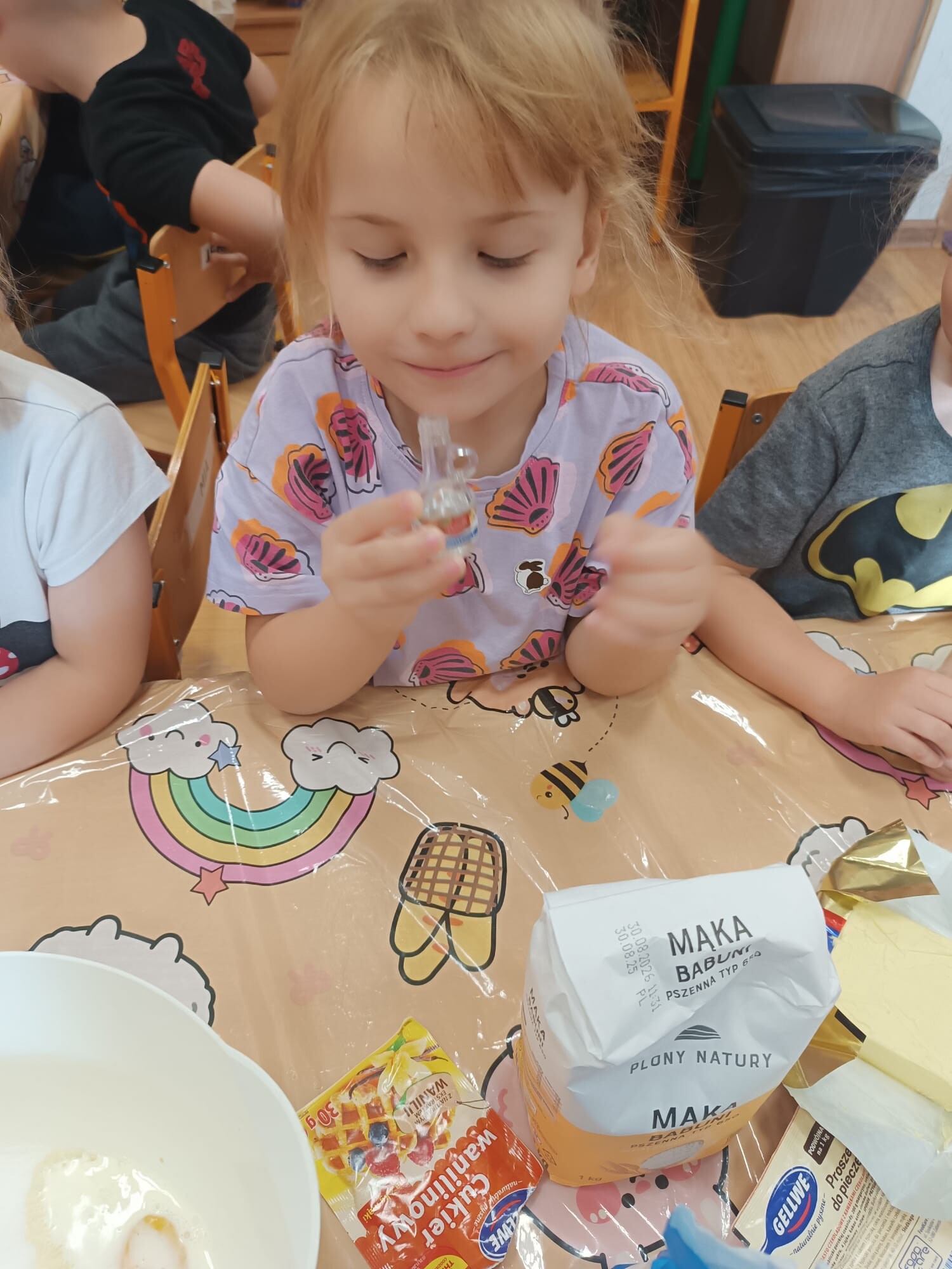 Kolejnym etapem było kulinarne wyzwanie – przygotowanie szarlotki. Dzieci krok po kroku uczyły się, jak należy kroić jabłka, a później wspólnie wsypywały wszystkie potrzebne składniki. Z wielką cierpliwością obserwowały ciasto piekące się w piekarniku, z którego unosił się coraz piękniejszy zapach.