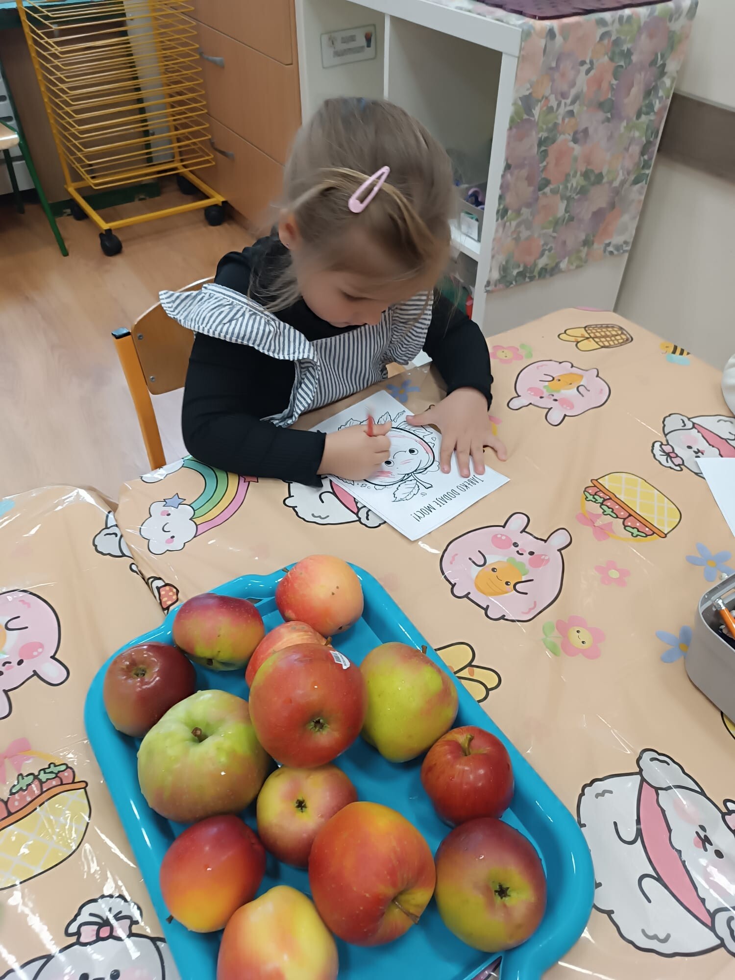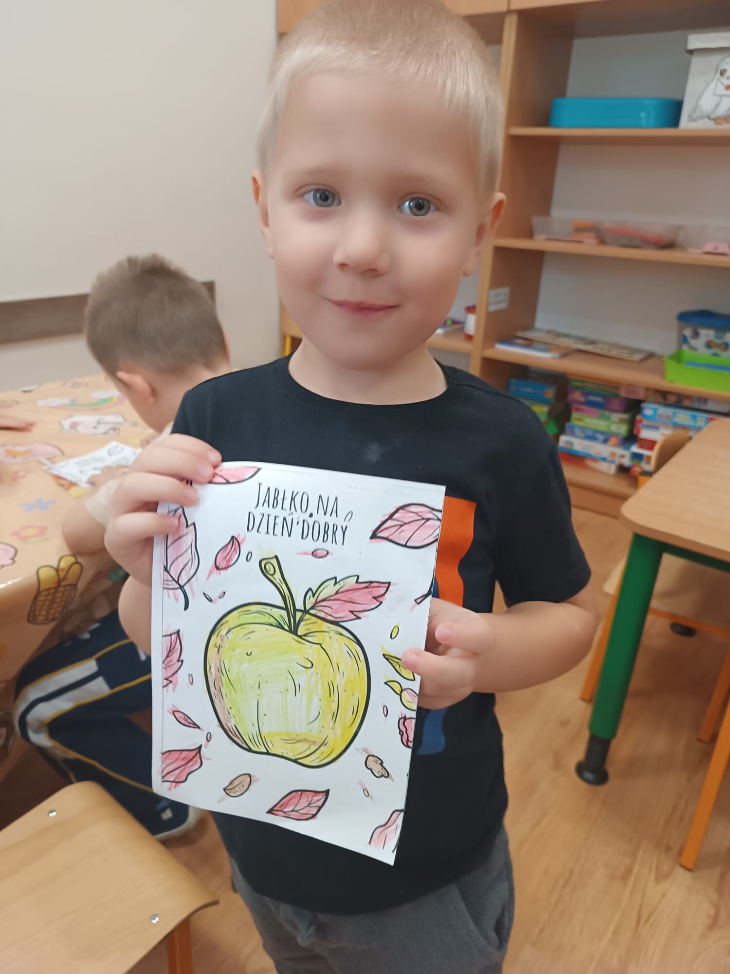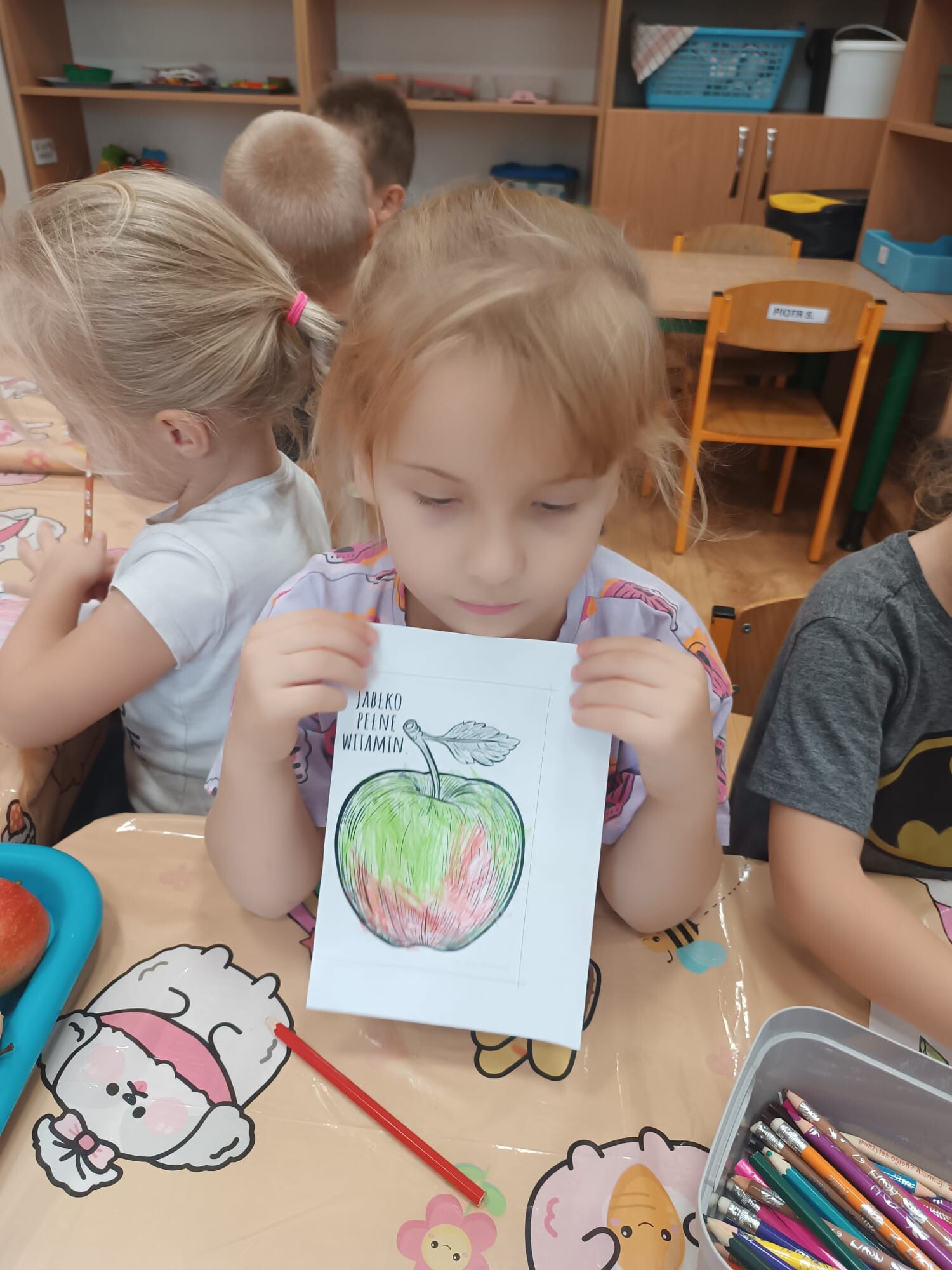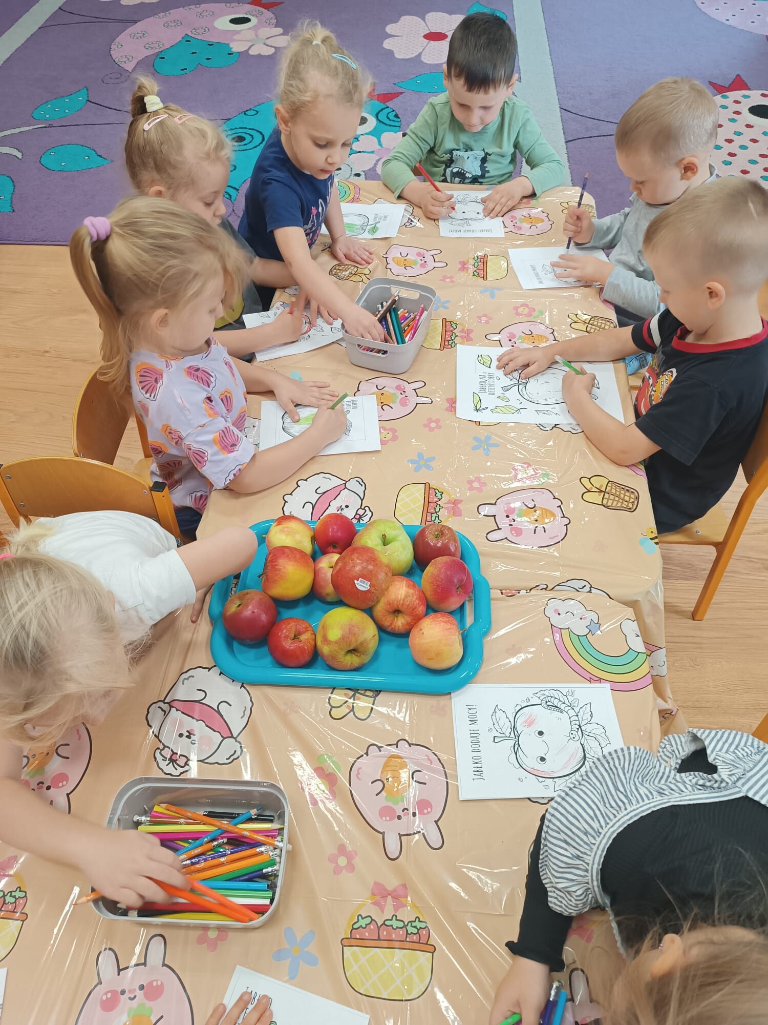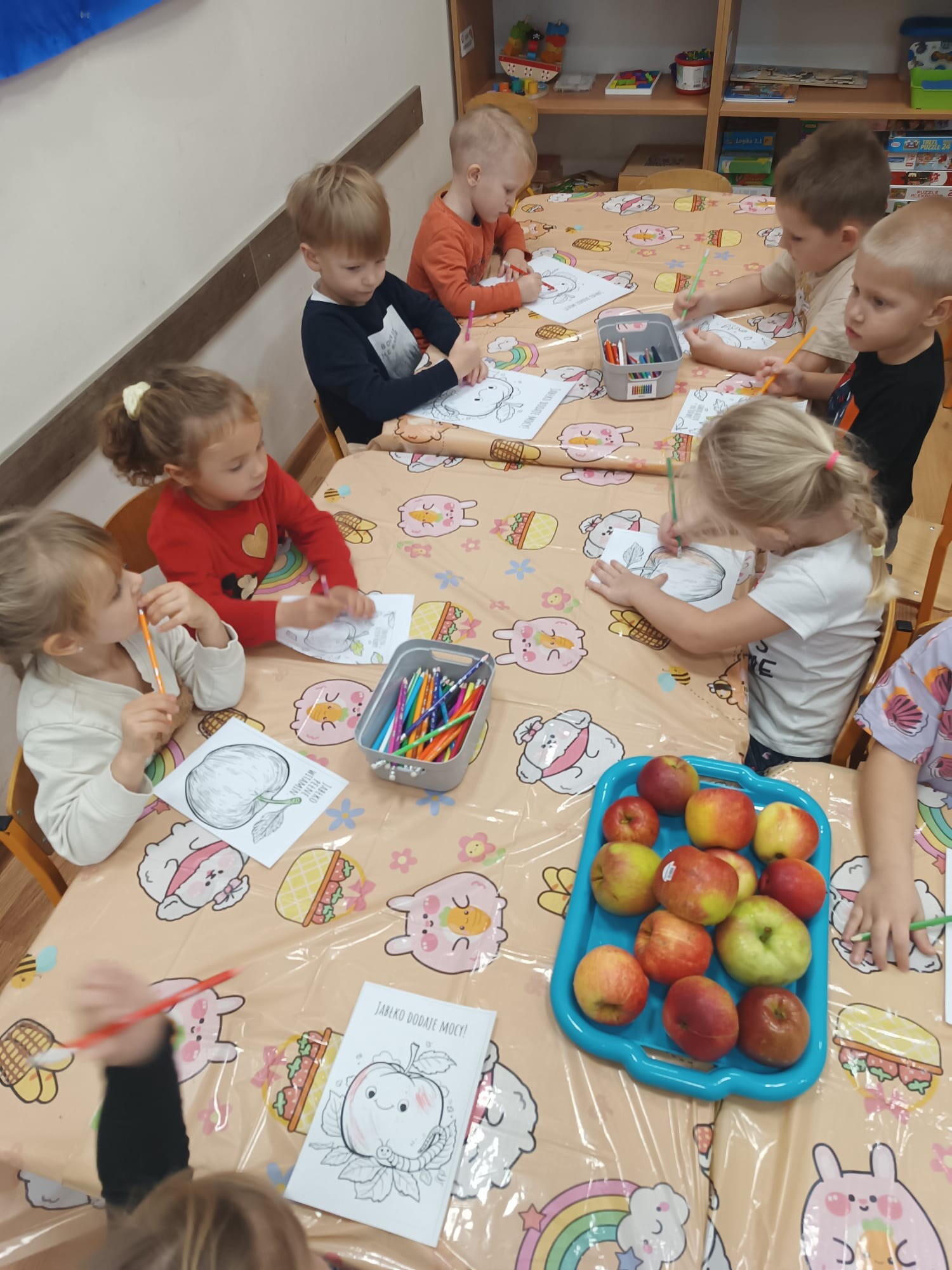1 października dzieci z grupy Kangurki obchodziły Dzień Jabłka. Rozpoczęły go od poznania historii tego niezwykłego owocu – dowiedziały się, skąd pochodzi jabłko, dlaczego od dawna towarzyszy człowiekowi w codziennym życiu oraz wysłuchały legendy o złotym jabłku. Następnie pokolorowały przygotowane kolorowanki.