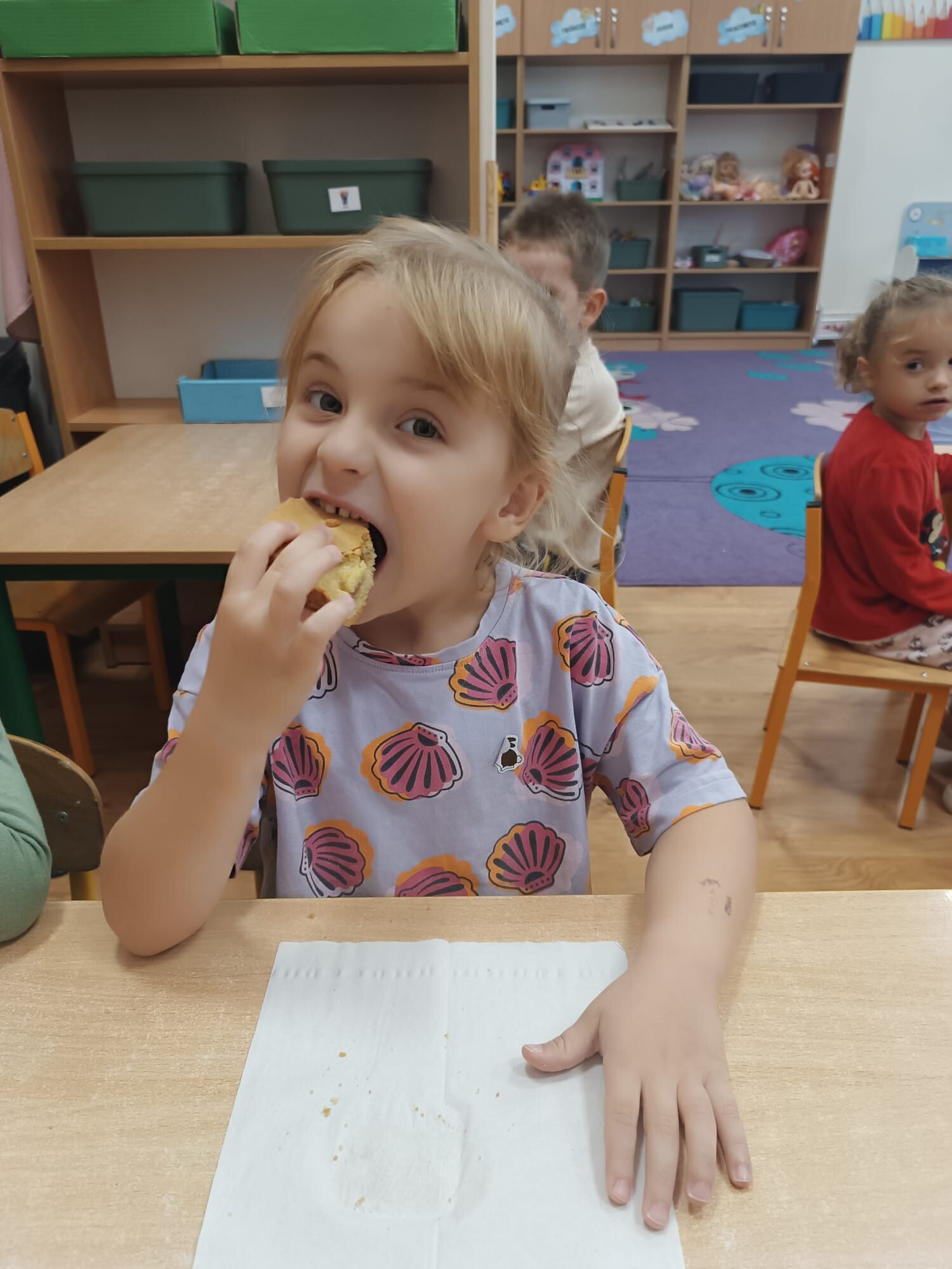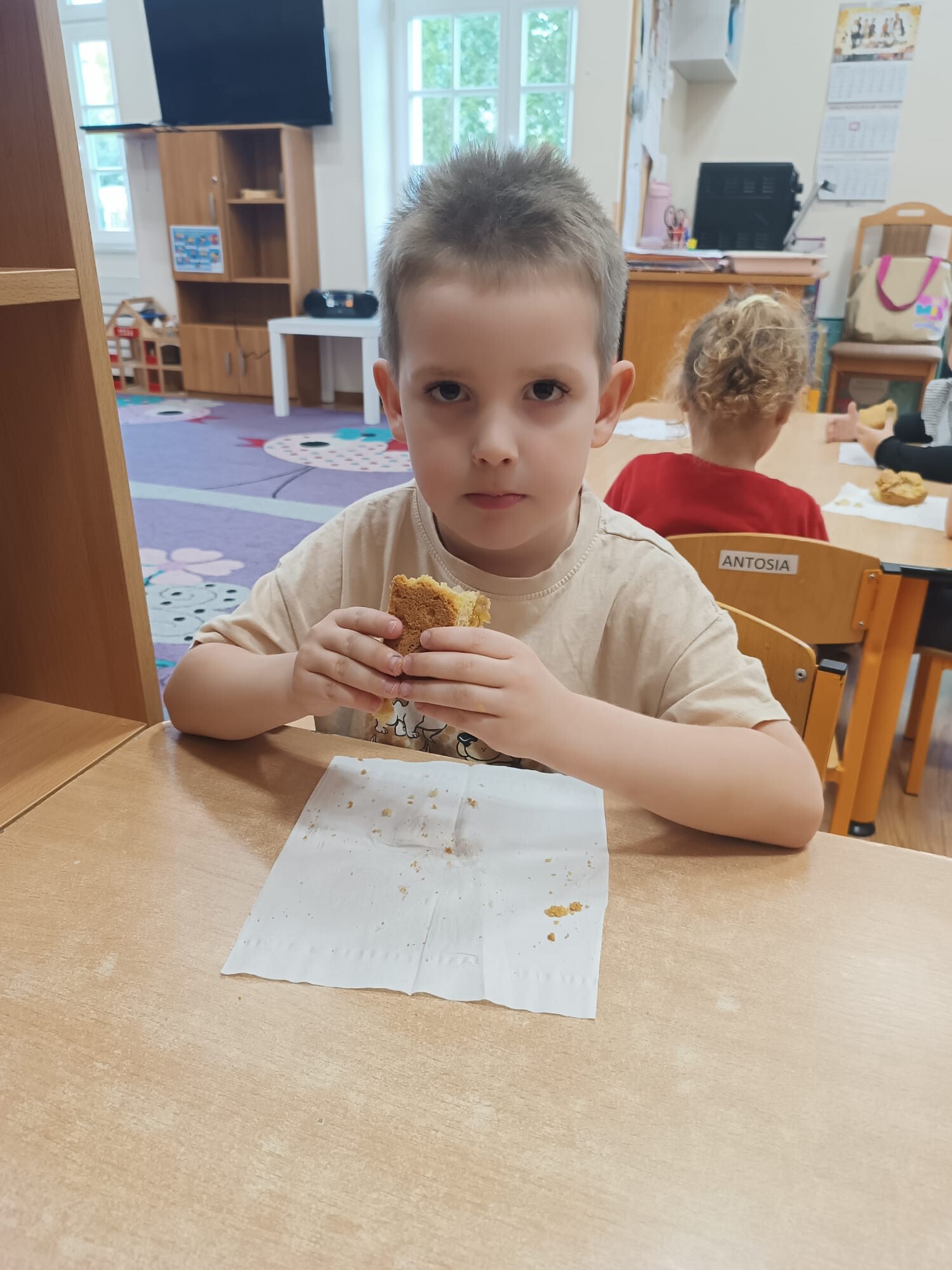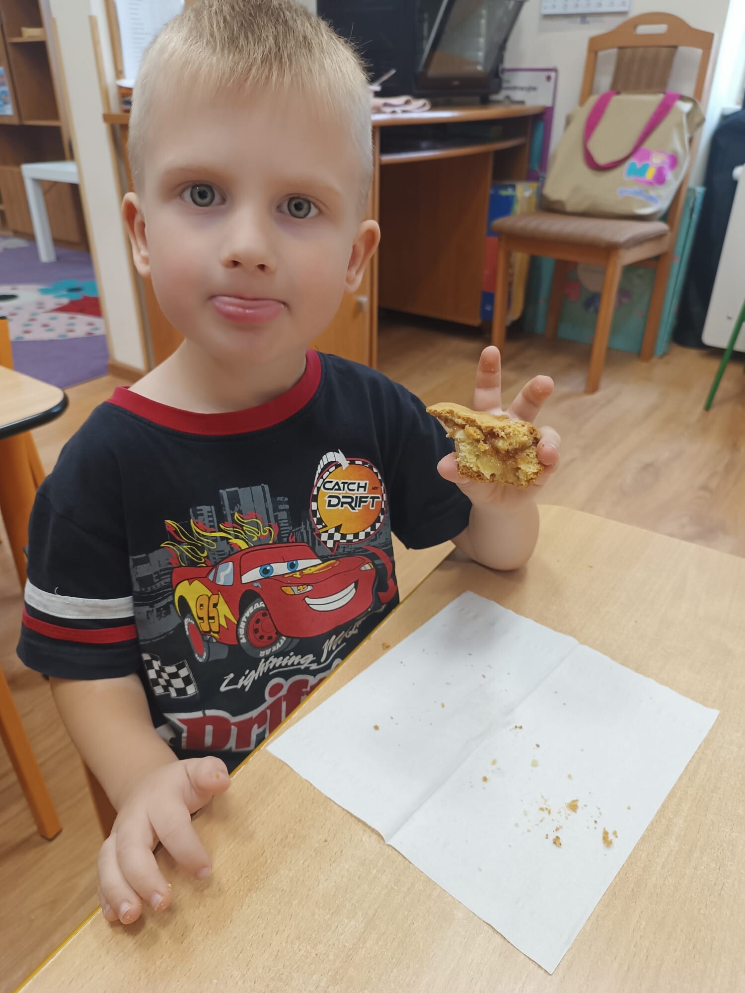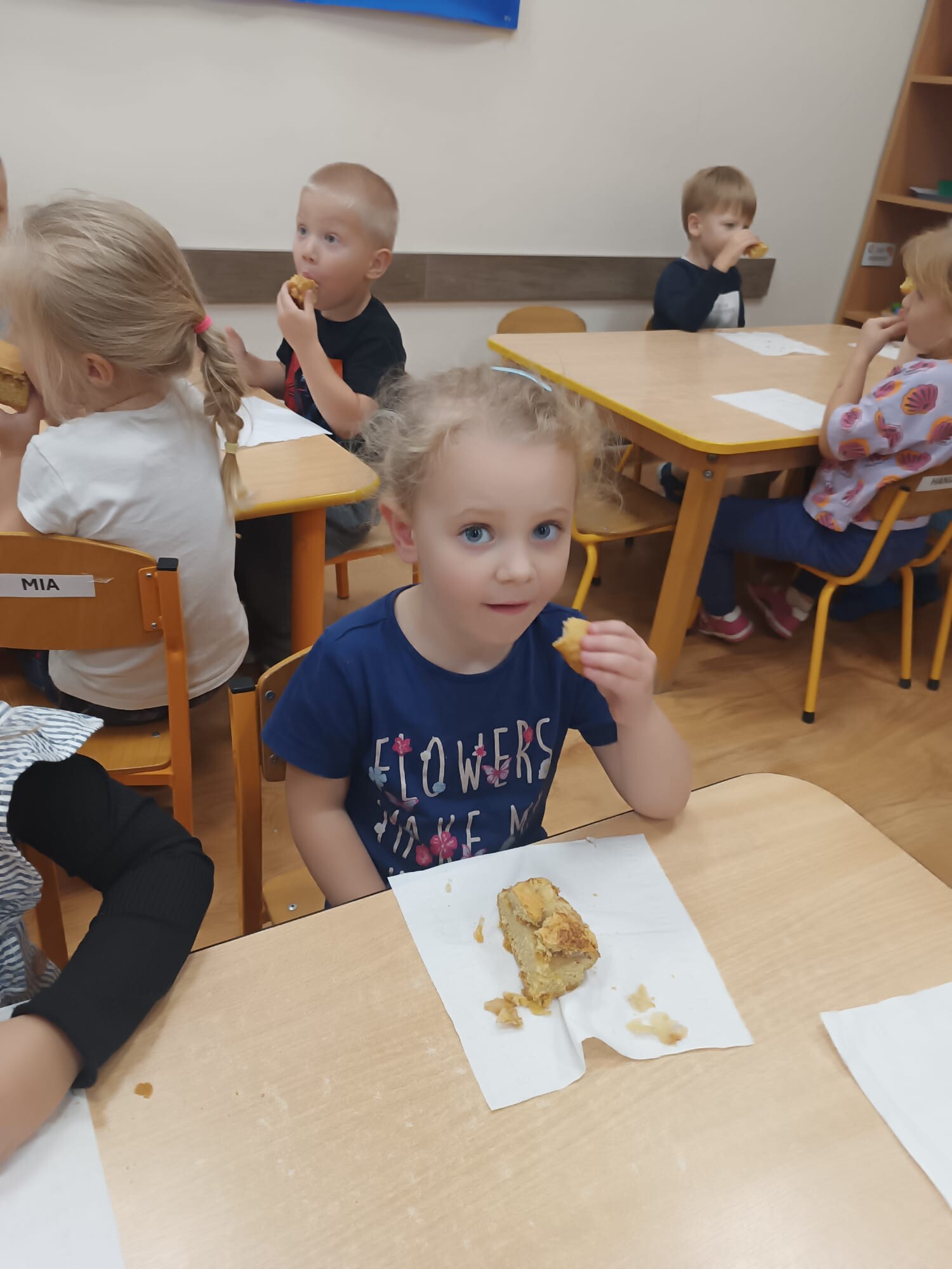 Na zakończenie święta spróbowały kawałka własnoręcznie przygotowanej szarlotki. Słodki smak stał się najlepszą nagrodą za dzień pełen nauki, zabawy i wspólnej pracy.