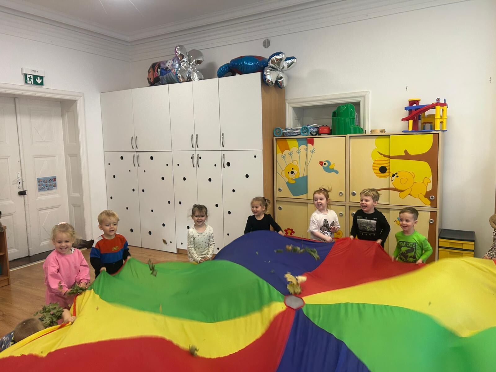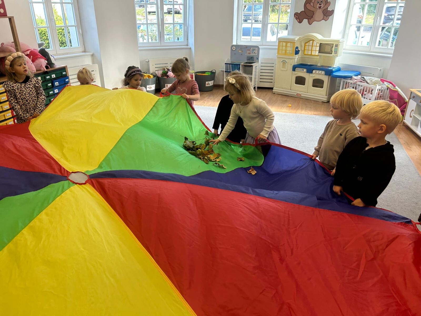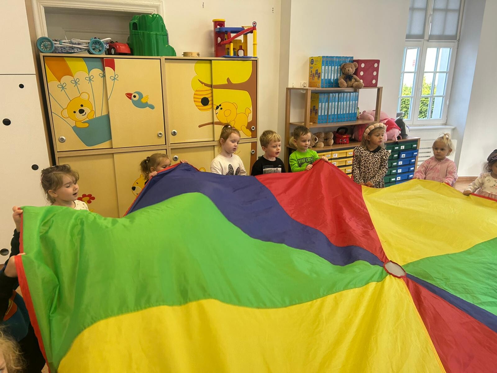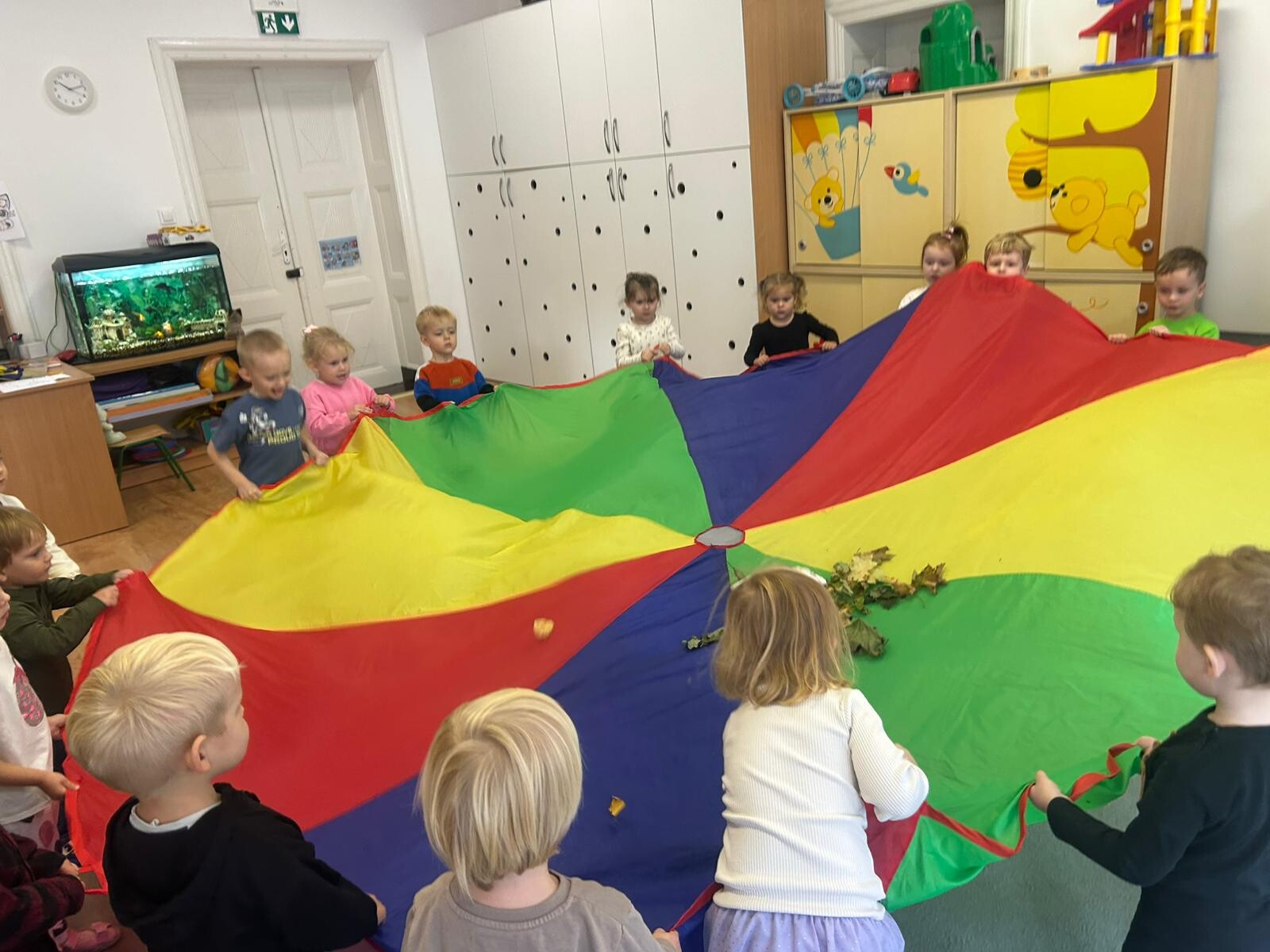 Kolejnym punktem dnia była zabawa z chustą animacyjną przy dźwiękach piosenki „Kolorowe listki”. Wspólne poruszanie chustą sprawiło, że liście wirowały nad głowami dzieci, tworząc radosną, jesienną atmosferę. Uśmiechy i śmiech towarzyszyły wszystkim uczestnikom, a rytmiczne ruchy pozwalały rozwijać koordynację i poczucie rytmu.