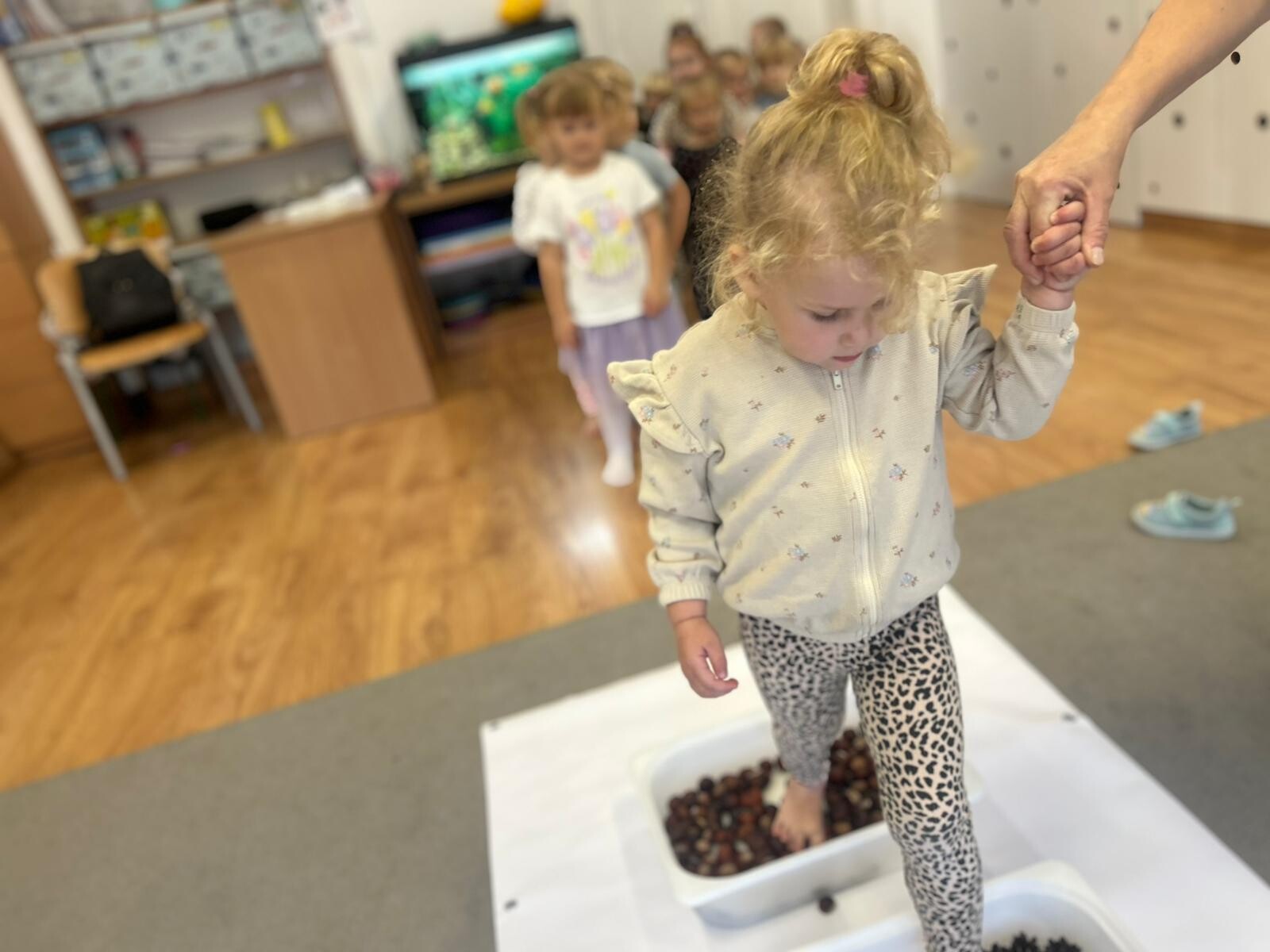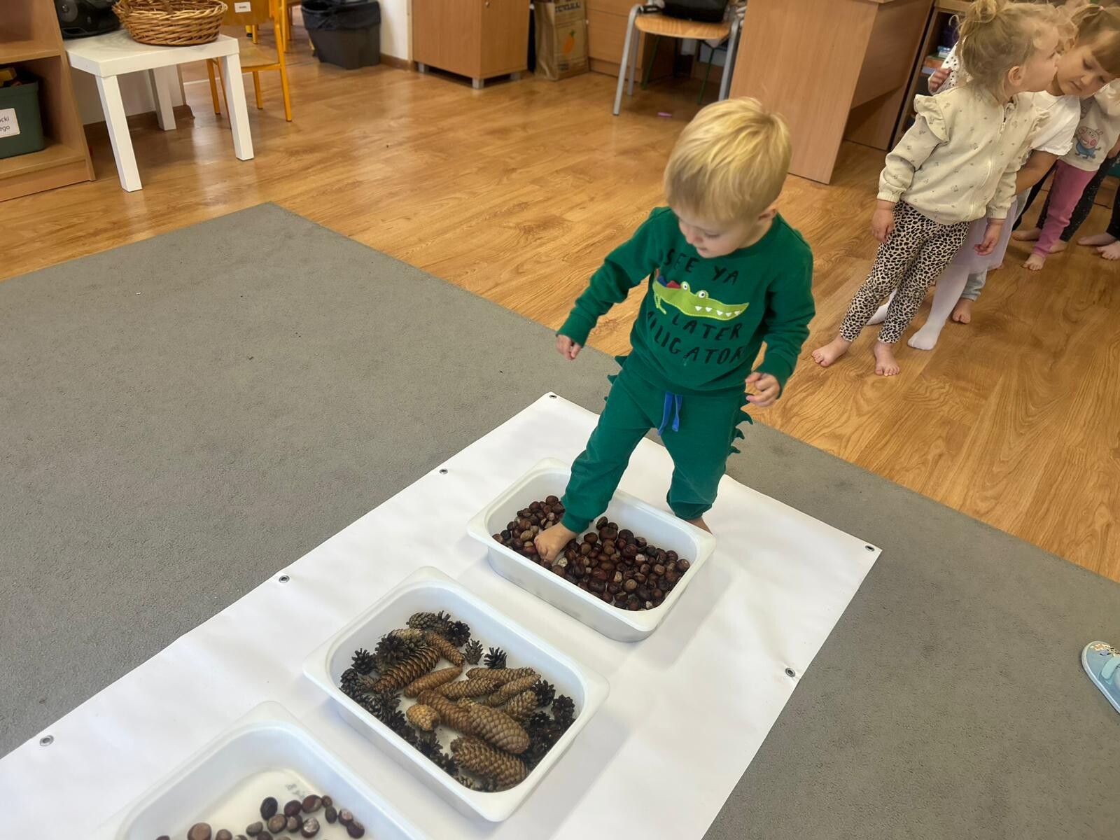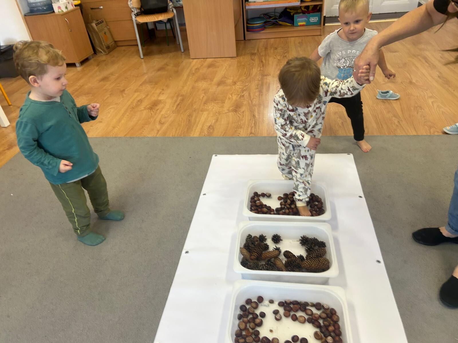 Na początek maluchy wzięły udział w jesiennym torze sensorycznym, podczas którego mogły poczuć pod swoimi stopami kasztany, żołędzie i szeleszczące, kolorowe liście. Dla wielu dzieci była to prawdziwa przygoda – różnorodne faktury i dźwięki budziły ciekawość i zachęcały do eksperymentowania.