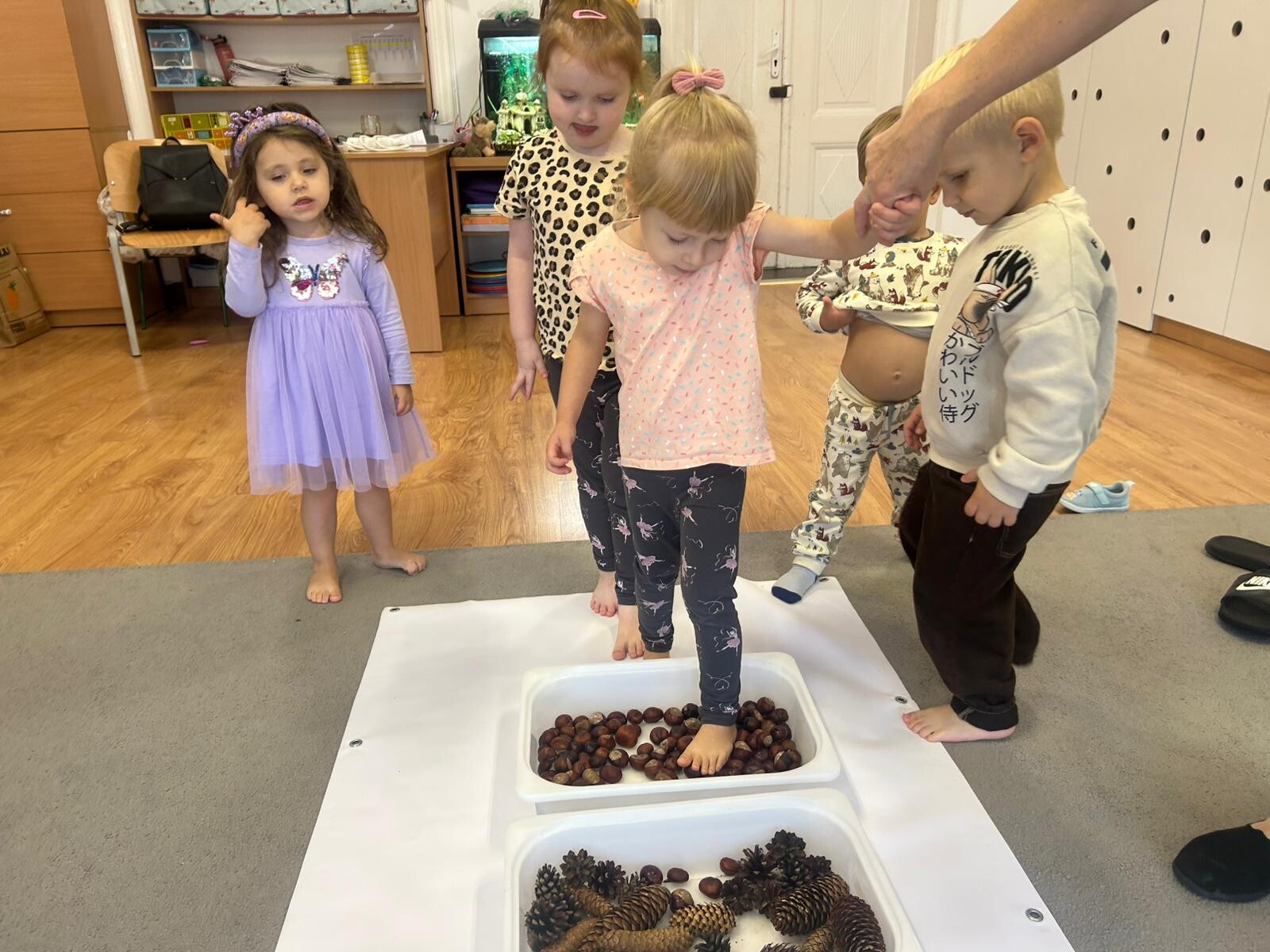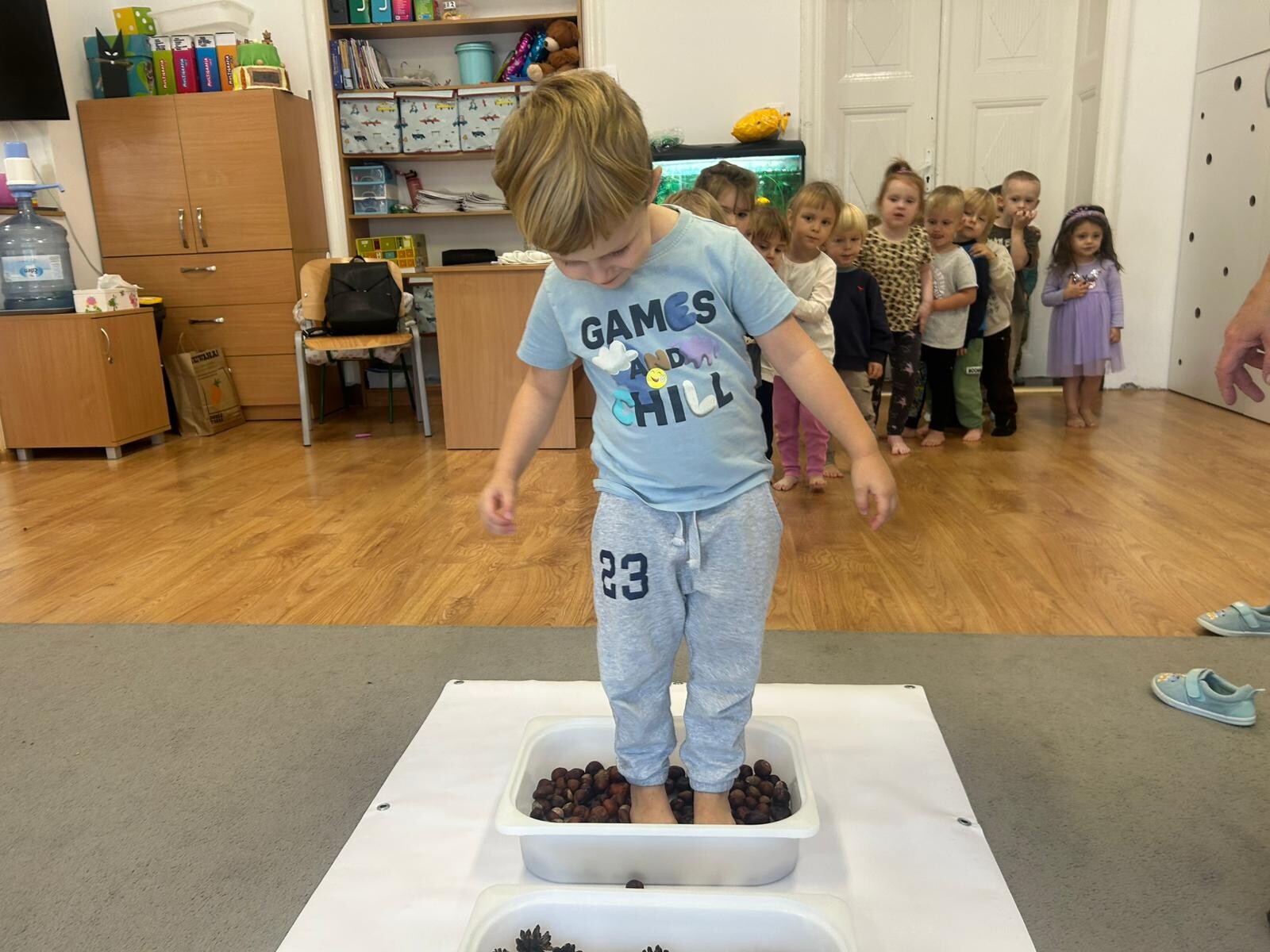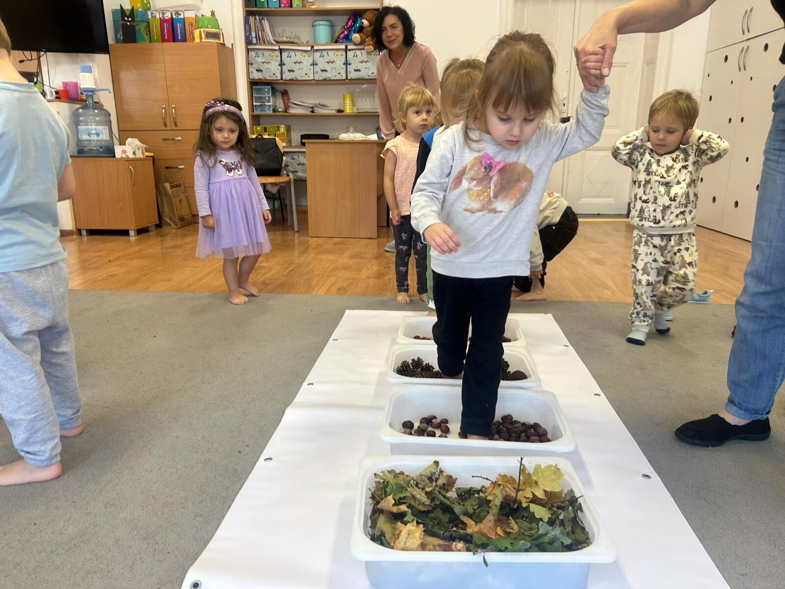 Na początek maluchy wzięły udział w jesiennym torze sensorycznym, podczas którego mogły poczuć pod swoimi stopami kasztany, żołędzie i szeleszczące, kolorowe liście. Dla wielu dzieci była to prawdziwa przygoda – różnorodne faktury i dźwięki budziły ciekawość i zachęcały do eksperymentowania.