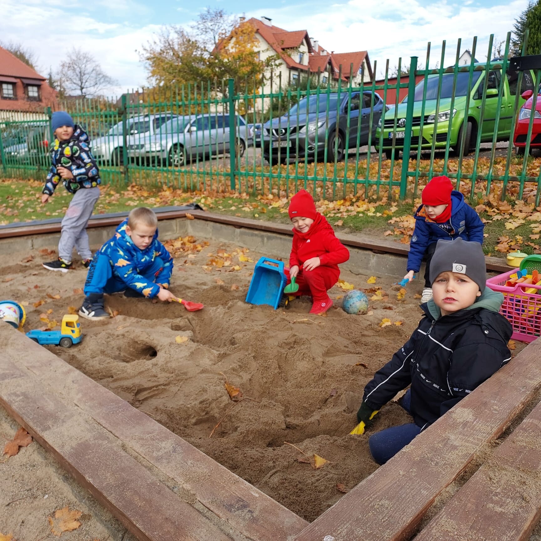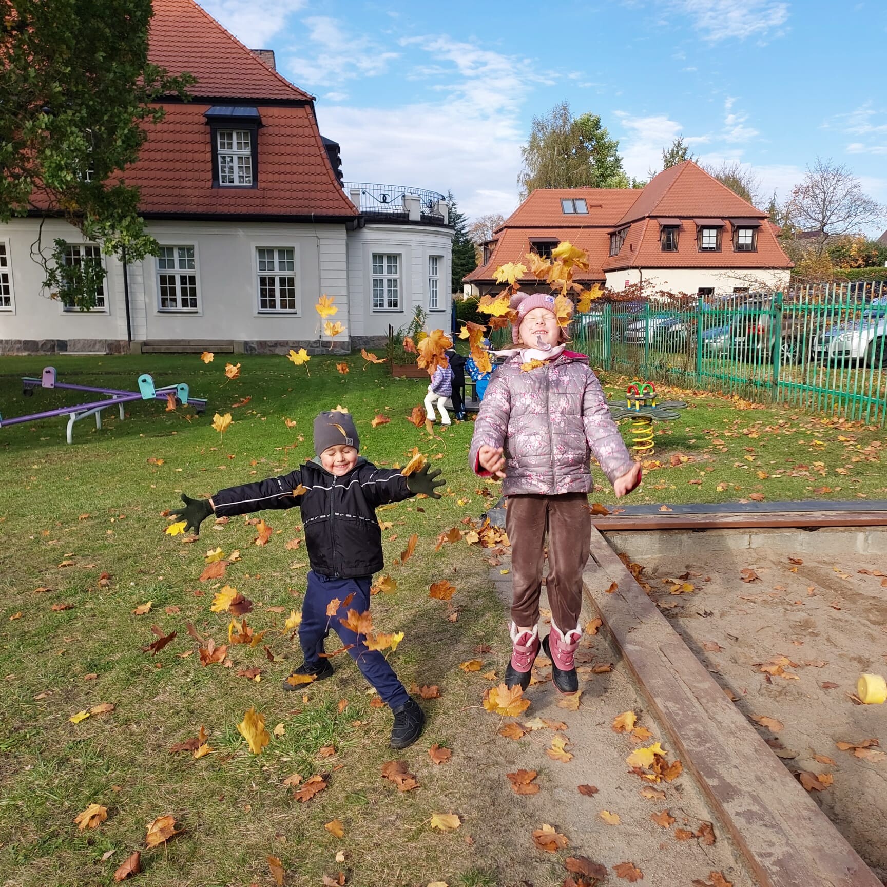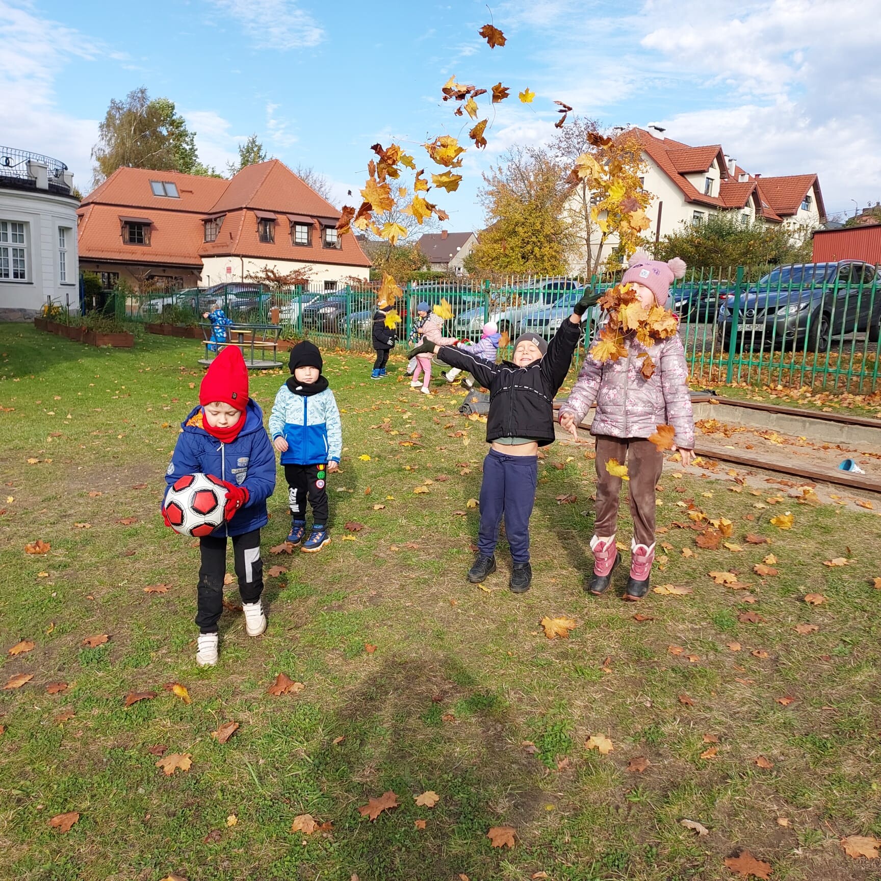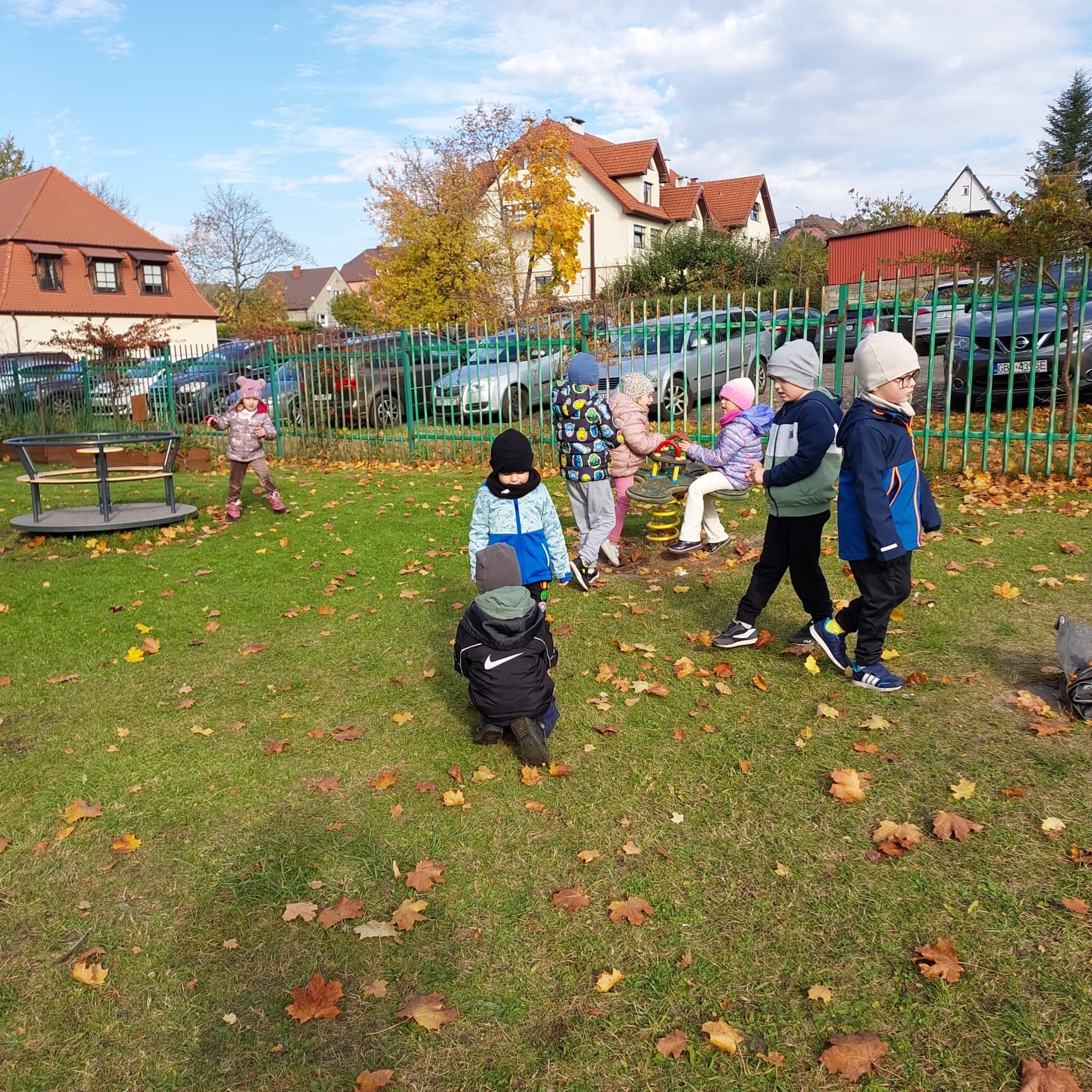 Wyjścia do ogrodu przedszkolnego są dla dzieci z grupy Biedronki doskonałą okazją do obserwowania zmian zachodzących w przyrodzie i poznawania charakterystycznych oznak jesieni. Przedszkolaki z zainteresowaniem przyglądają się kolorowym liściom, kasztanom i żołędziom, ucząc się rozpoznawać dary jesieni.