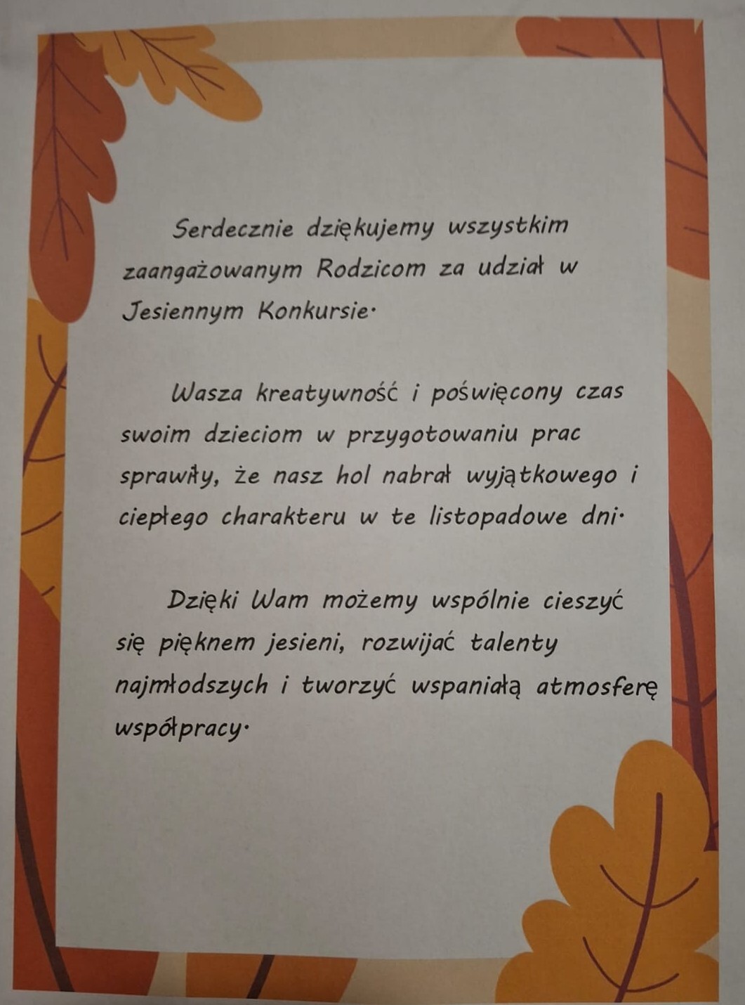 Serdecznie dziękujemy rodzicom za wsparcie, pomoc i wspólne inspirowanie dzieci do działania. Dzięki Państwa zaangażowaniu konkurs stał się wyjątkowym wydarzeniem, pełnym radości i twórczej atmosfery.