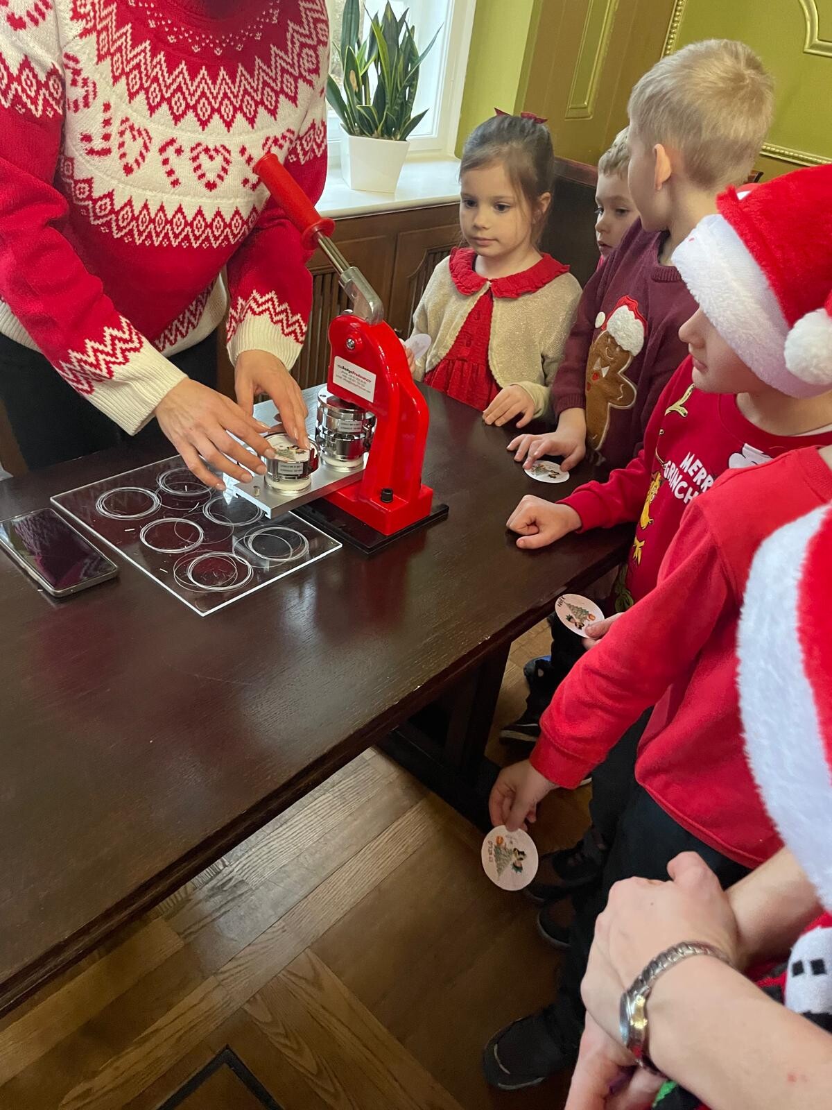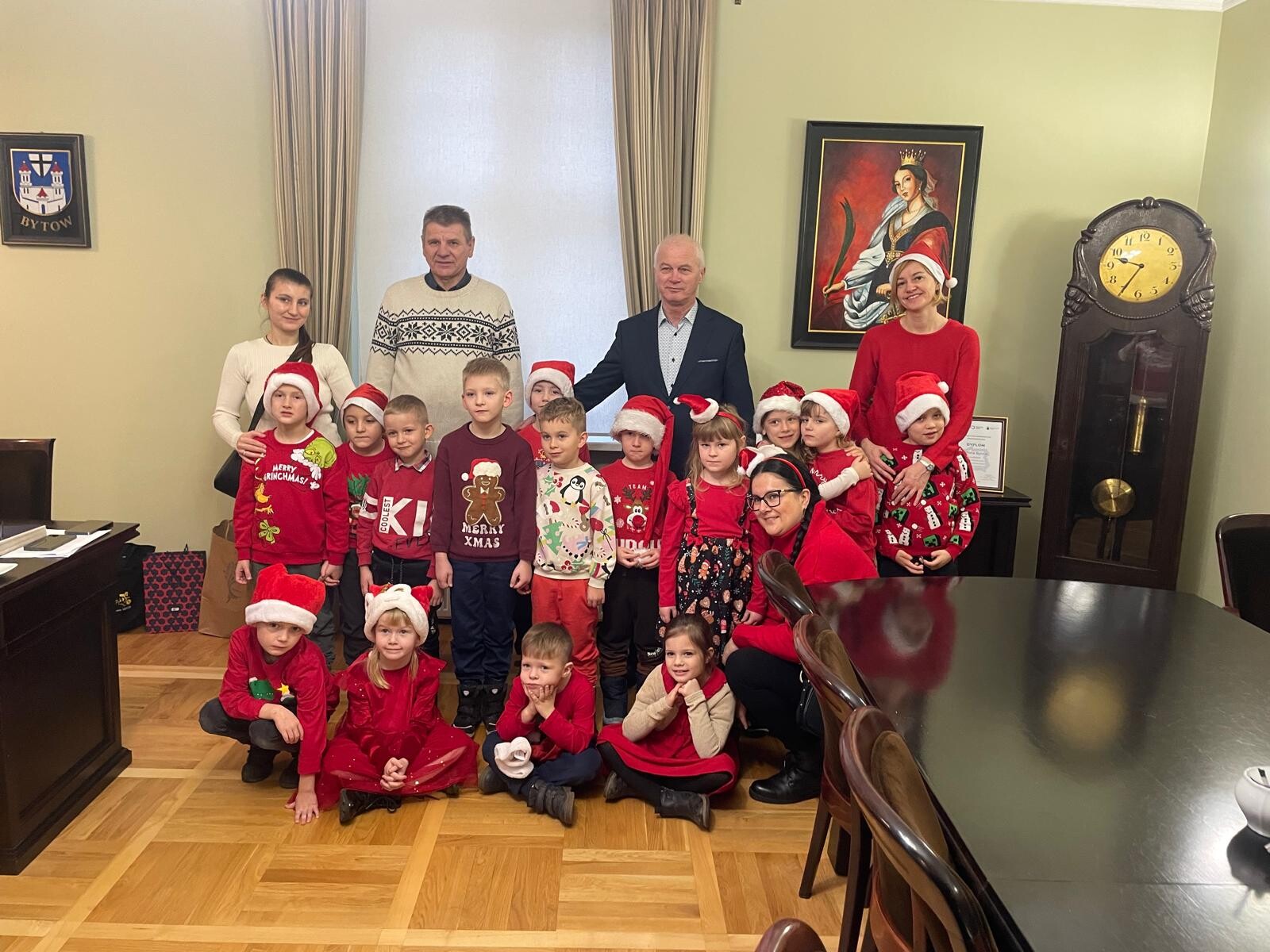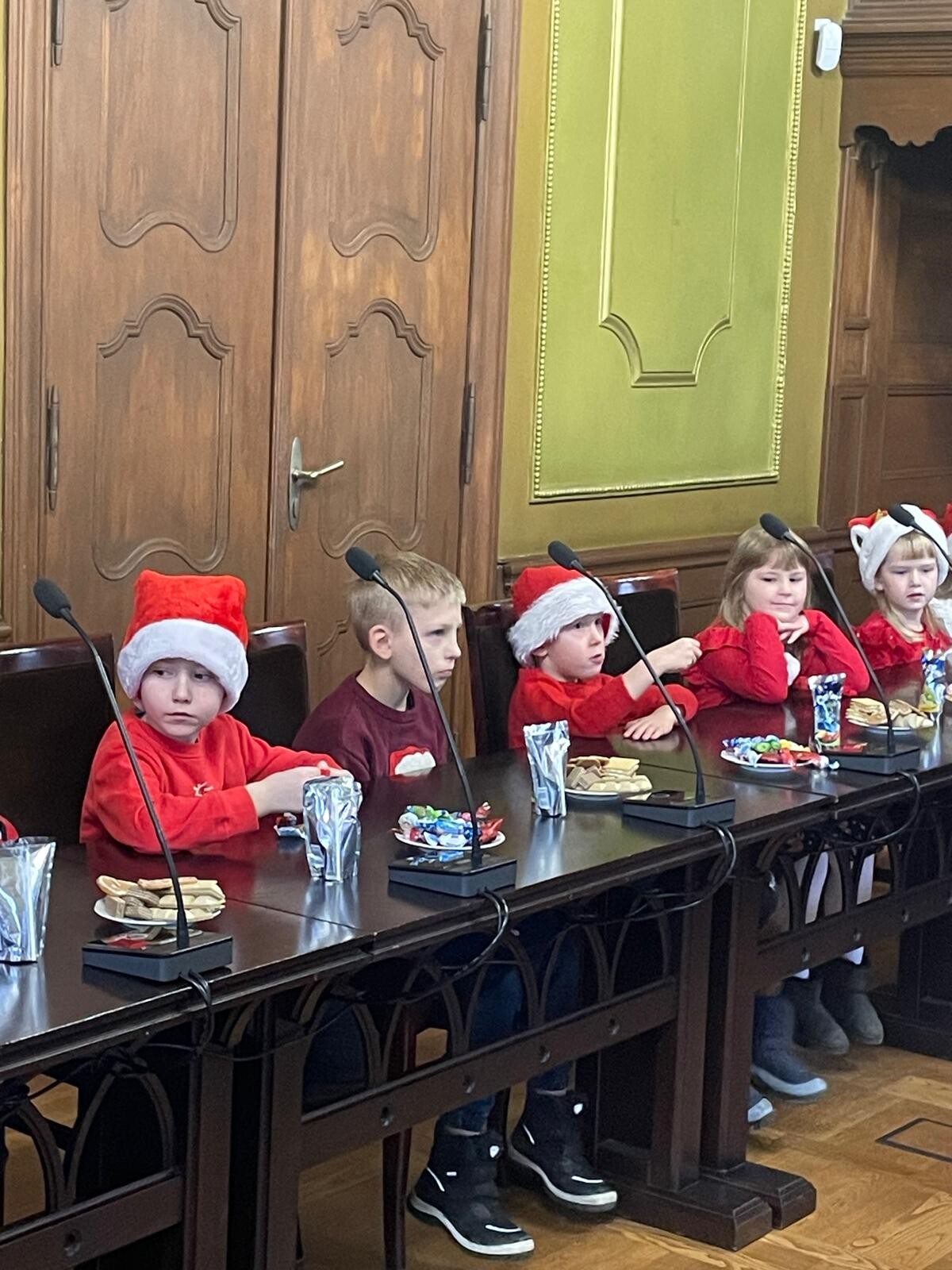 Po dekoracji świątecznego drzewka wykonano wspólną fotografię, a następnie dzieci udały się na salę obrad rady miejskiej. Tam czekał na nie poczęstunek oraz prezent w postaci świątecznej przypinki.