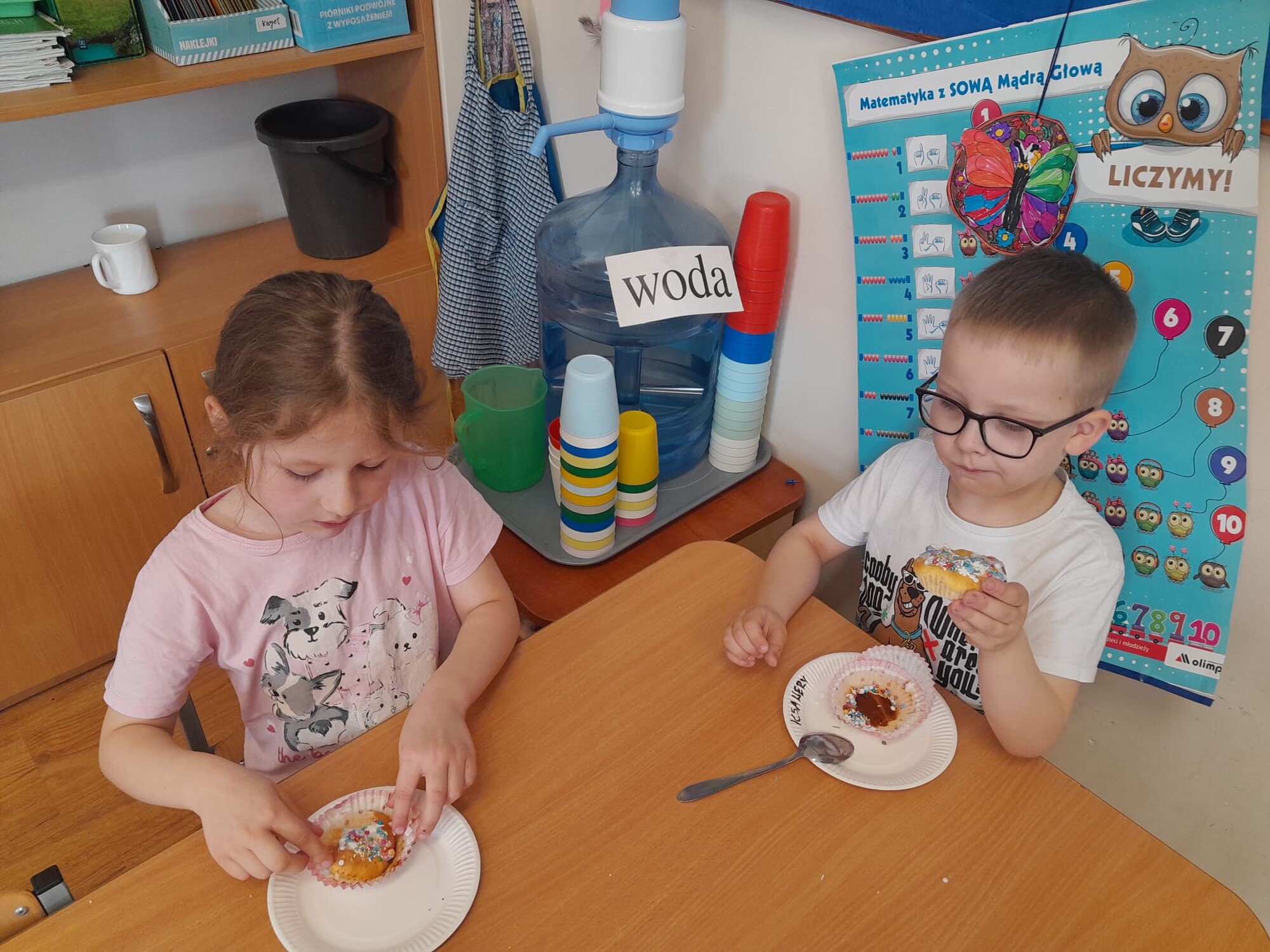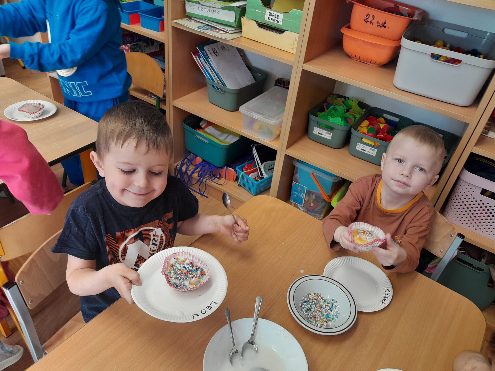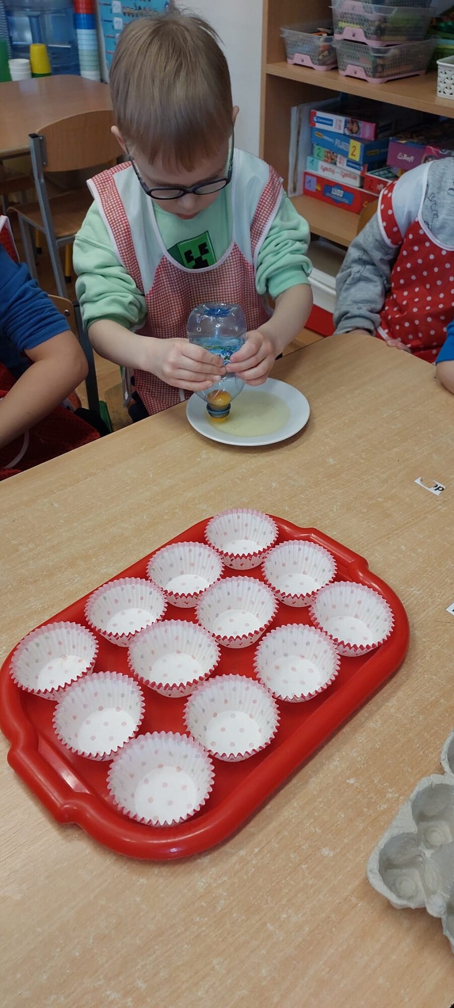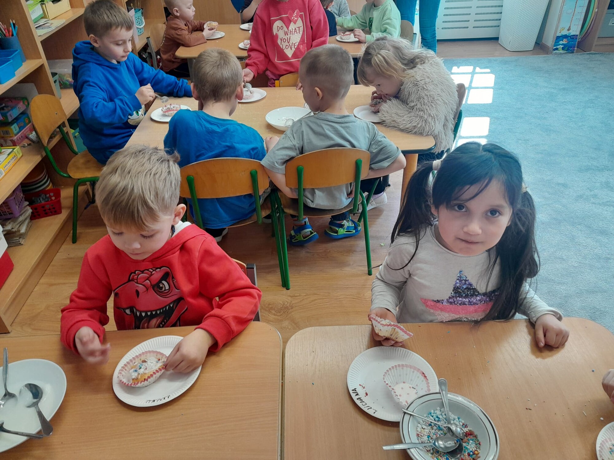 Rozbite jajka zostały następnie wykorzystane do upieczenia babeczek, które dzieci samodzielnie udekorowały. Babeczki bardzo smakowały dzieciom – były pyszne.