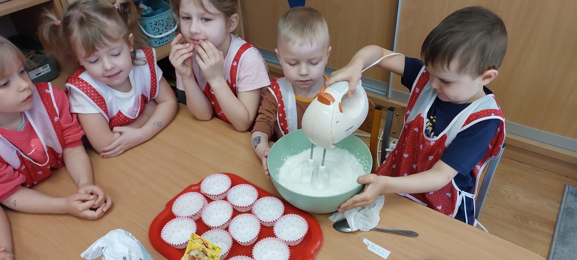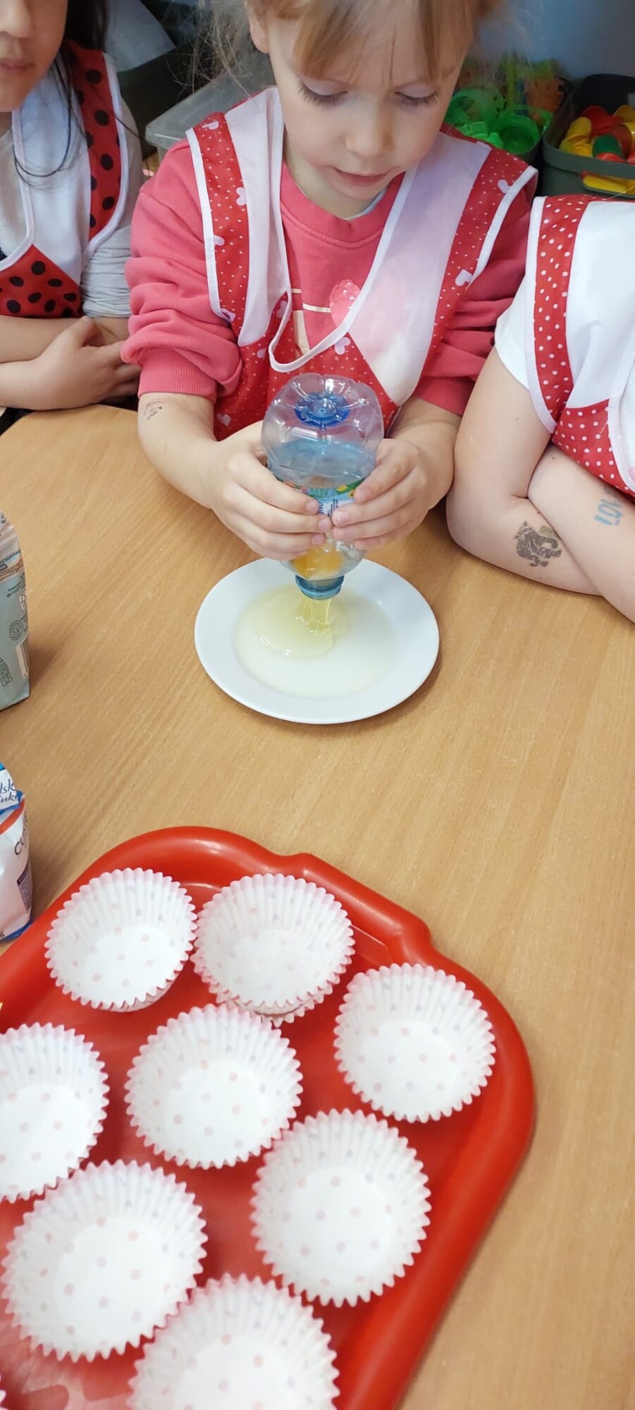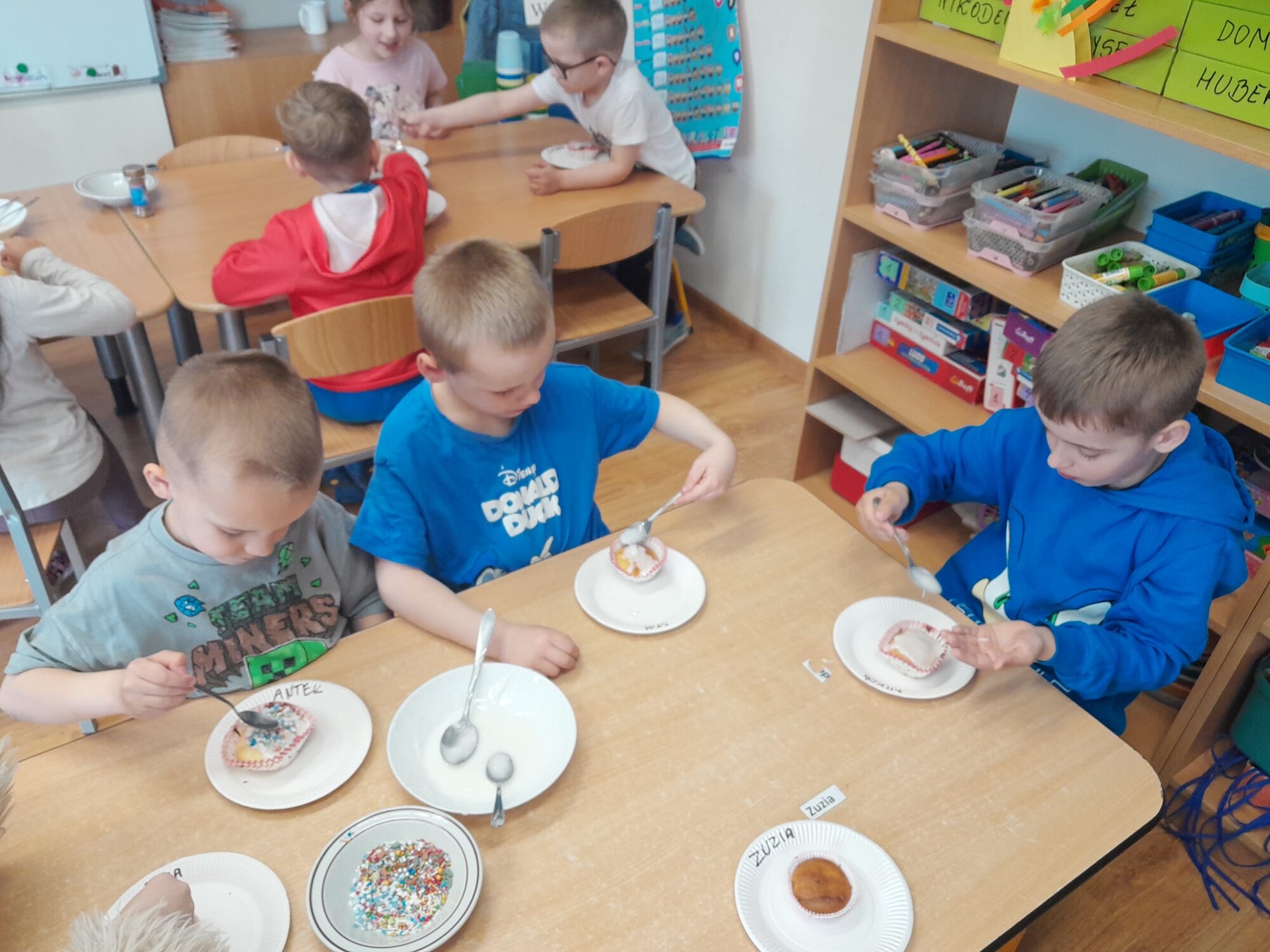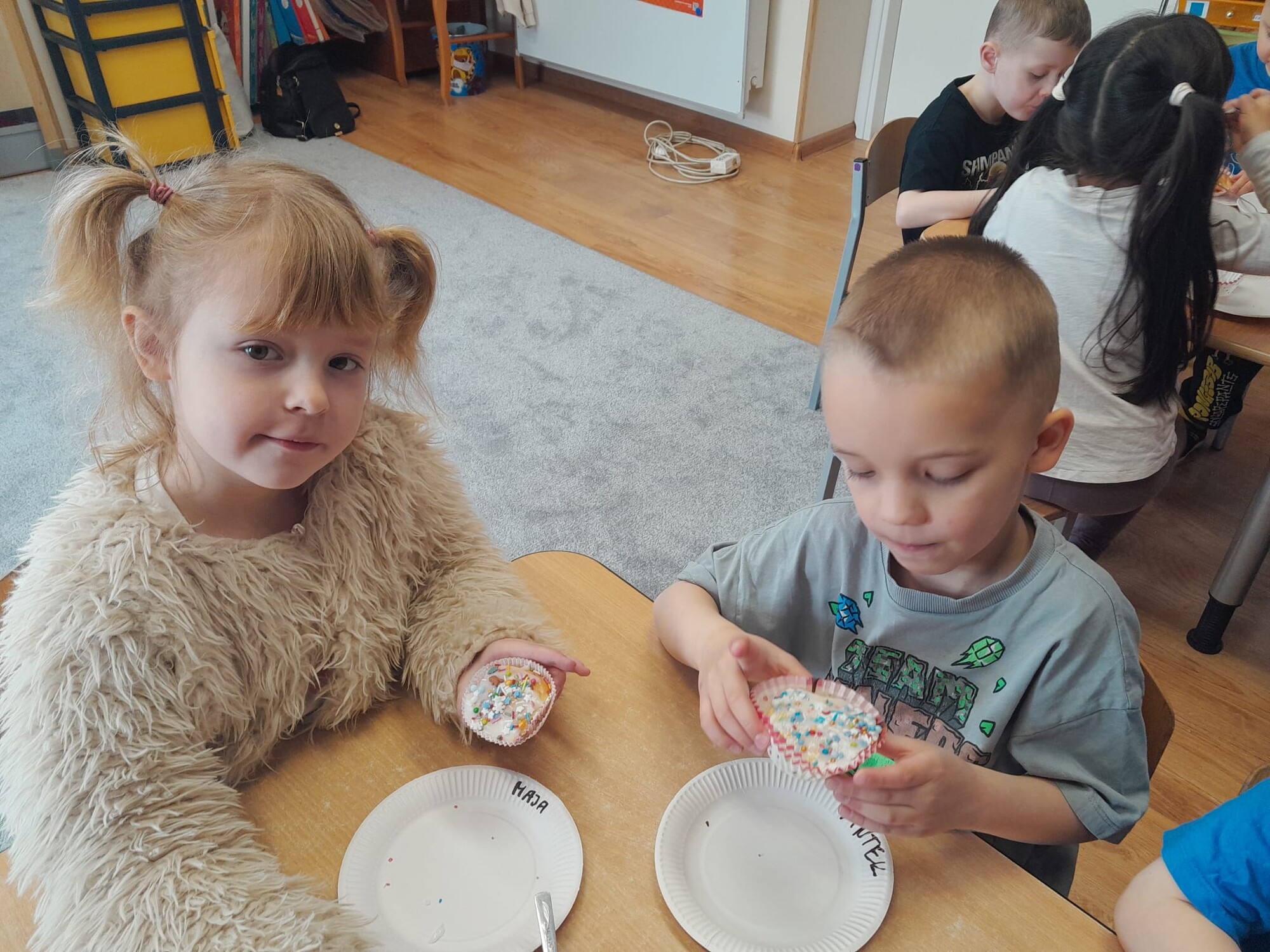 Rozbite jajka zostały następnie wykorzystane do upieczenia babeczek, które dzieci samodzielnie udekorowały. Babeczki bardzo smakowały dzieciom – były pyszne.