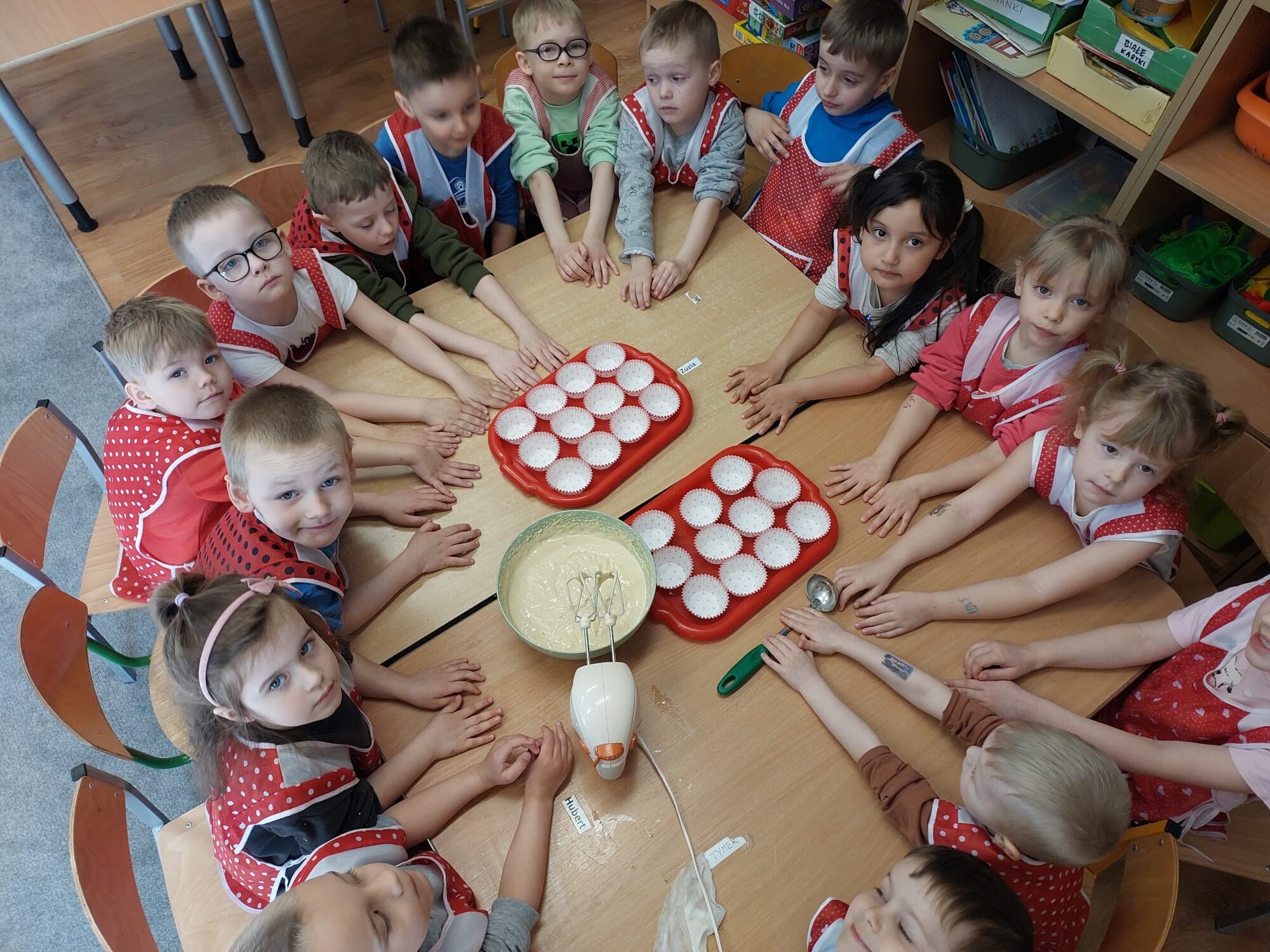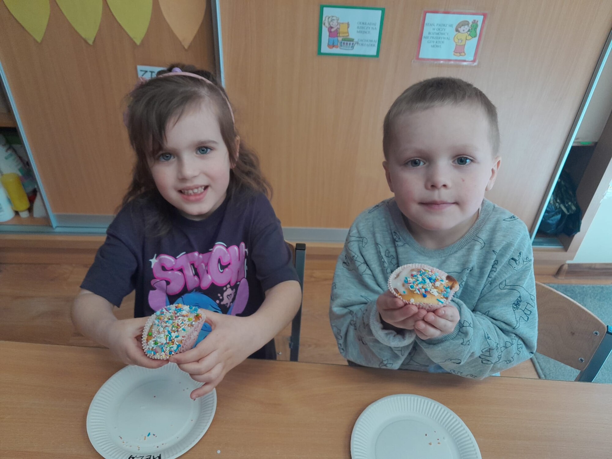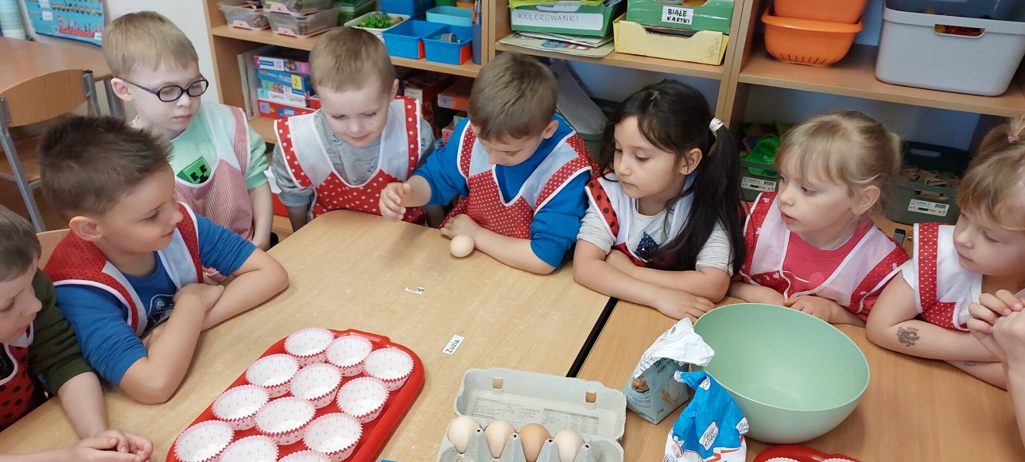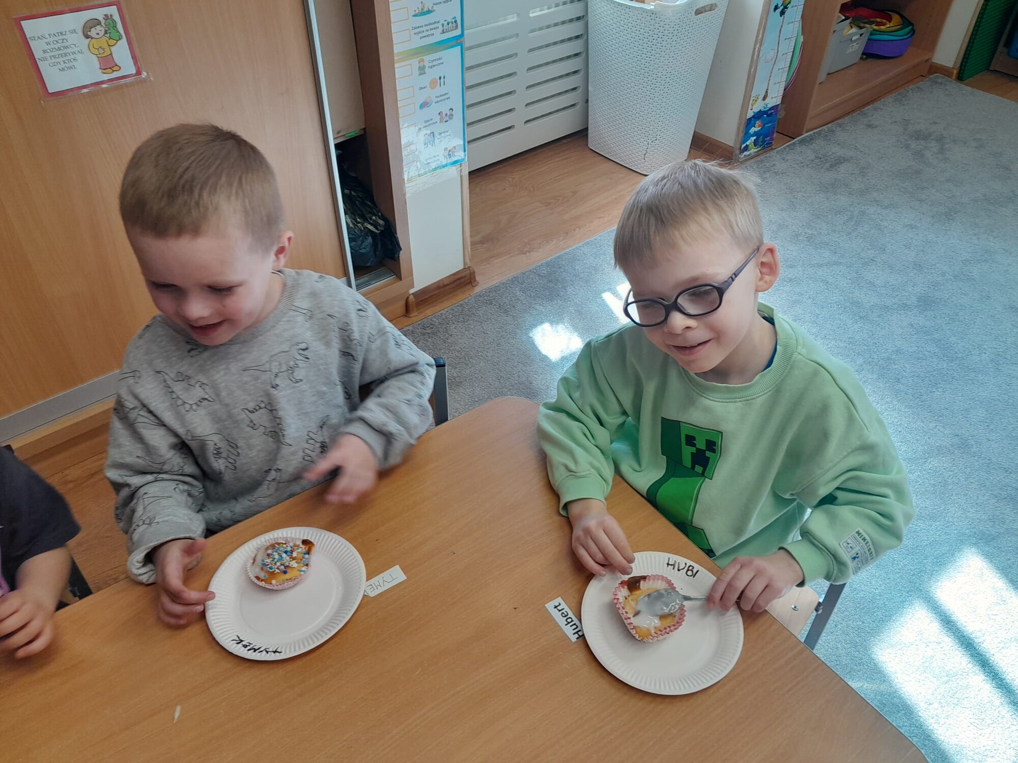 Rozbite jajka zostały następnie wykorzystane do upieczenia babeczek, które dzieci samodzielnie udekorowały. Babeczki bardzo smakowały dzieciom – były pyszne.