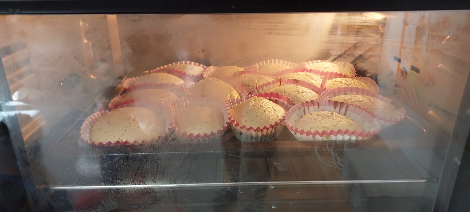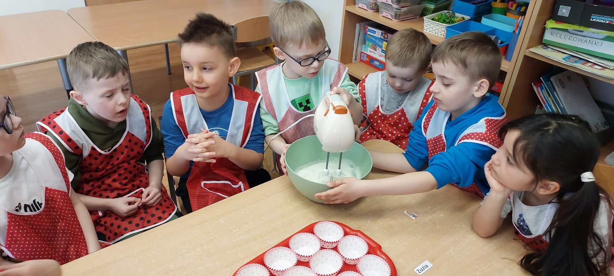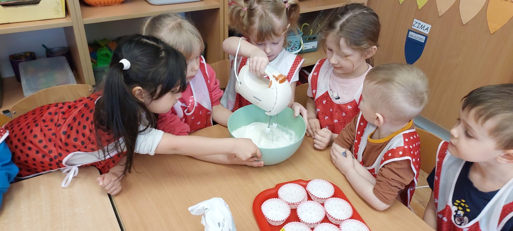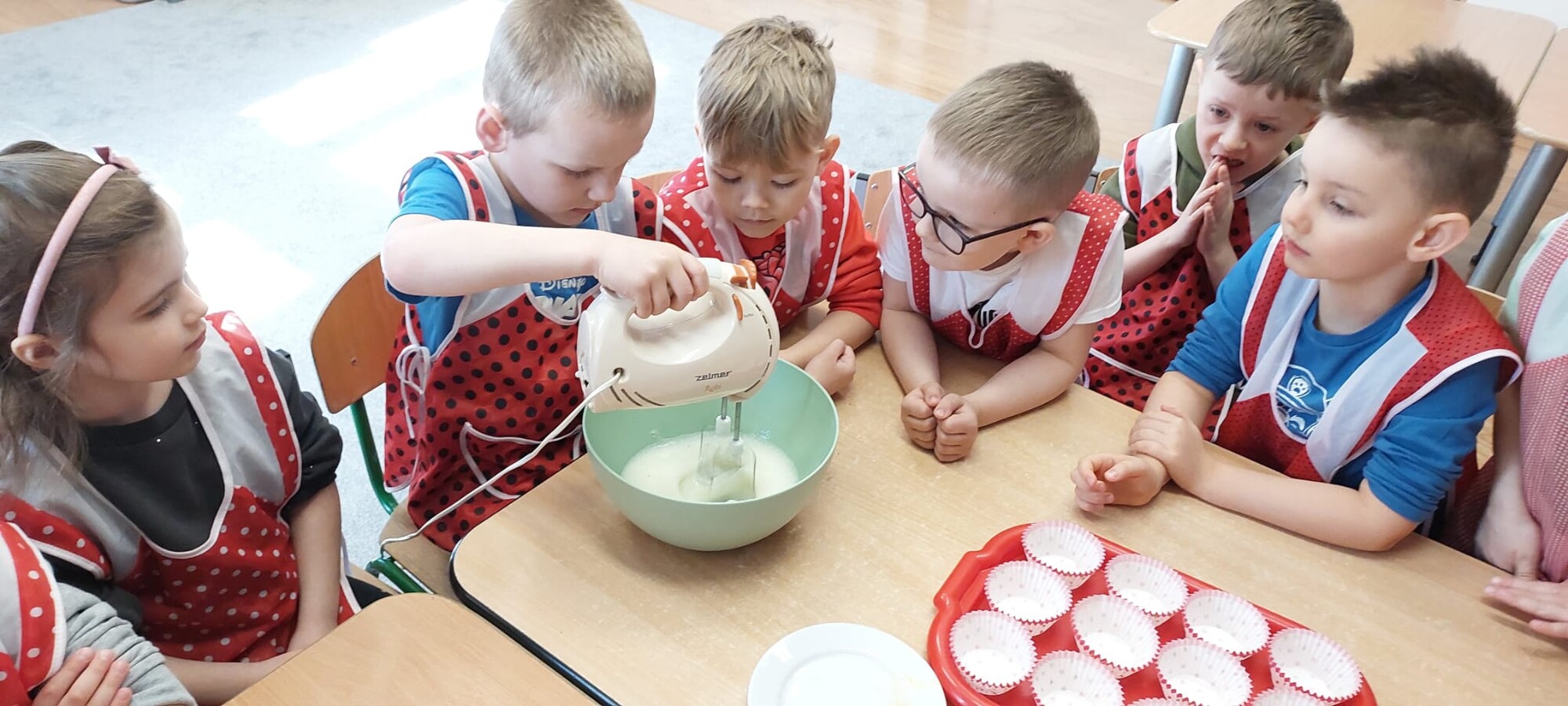 Rozbite jajka zostały następnie wykorzystane do upieczenia babeczek, które dzieci samodzielnie udekorowały. Babeczki bardzo smakowały dzieciom – były pyszne.