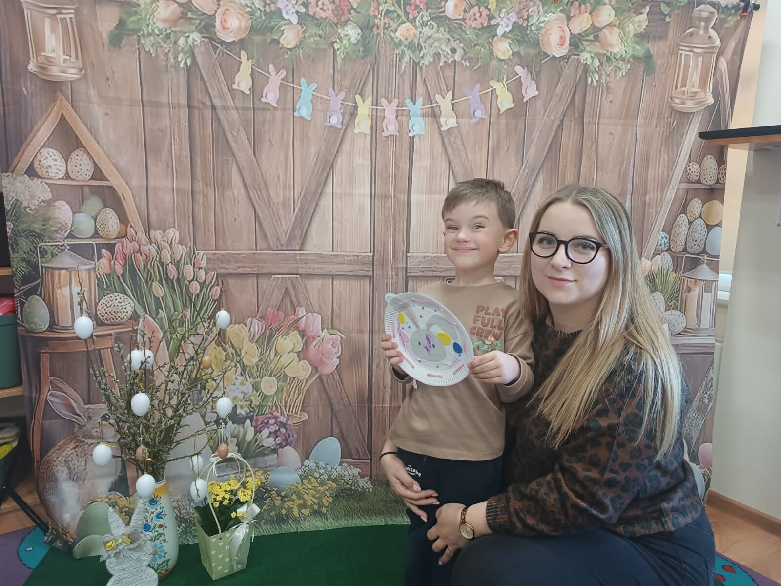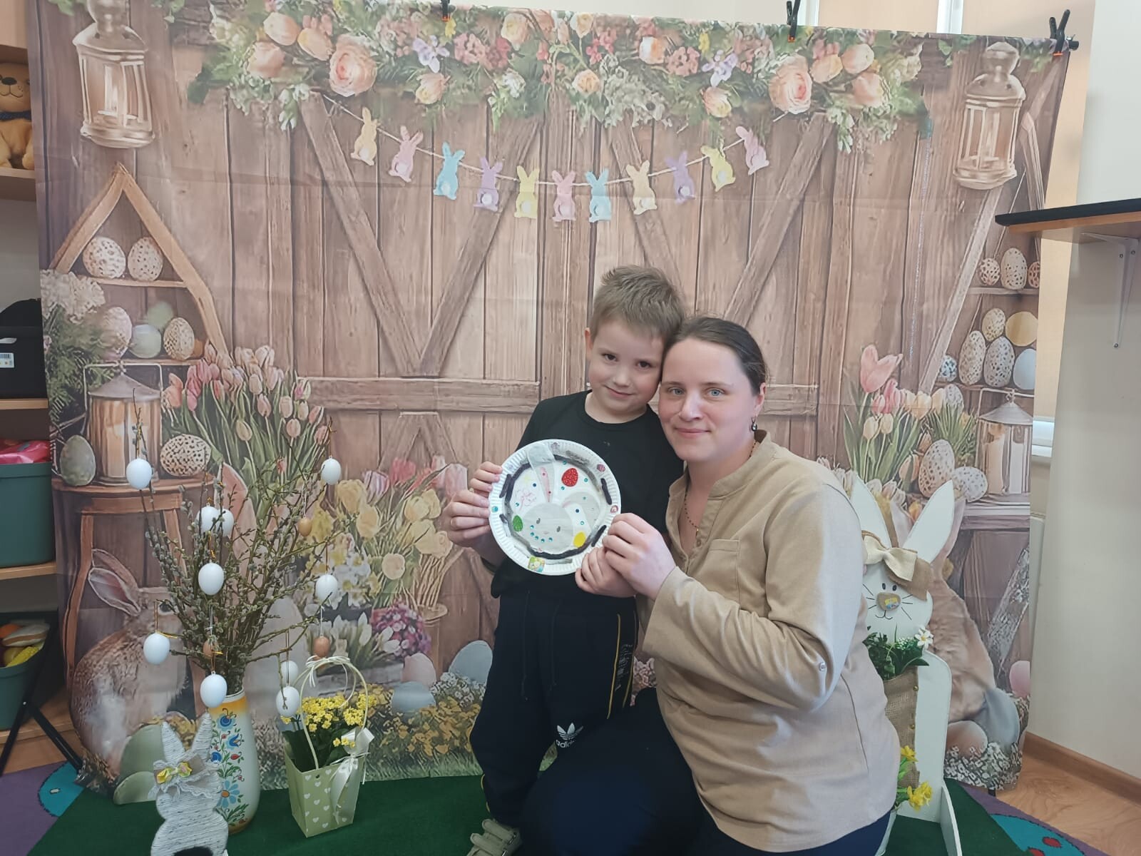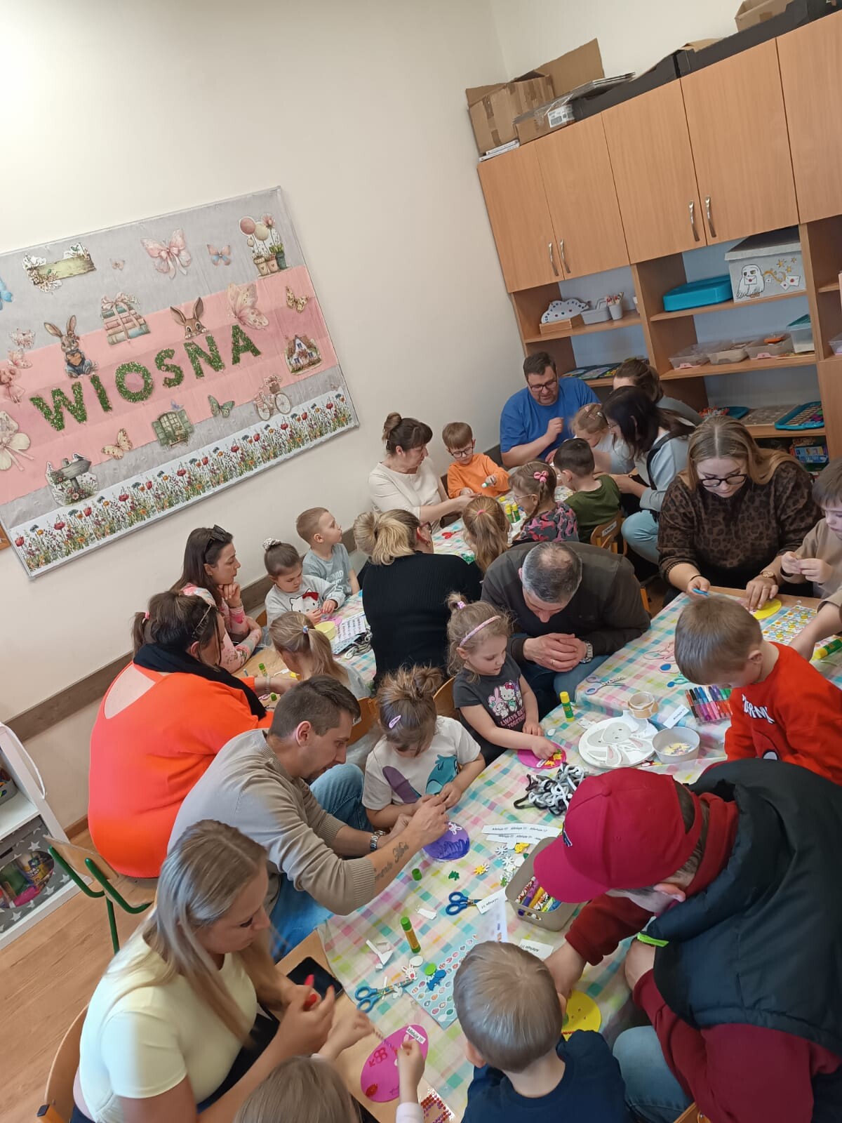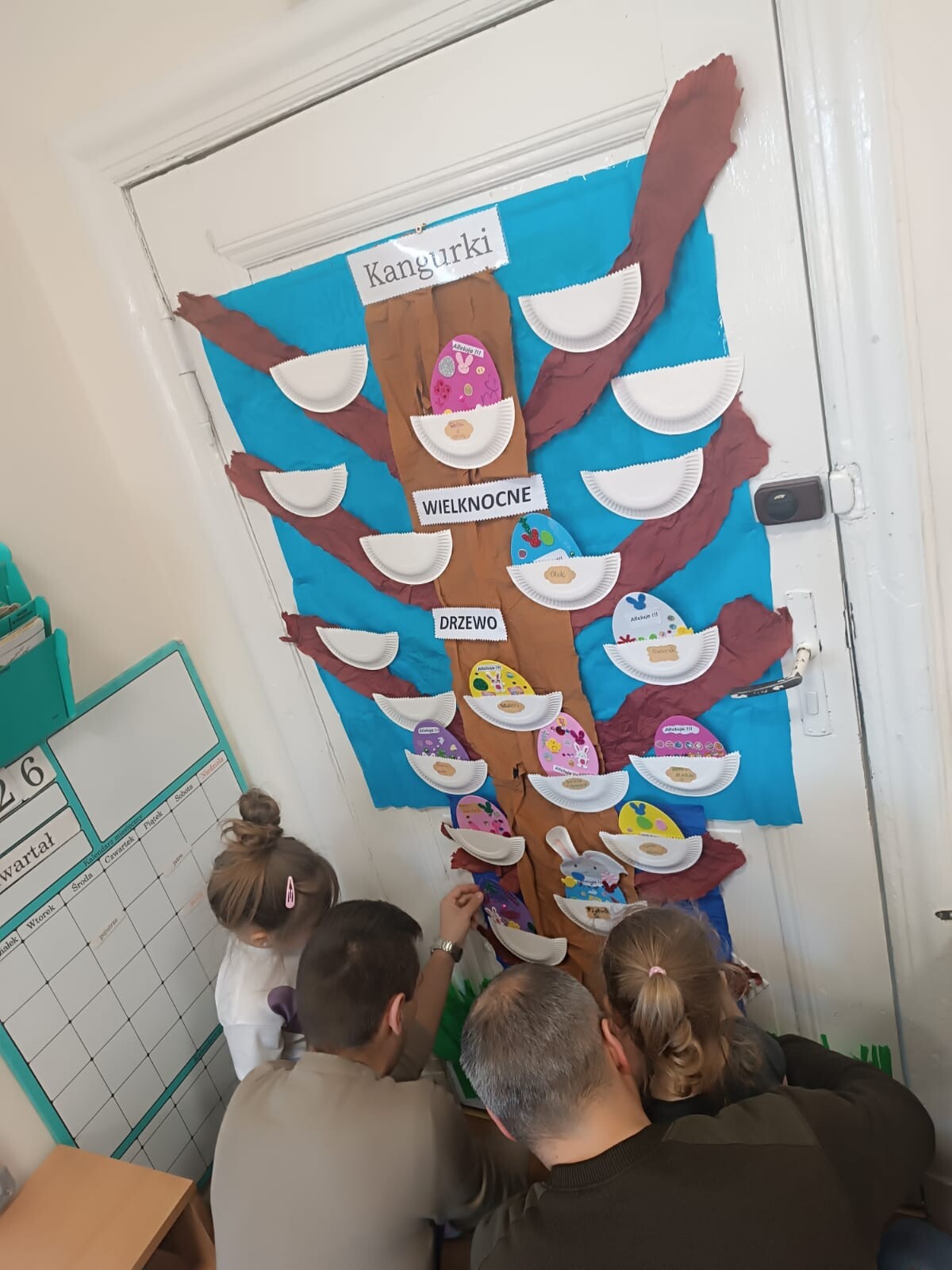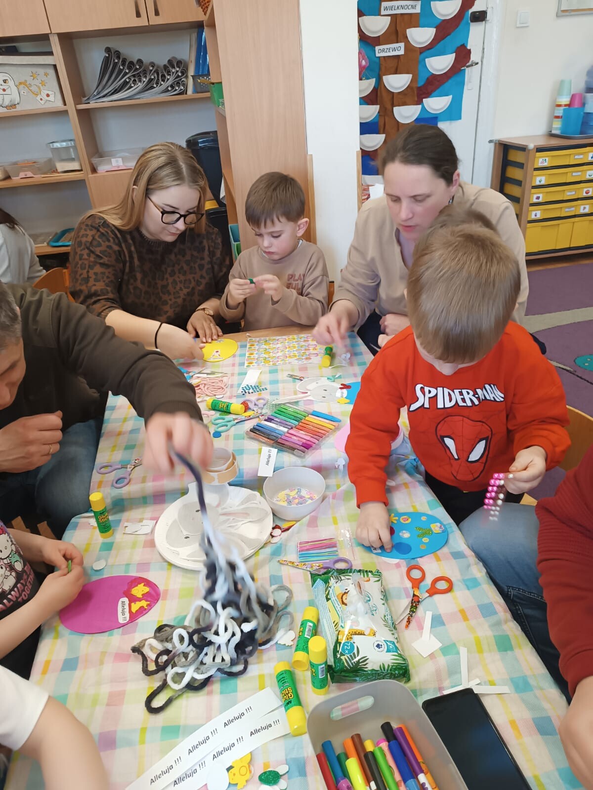 Dzieci wraz z rodzicami przystąpili do wspólnego tworzenia wielkanocnych pisanek, które ozdobiły grupowe drzewko. Nie zabrakło również pamiątkowych zdjęć na specjalnie przygotowanym, świątecznym tle.