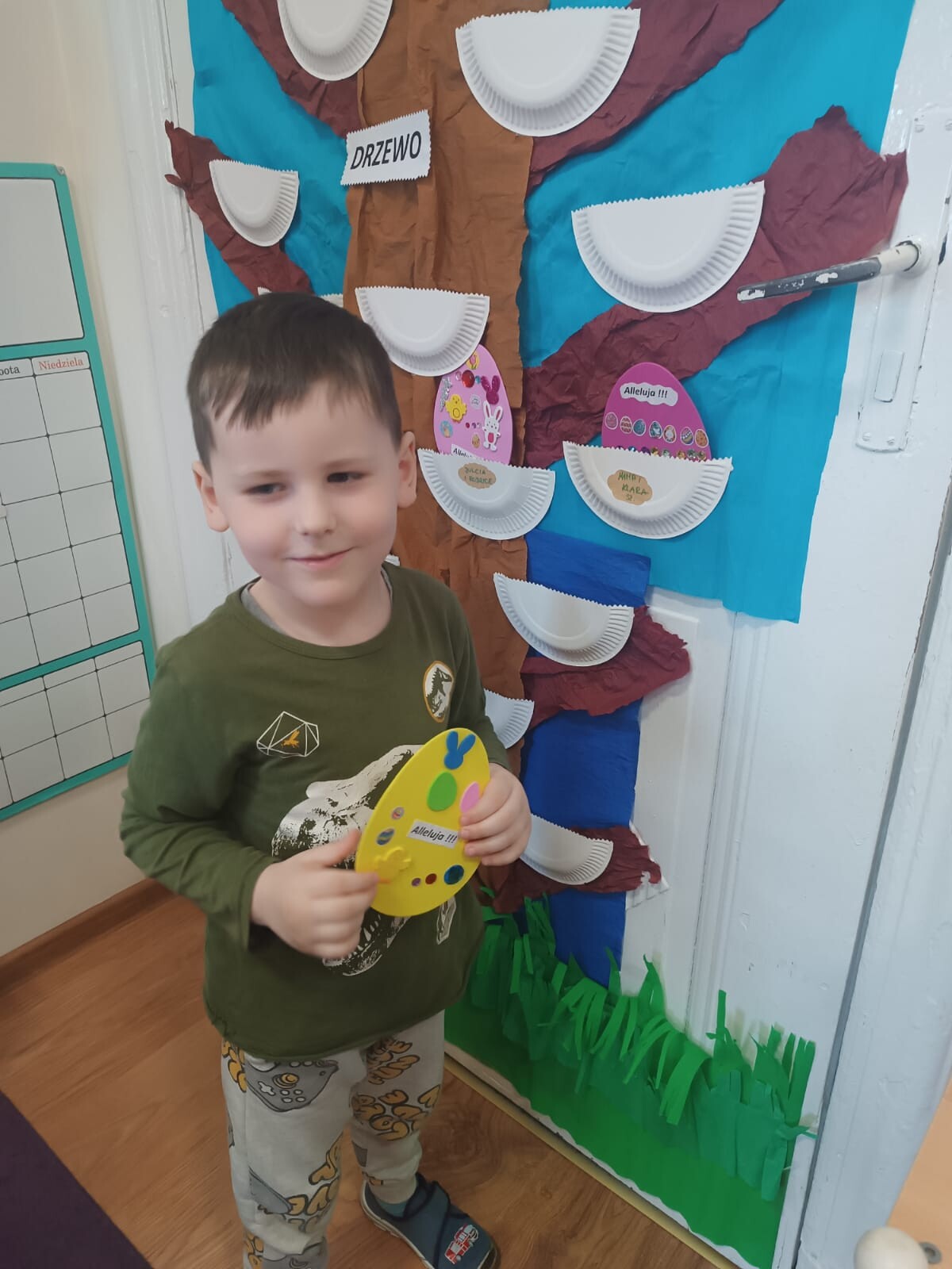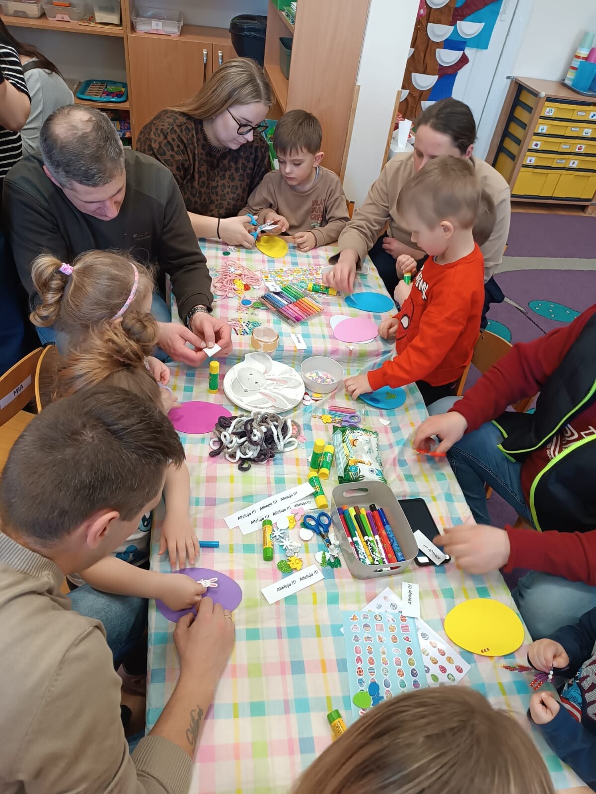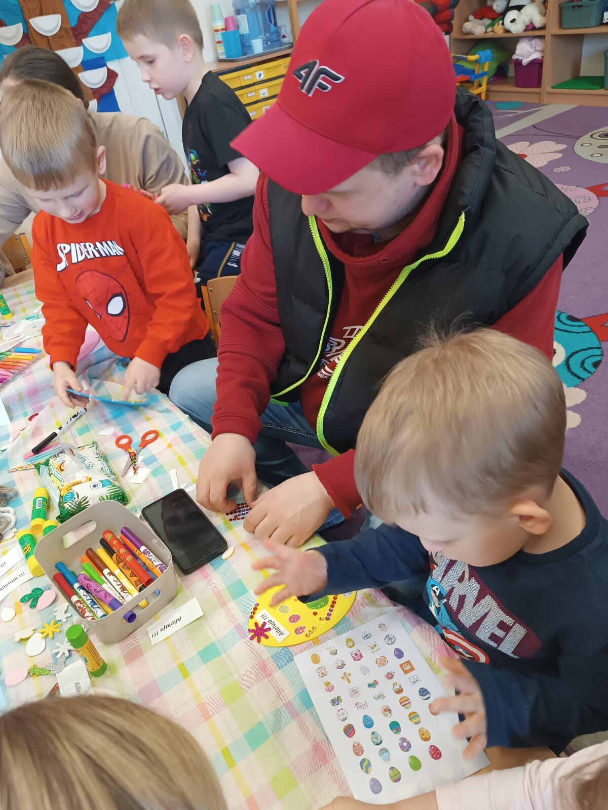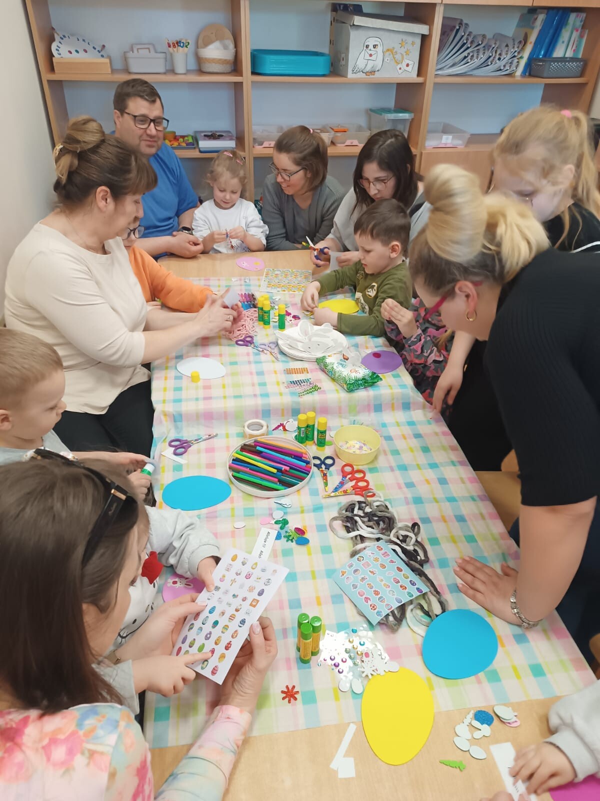 Dzieci wraz z rodzicami przystąpili do wspólnego tworzenia wielkanocnych pisanek, które ozdobiły grupowe drzewko. Nie zabrakło również pamiątkowych zdjęć na specjalnie przygotowanym, świątecznym tle.