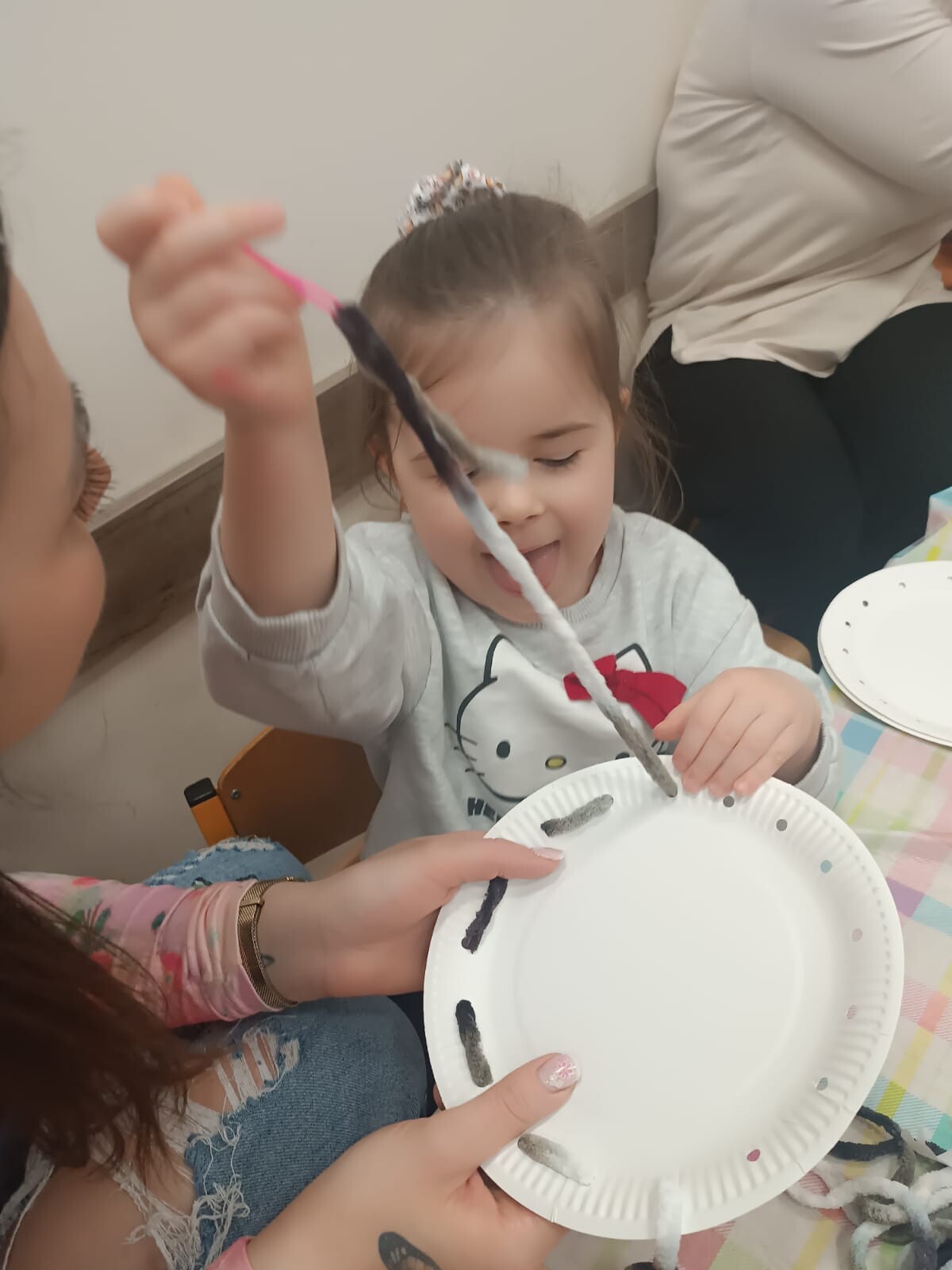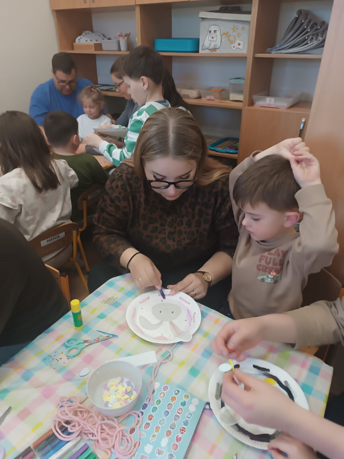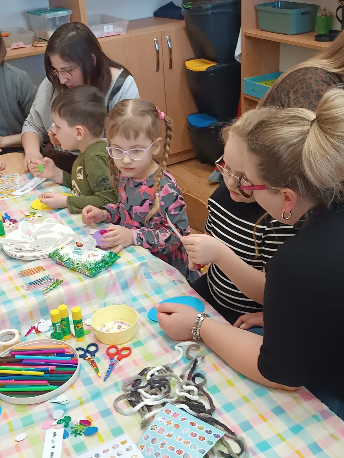 W dalszej części warsztatów dzieci wraz z rodzicami wykonały niezwykłe prace plastyczne na papierowych talerzykach. Powstały urocze wielkanocne króliczki, a uczestnicy wykazali się ogromną kreatywnością, wykorzystując kolorowe włóczki oraz próbując swoich sił w szyciu igłą.
