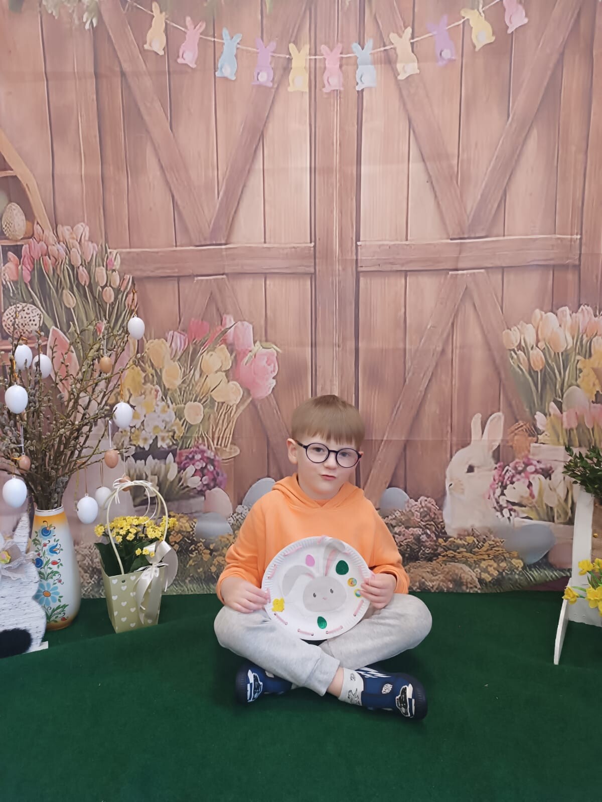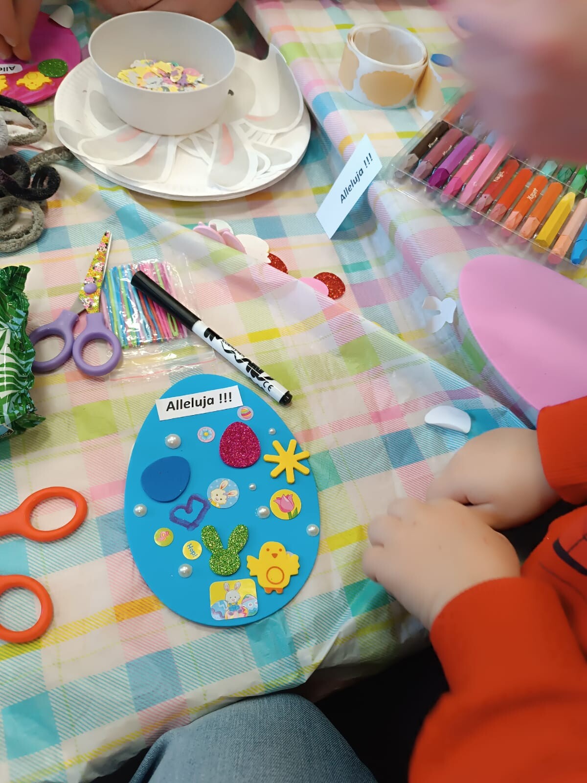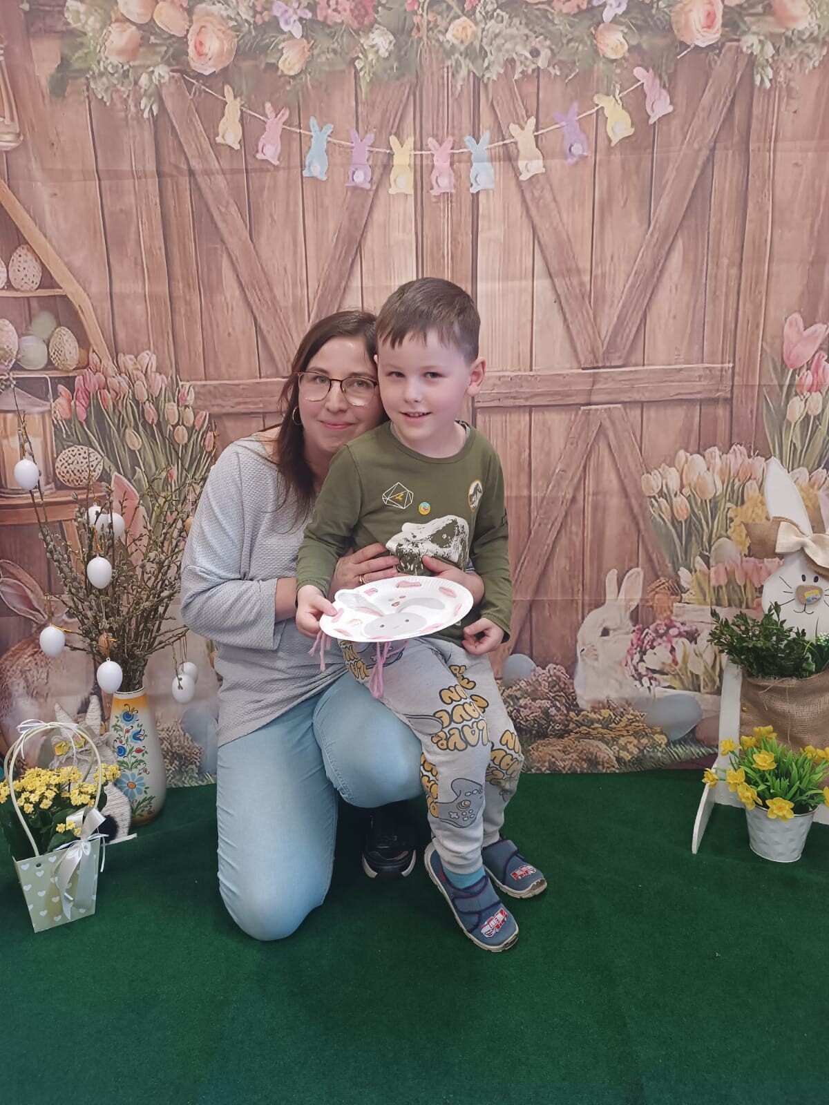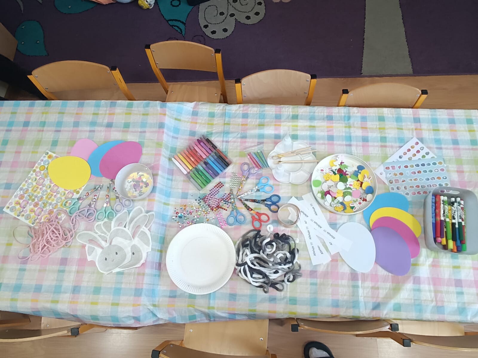 W dalszej części warsztatów dzieci wraz z rodzicami wykonały niezwykłe prace plastyczne na papierowych talerzykach. Powstały urocze wielkanocne króliczki, a uczestnicy wykazali się ogromną kreatywnością, wykorzystując kolorowe włóczki oraz próbując swoich sił w szyciu igłą.