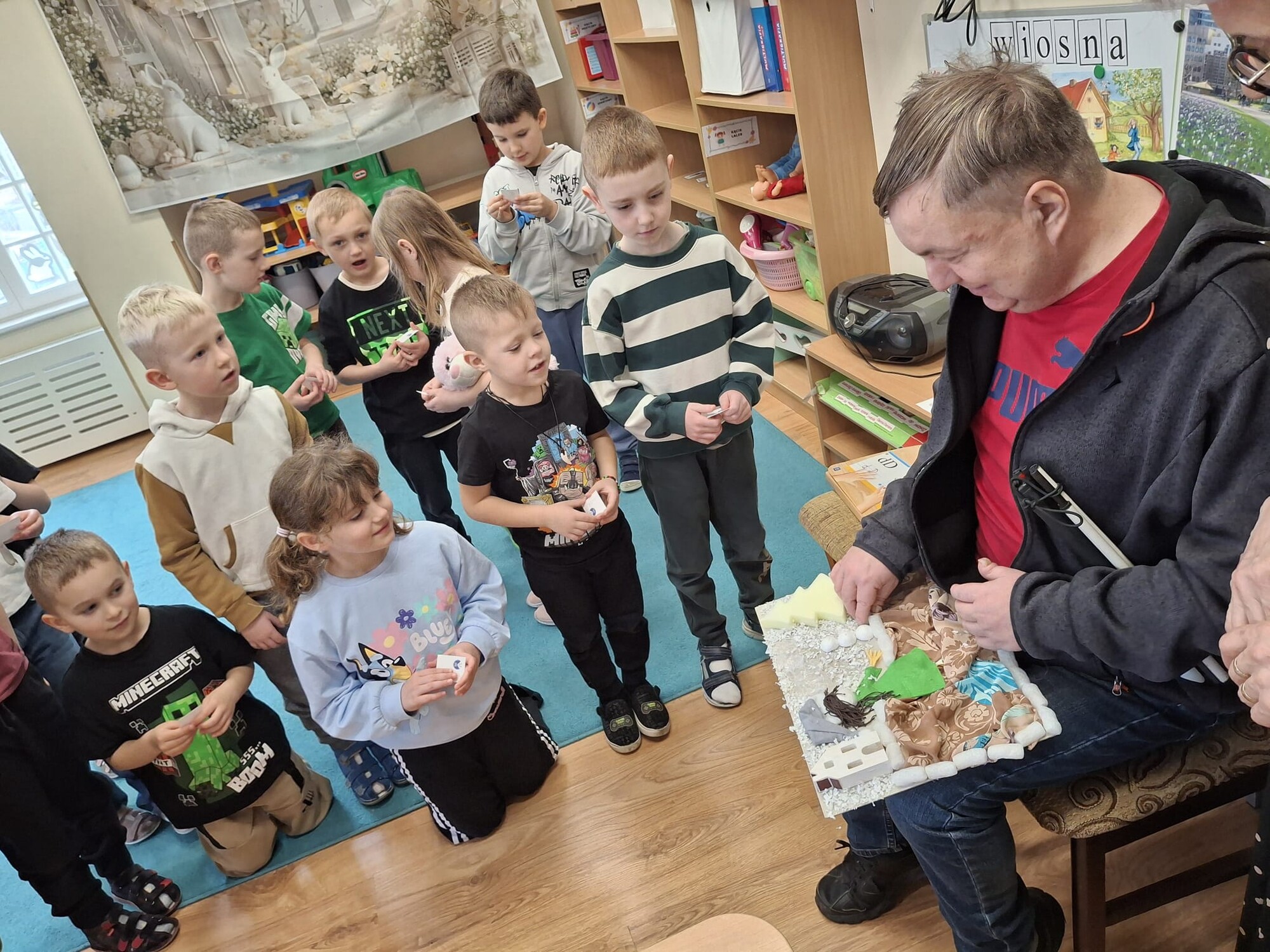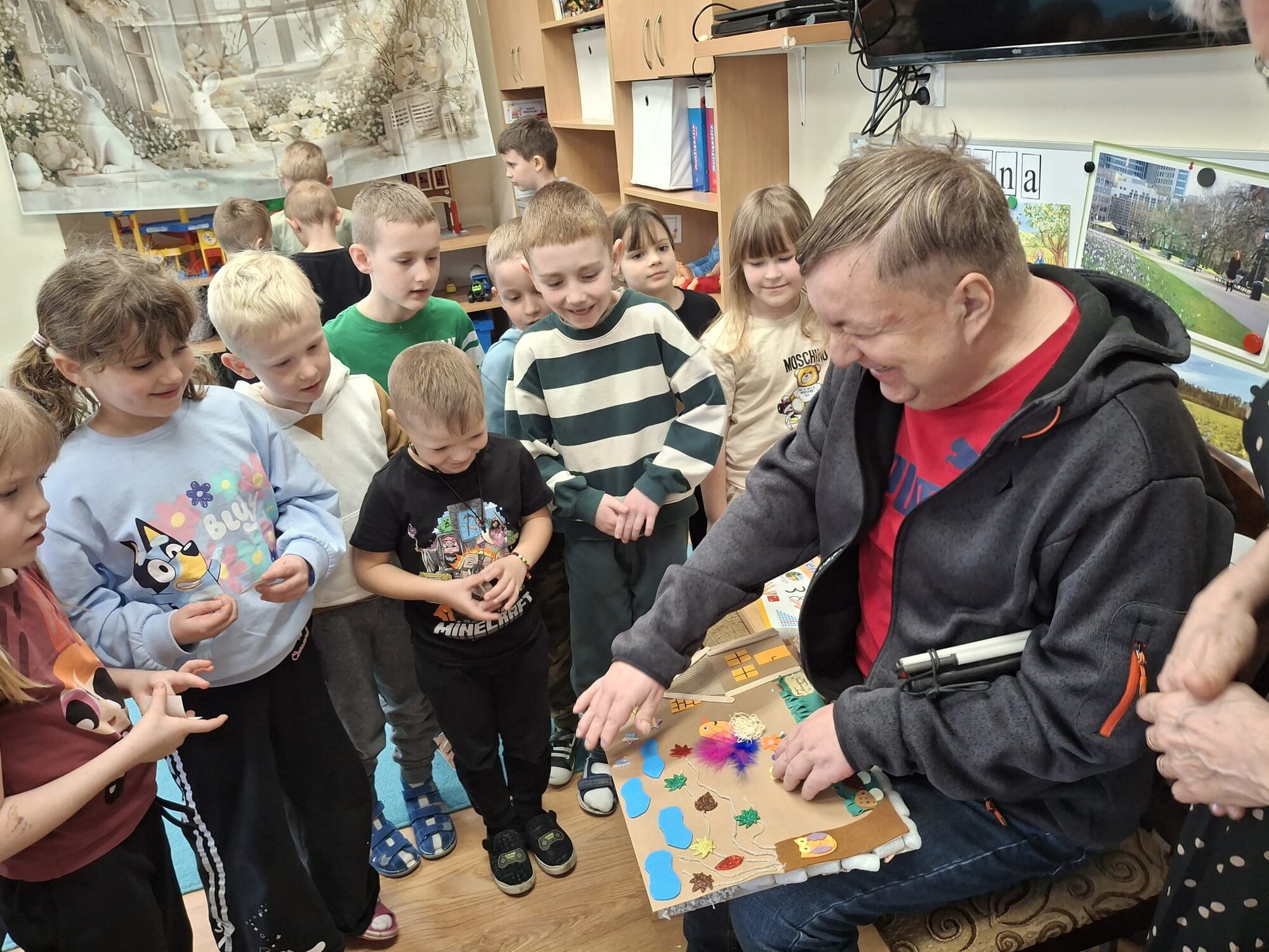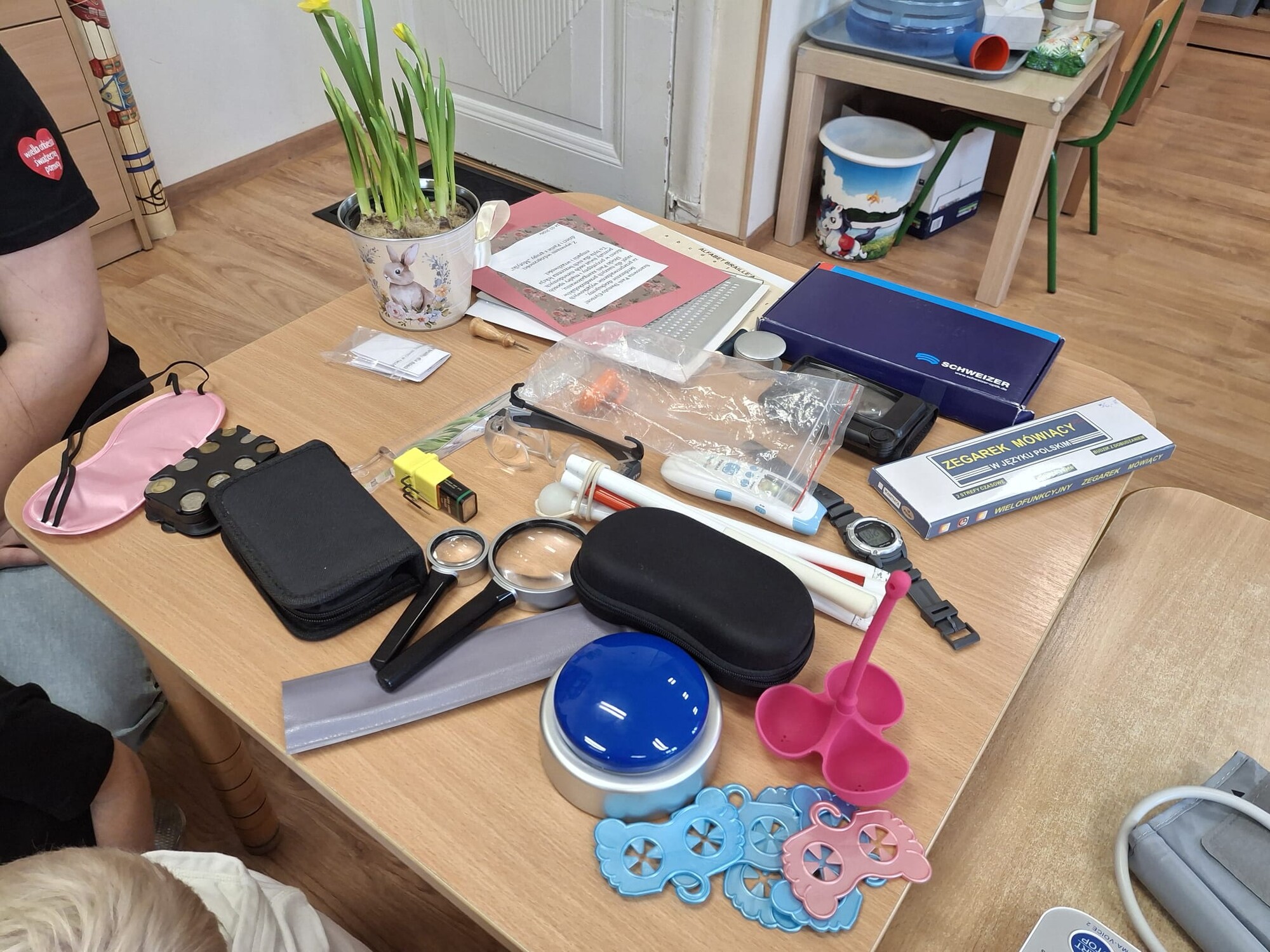 Podczas spotkania przedszkolaki miały okazję zapoznać się z różnymi przedmiotami codziennego użytku, które ułatwiają funkcjonowanie osobom niewidomym. Dzieci mogły także spróbować poruszania się z zasłoniętymi oczami, co pozwoliło im lepiej zrozumieć wyzwania, z jakimi mierzą się osoby z dysfunkcją wzroku.