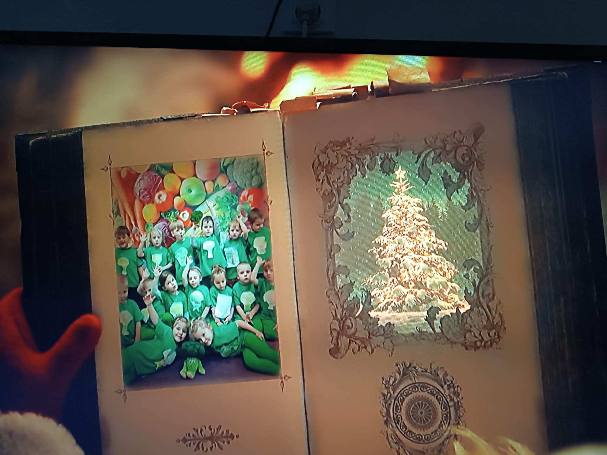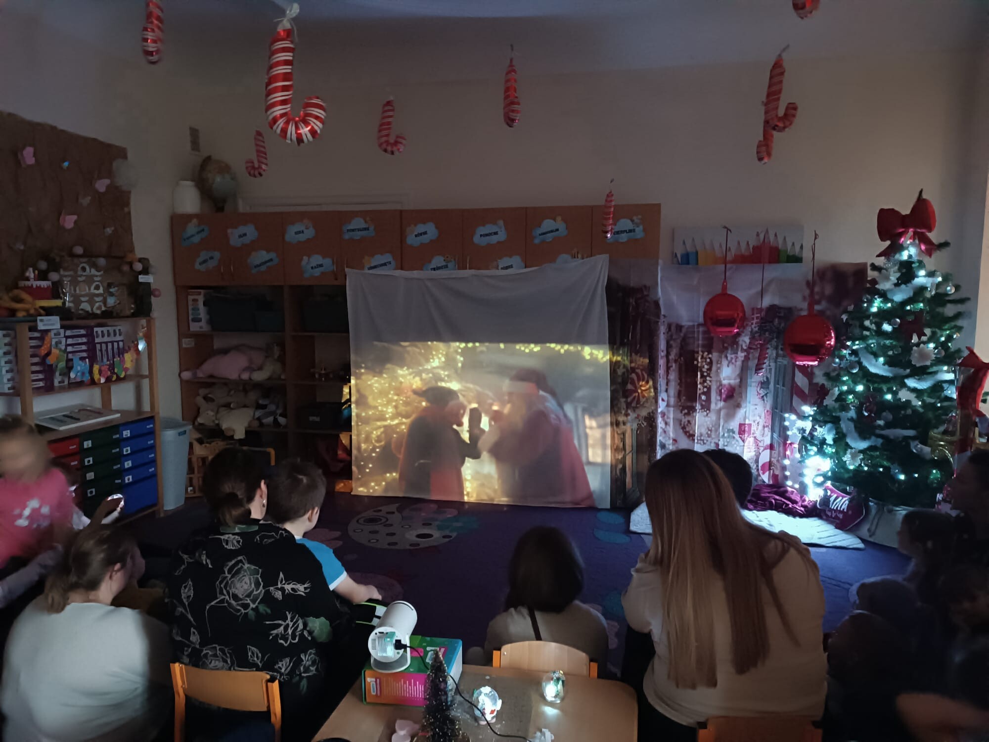 Następnie dzieci zaprezentowały piosenkę, której uczyły się ostatnio – „Zima, zima, zima”. Po krótkim występie czekała na nie wyjątkowa niespodzianka: film od Świętego Mikołaja, który wspólnie obejrzeliśmy na projektorze. Przedszkolaki były bardzo zaskoczone i zachwycone tą atrakcją.