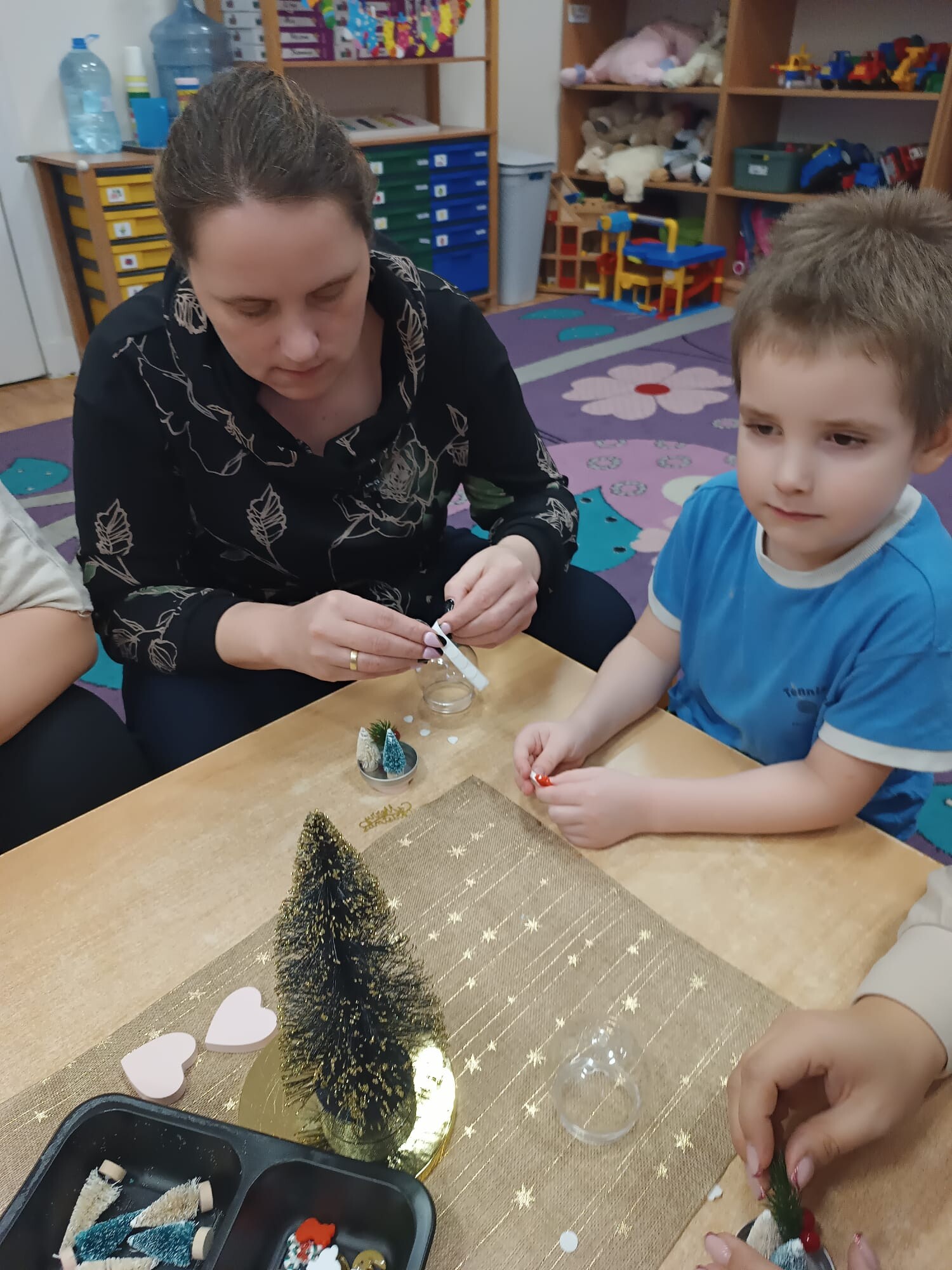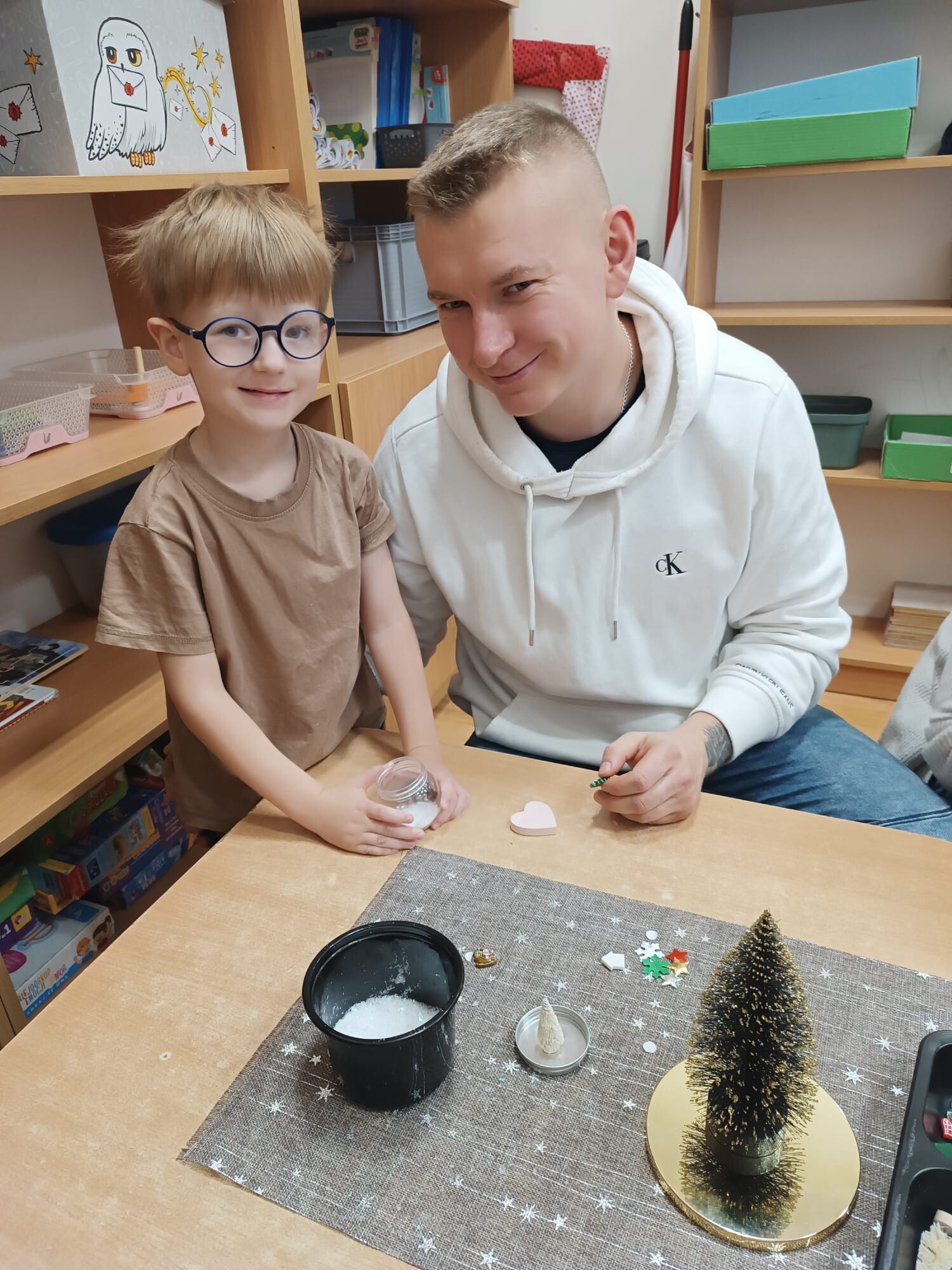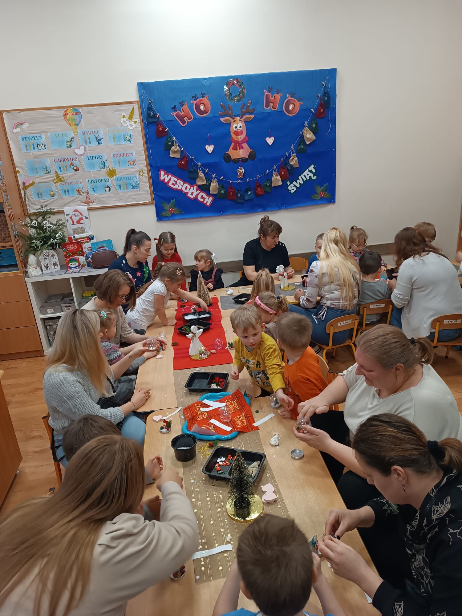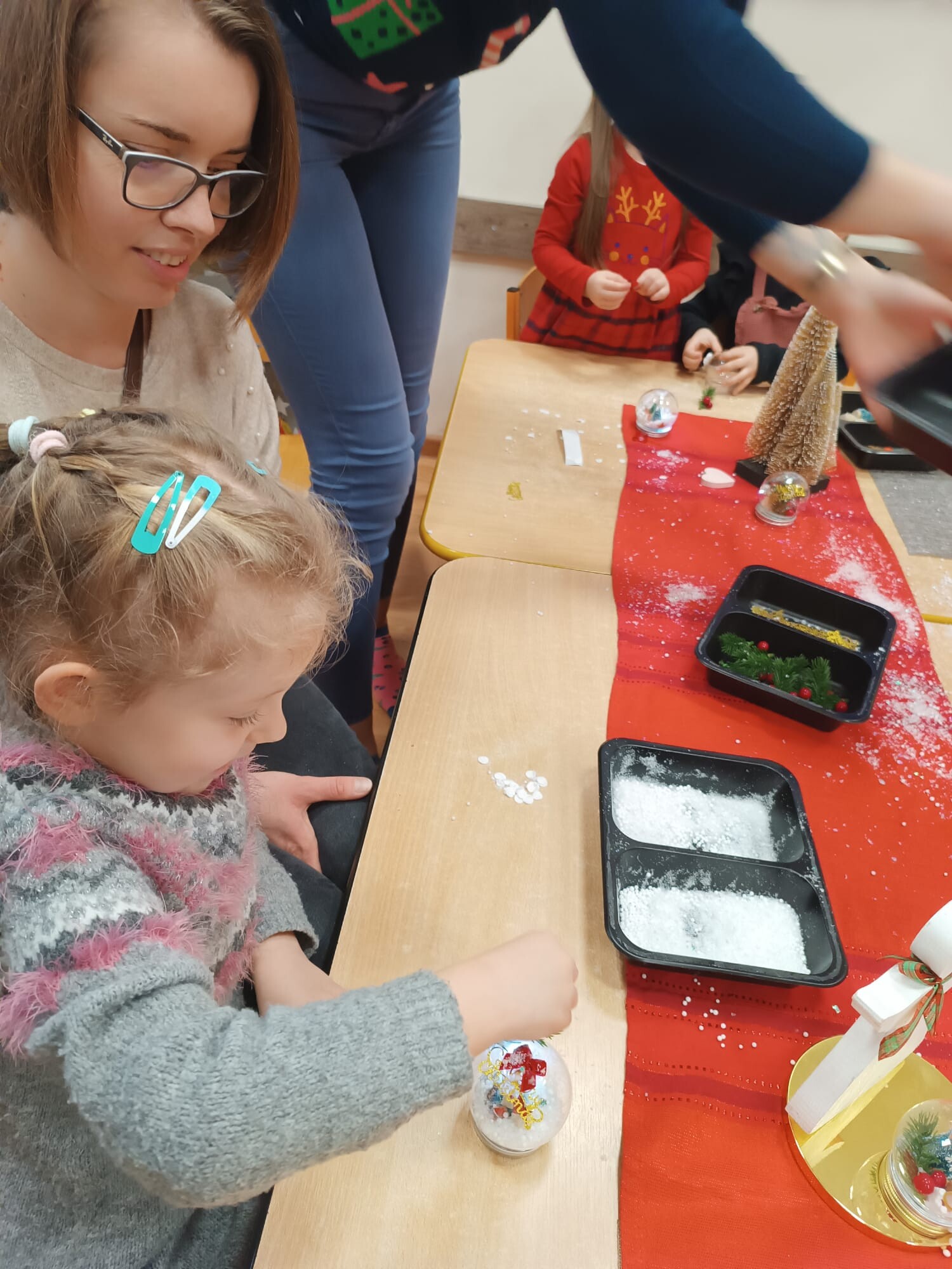 W grupie Kangurki odbyły się świąteczne warsztaty plastyczne. Zadaniem dzieci było wykonanie kuli śnieżnej z przygotowanych wcześniej materiałów. Przedszkolaki wraz z rodzicami, z ogromnym zaangażowaniem i radością tworzyły swoje kreatywne prace.