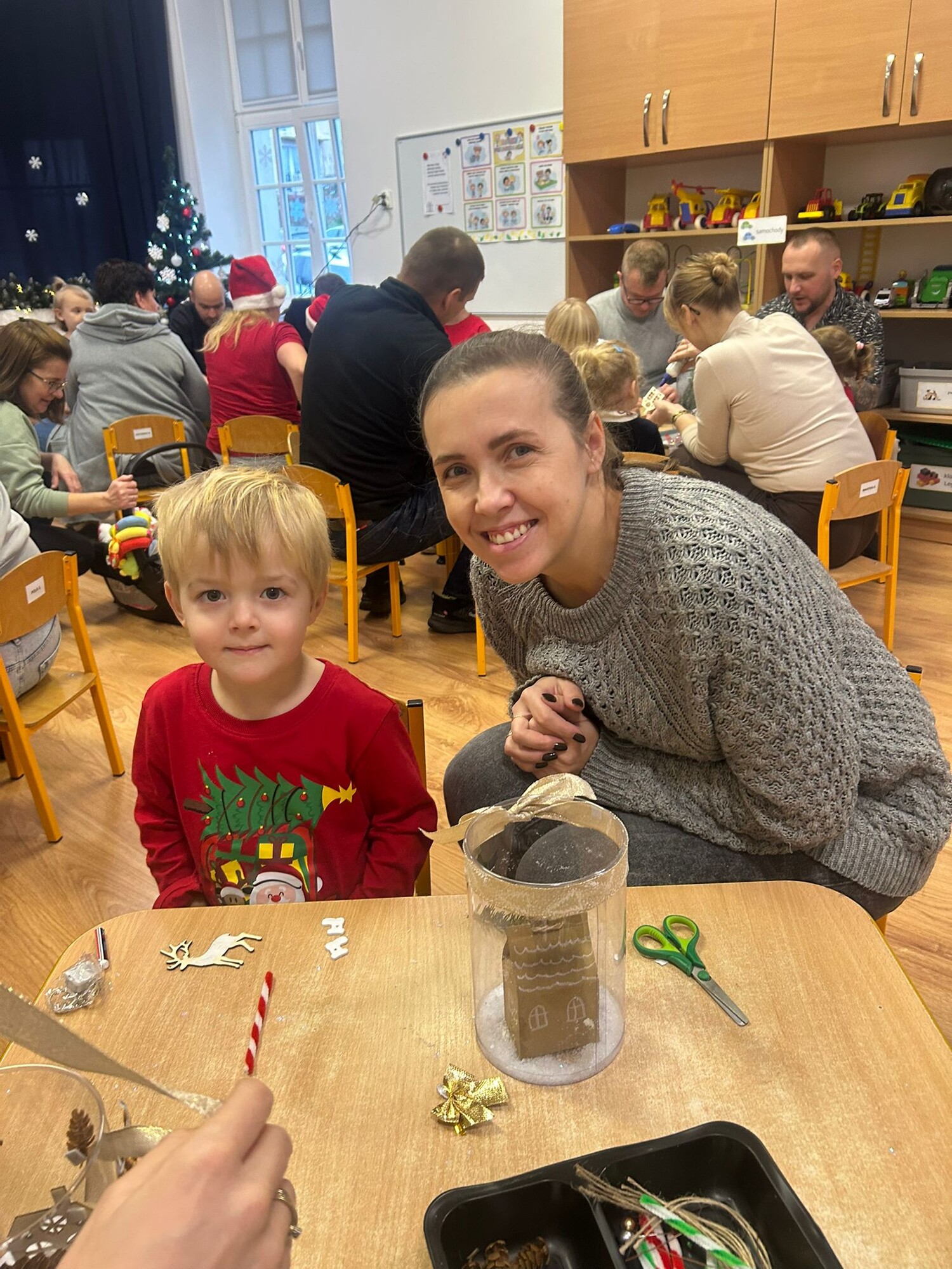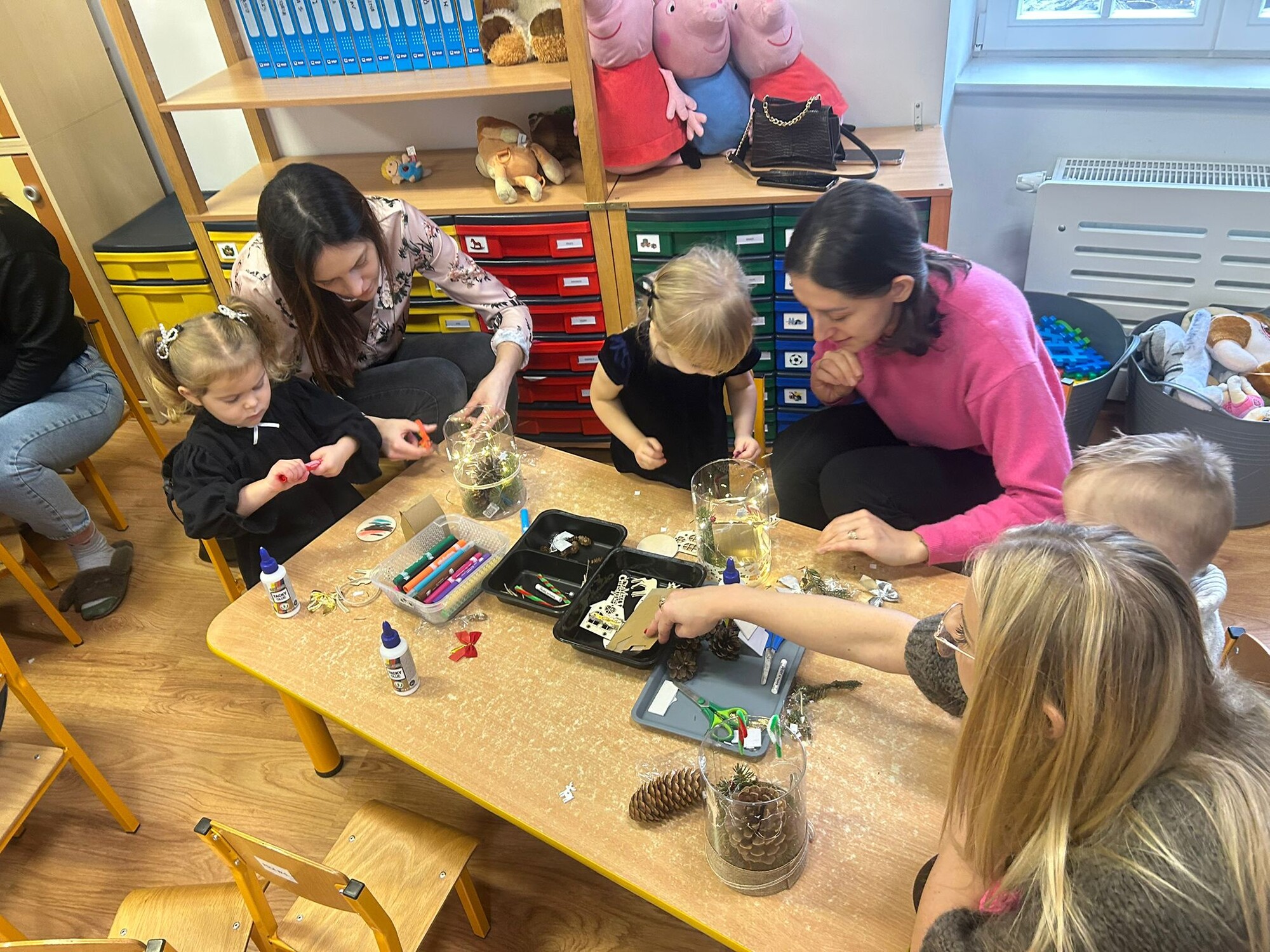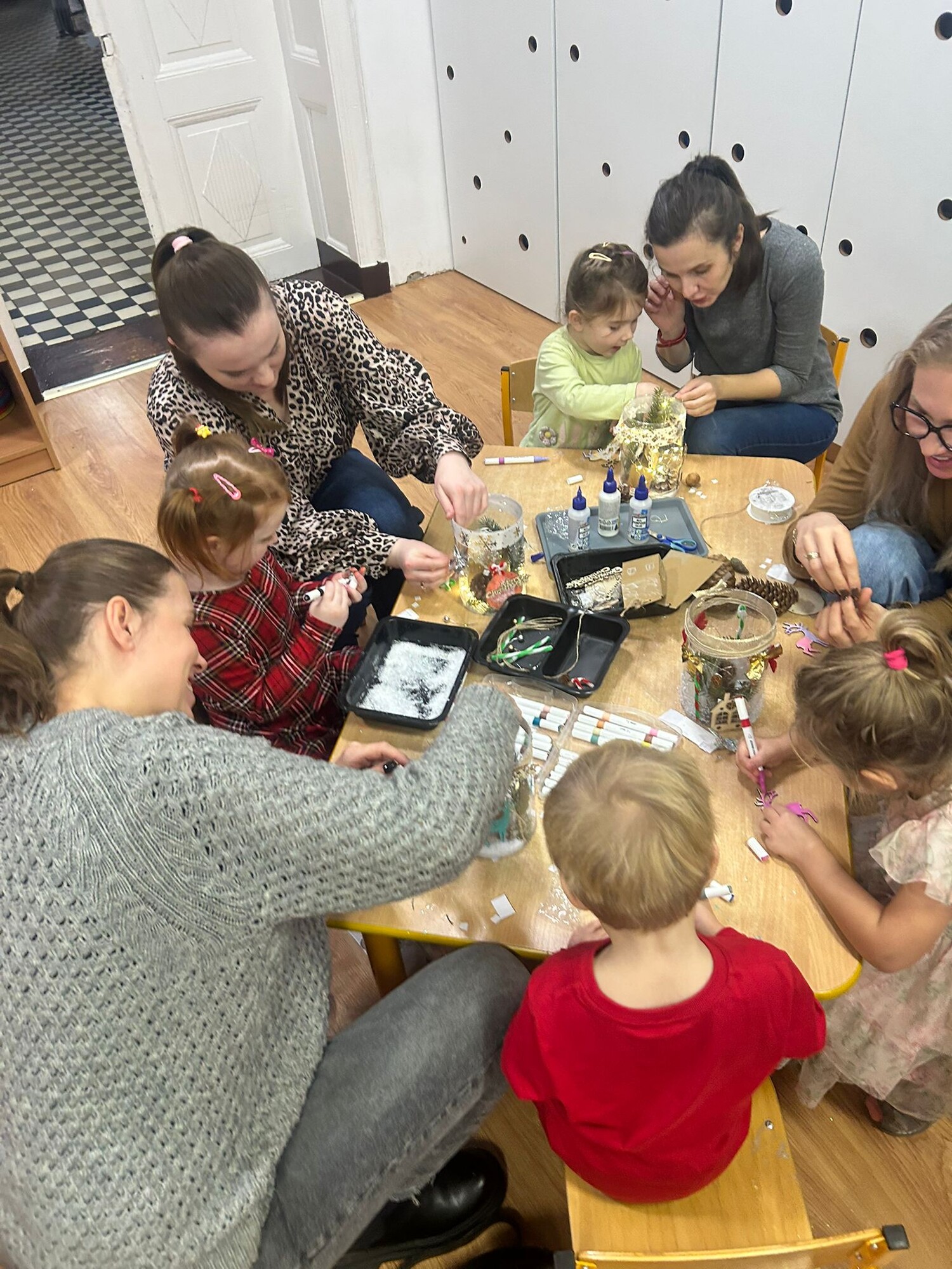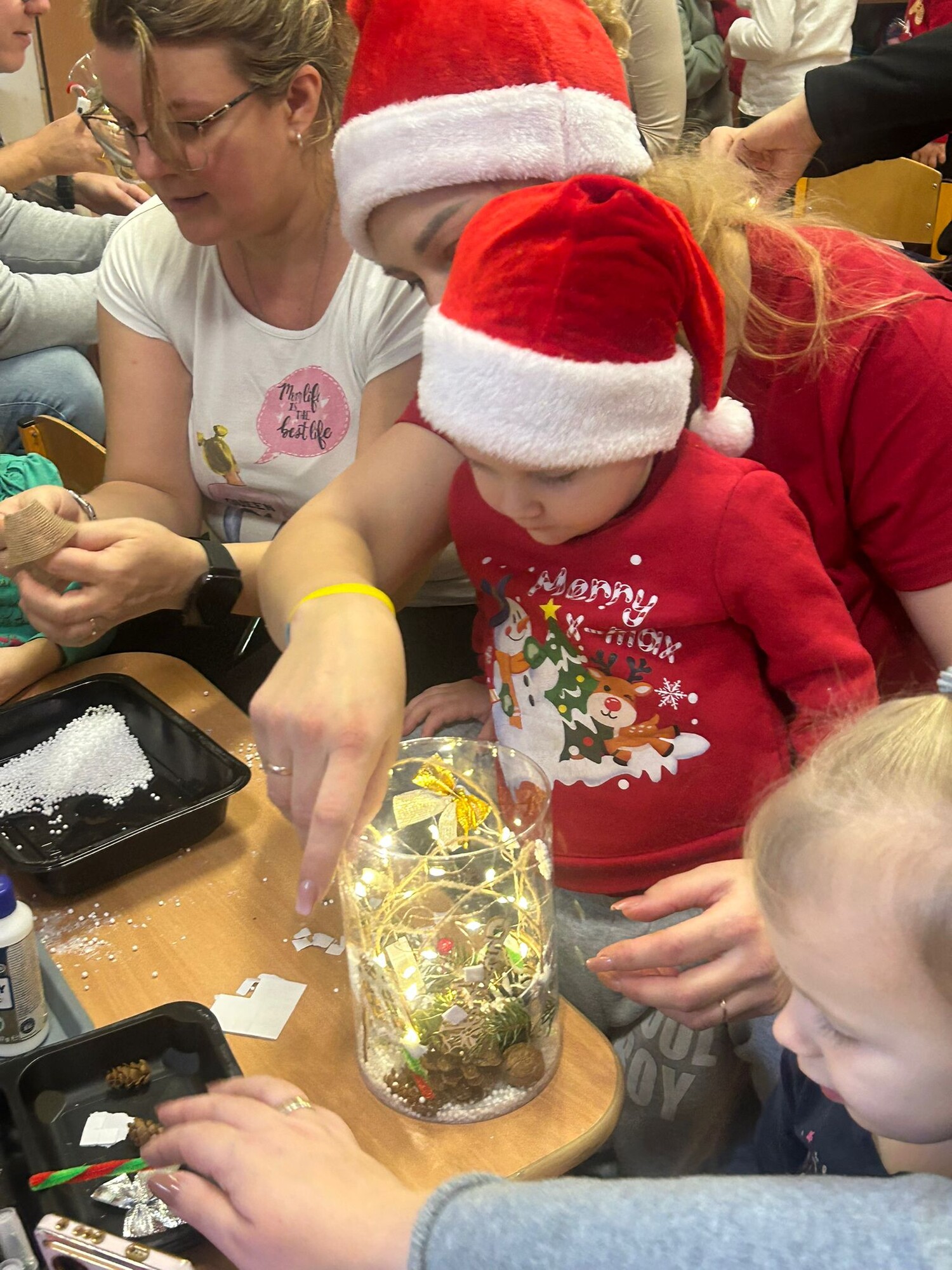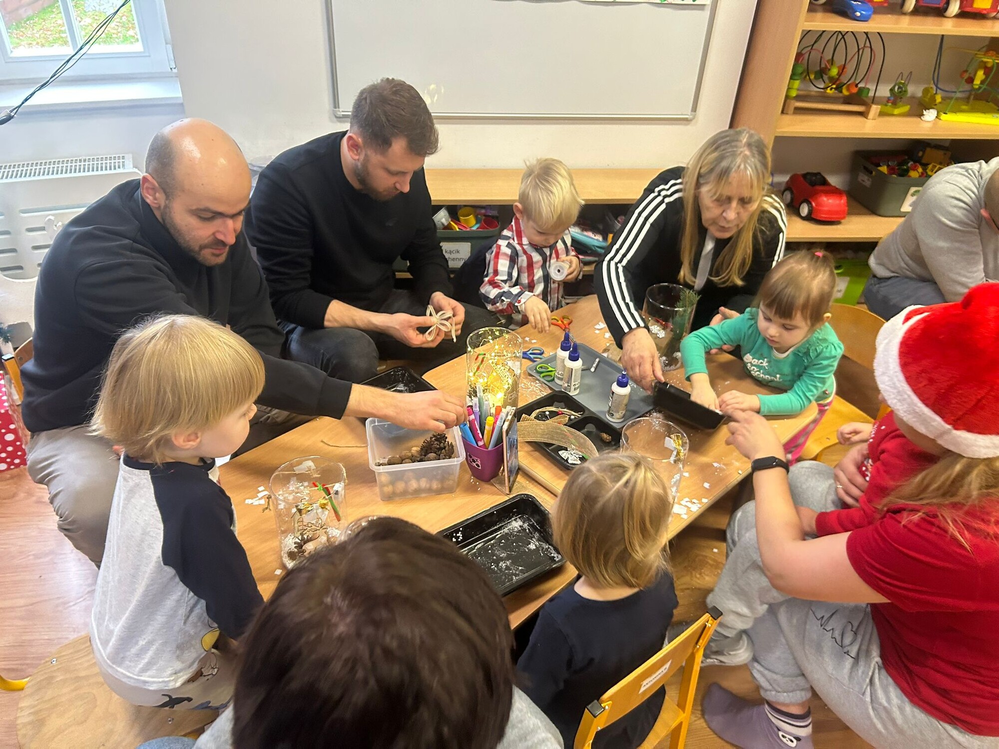 W grupie Misiaki odbyły się świąteczne warsztaty, podczas których dzieci wraz z rodzicami tworzyli własne, wyjątkowe stroiki bożonarodzeniowe. Wykorzystano pachnące gałązki, brokat, kolorowe domki, figurki jelonków oraz delikatne światełka, które dodały dekoracjom świątecznego blasku.
