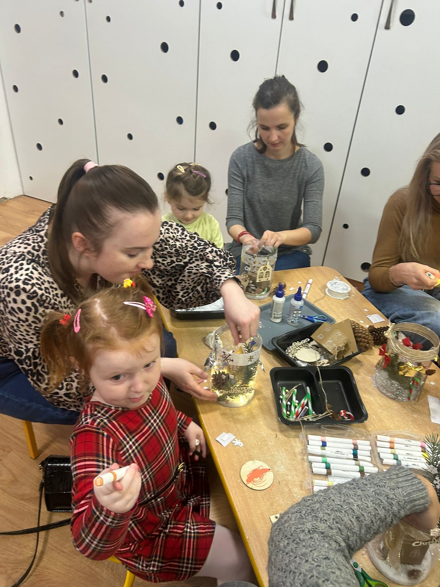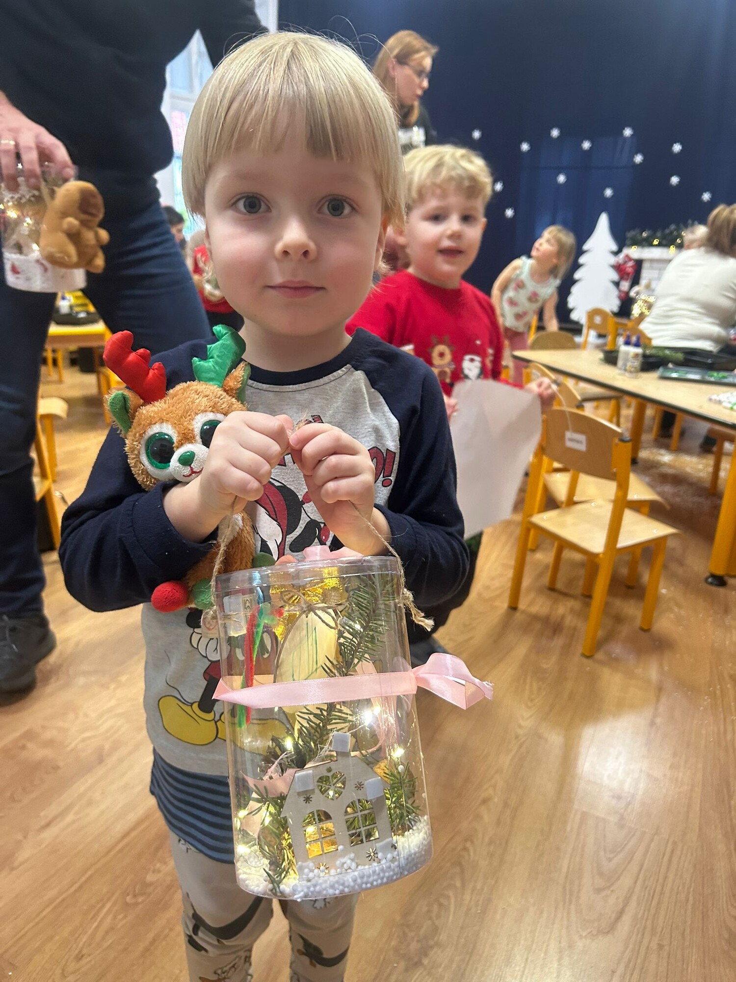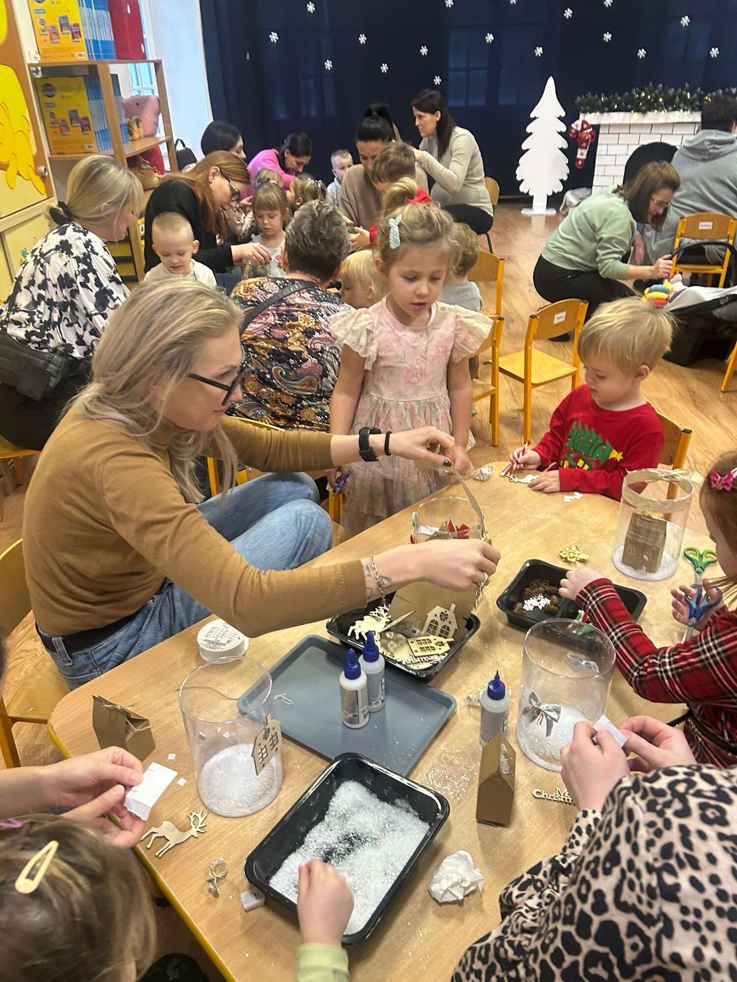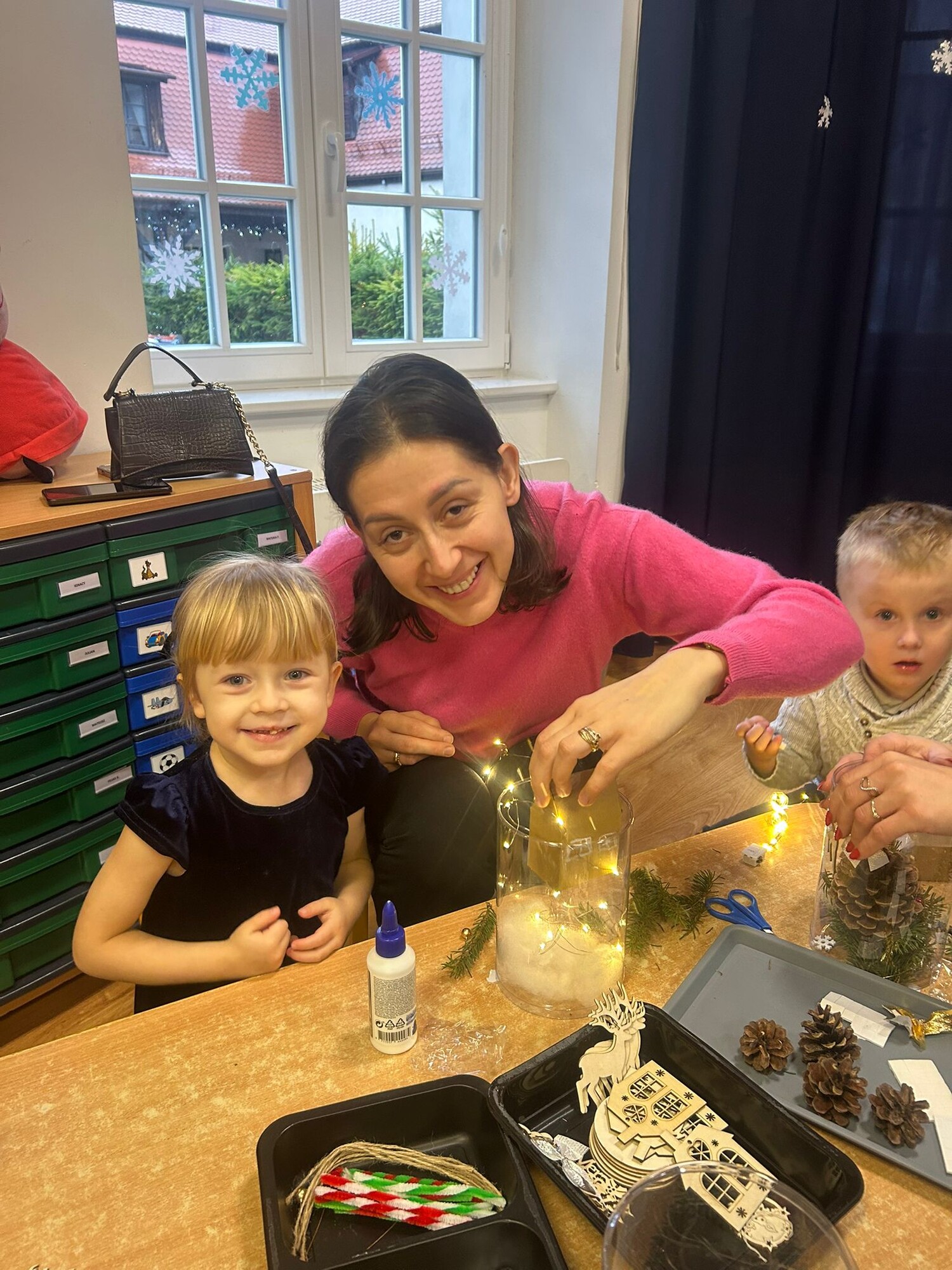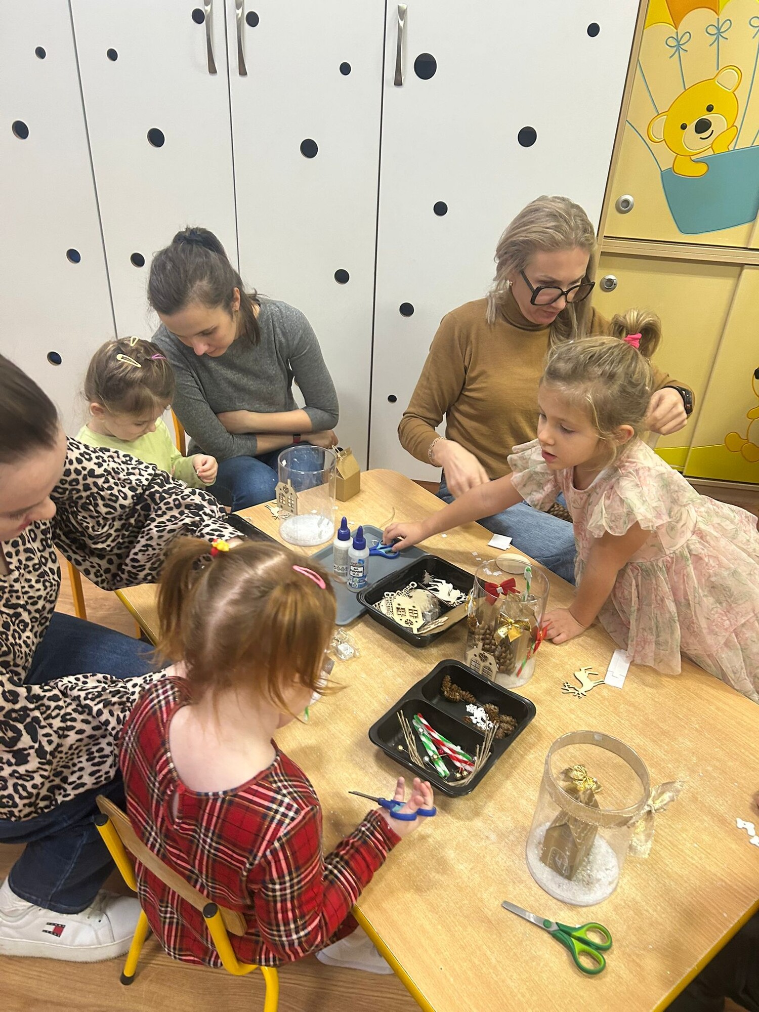 W grupie Misiaki odbyły się świąteczne warsztaty, podczas których dzieci wraz z rodzicami tworzyli własne, wyjątkowe stroiki bożonarodzeniowe. Wykorzystano pachnące gałązki, brokat, kolorowe domki, figurki jelonków oraz delikatne światełka, które dodały dekoracjom świątecznego blasku.