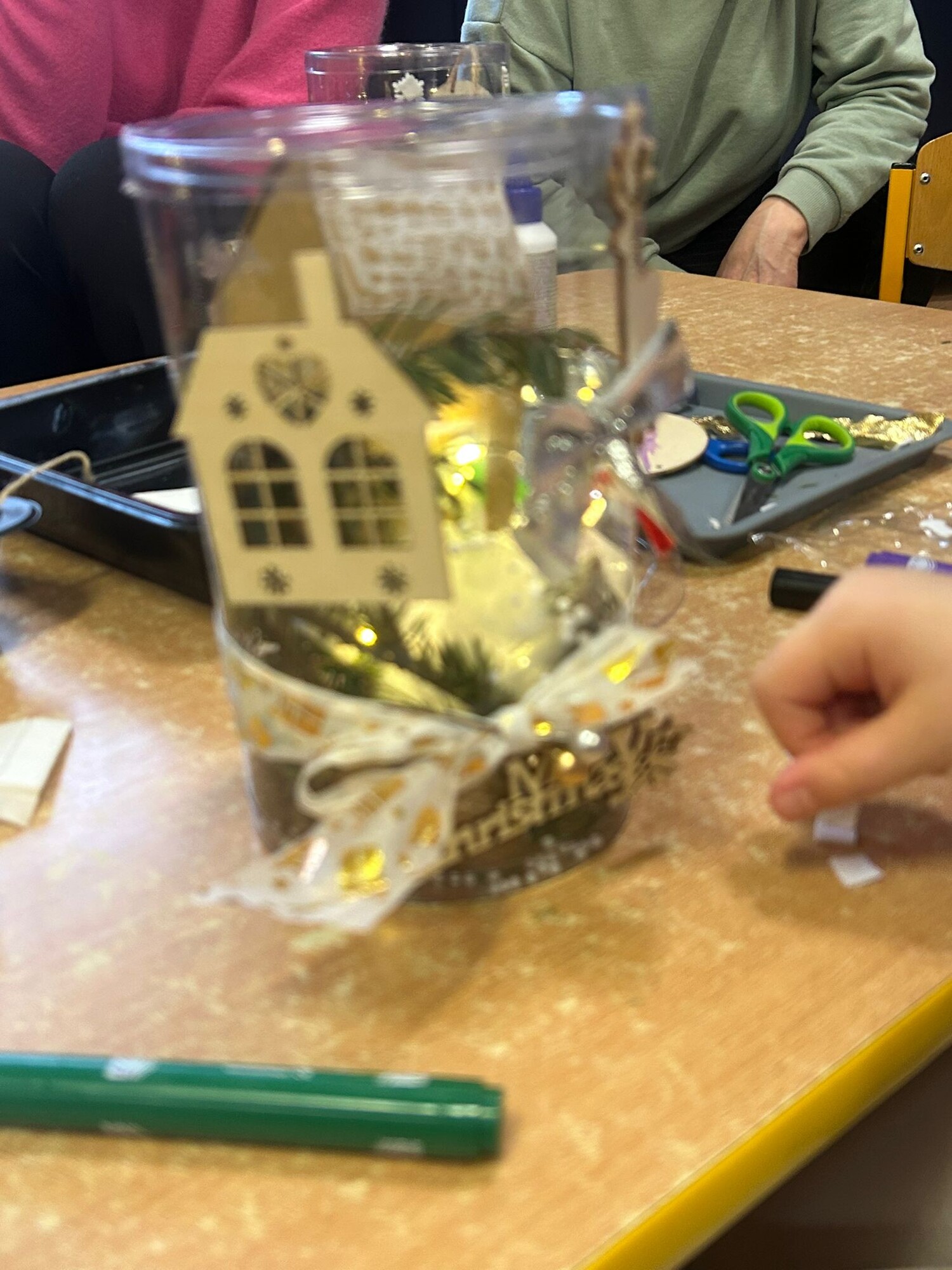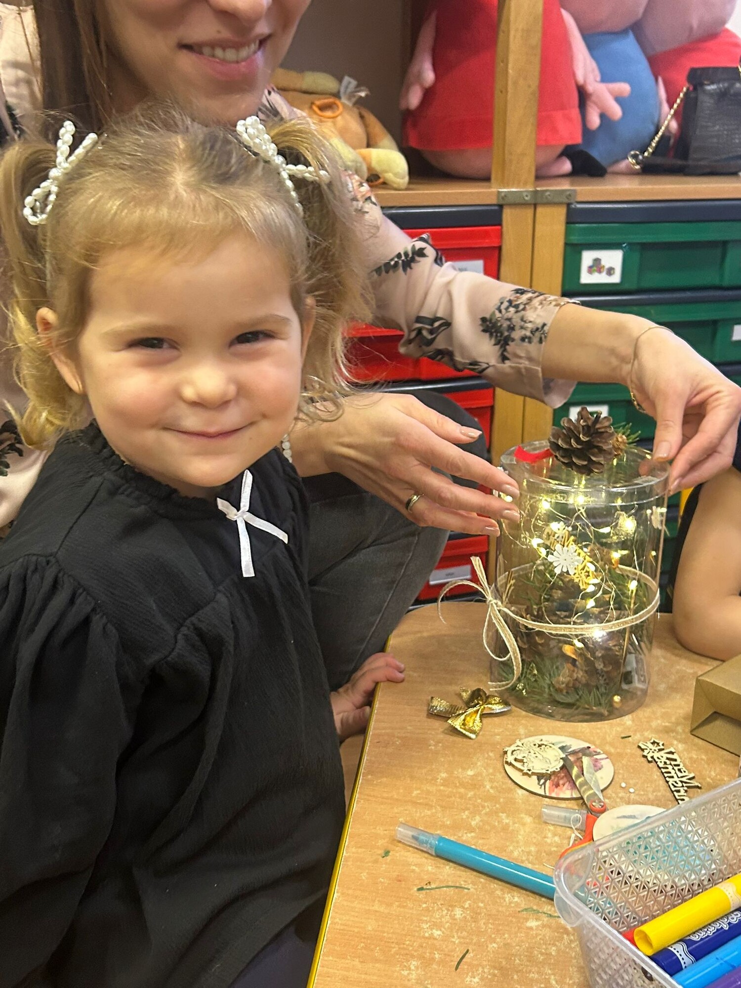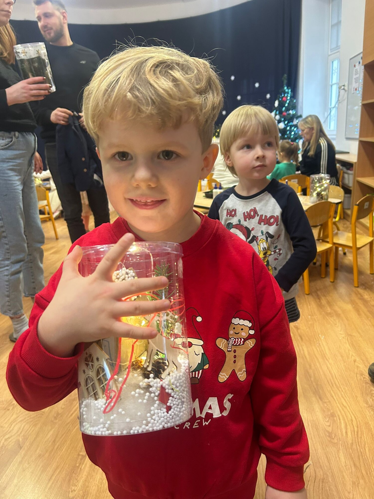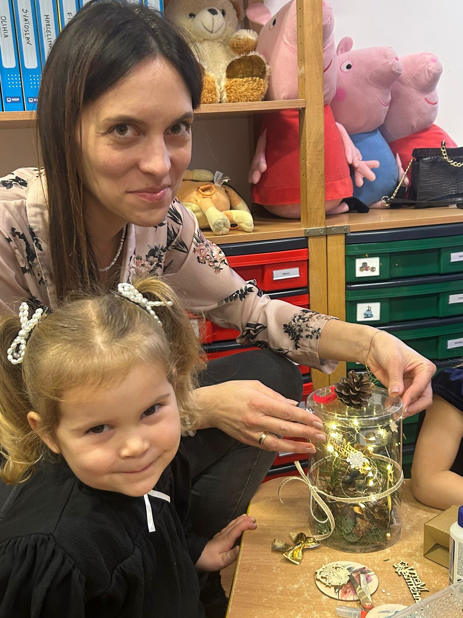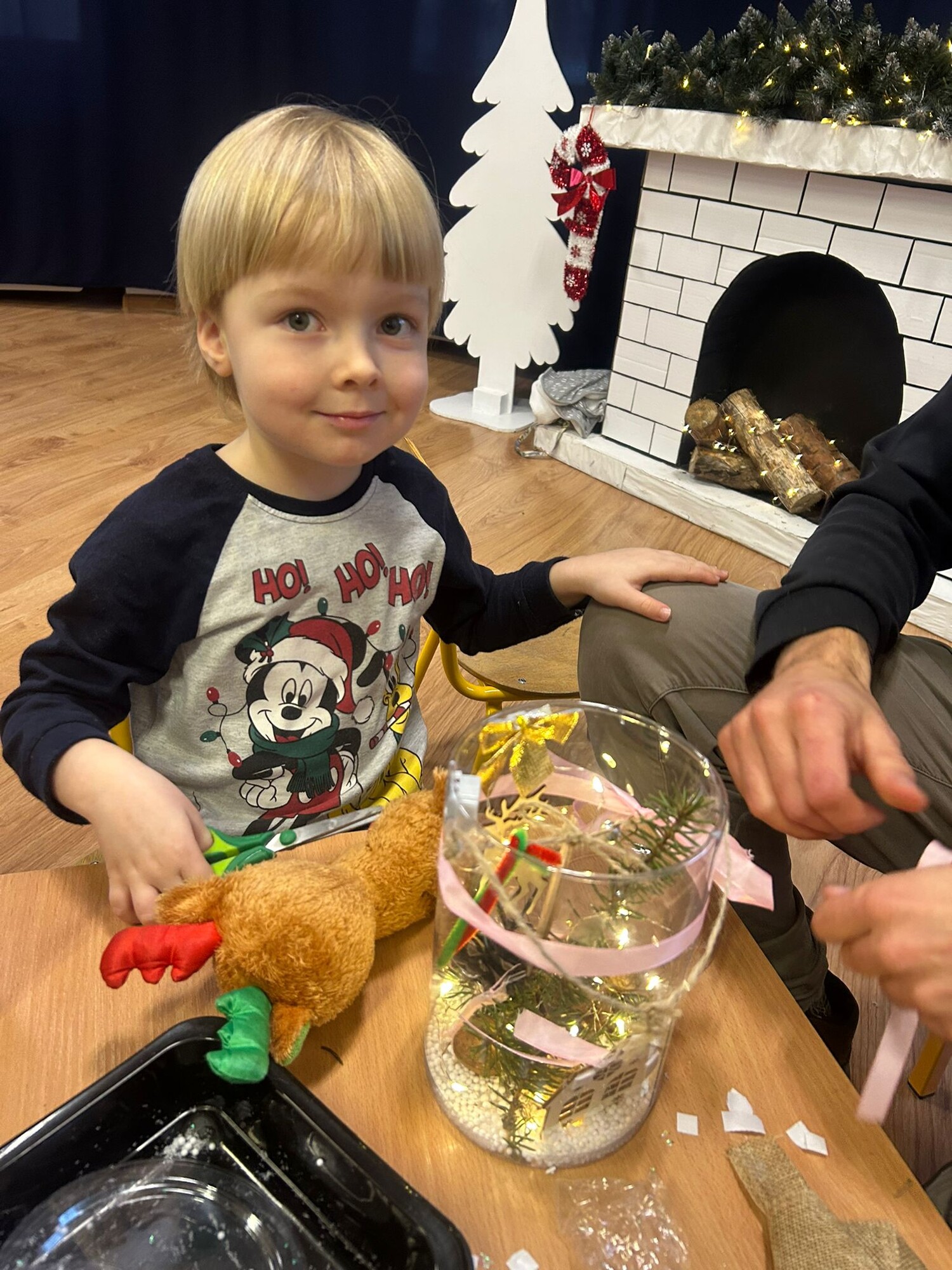 W grupie Misiaki odbyły się świąteczne warsztaty, podczas których dzieci wraz z rodzicami tworzyli własne, wyjątkowe stroiki bożonarodzeniowe. Wykorzystano pachnące gałązki, brokat, kolorowe domki, figurki jelonków oraz delikatne światełka, które dodały dekoracjom świątecznego blasku.