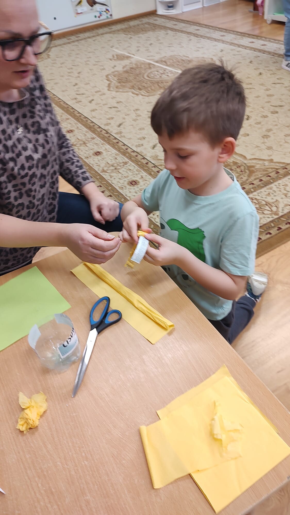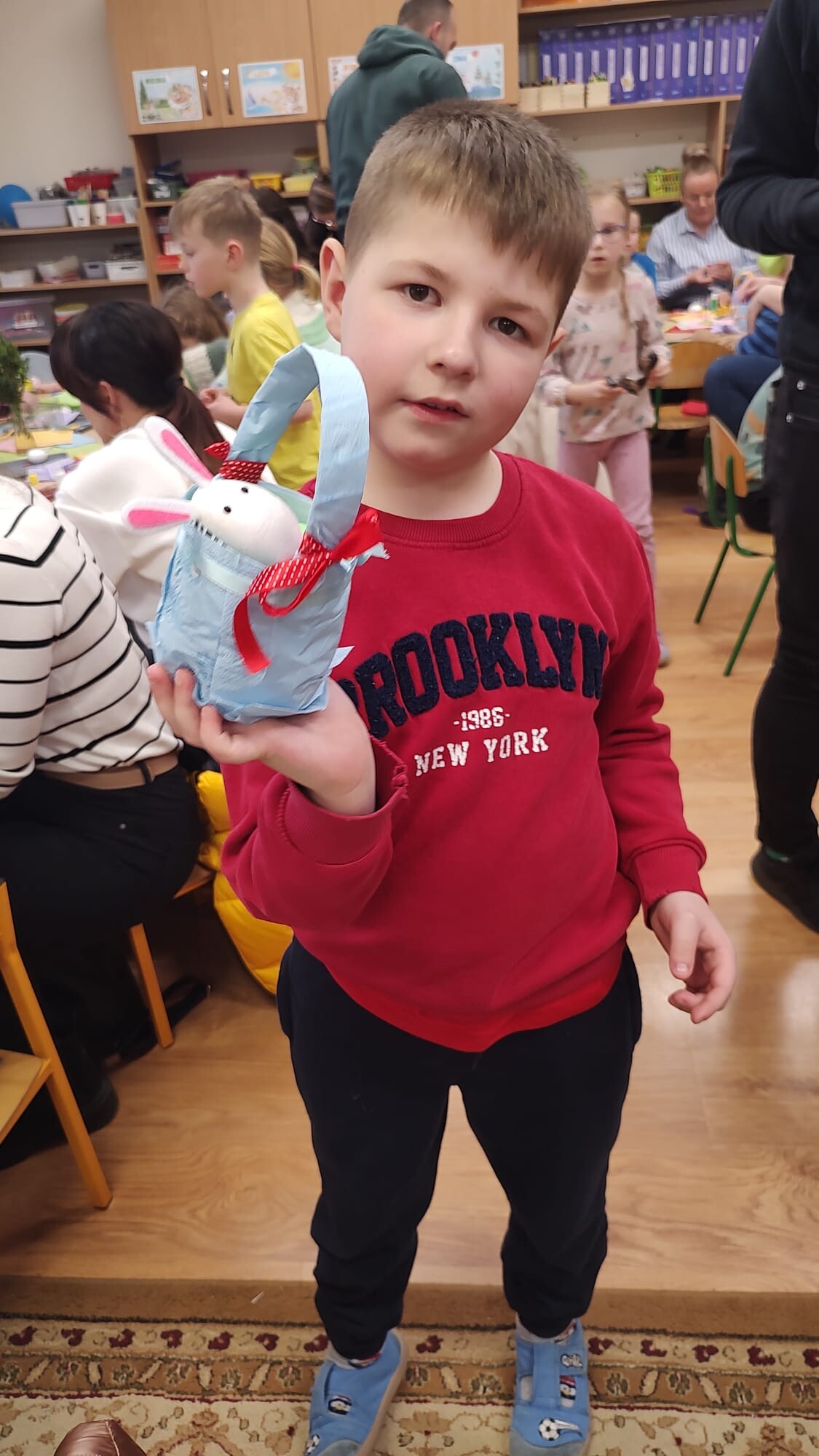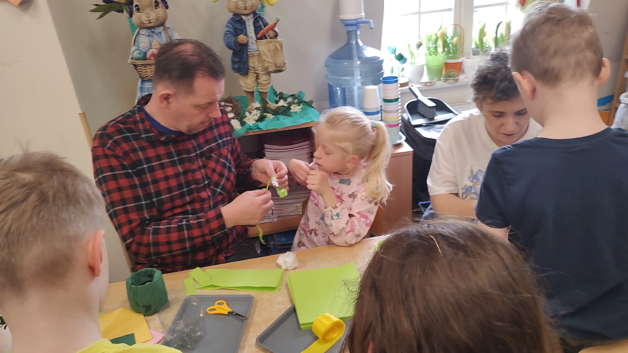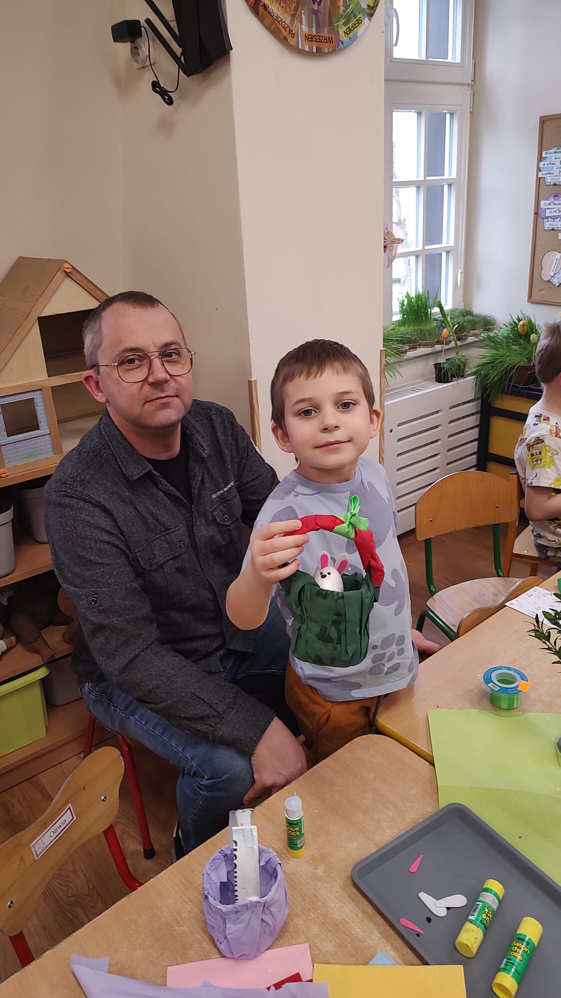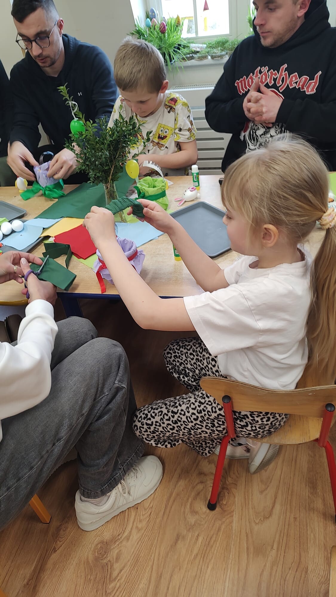 Kolejnym punktem spotkania były warsztaty plastyczne pod hasłem „Ze starego coś nowego”. Dzieci wraz z rodzicami wykonywały wielkanocne koszyczki z plastikowych butelek, rozwijając swoją kreatywność oraz ucząc się idei recyklingu. Powstałe prace były kolorowe, pomysłowe i stanowiły piękną ozdobę świąteczną.