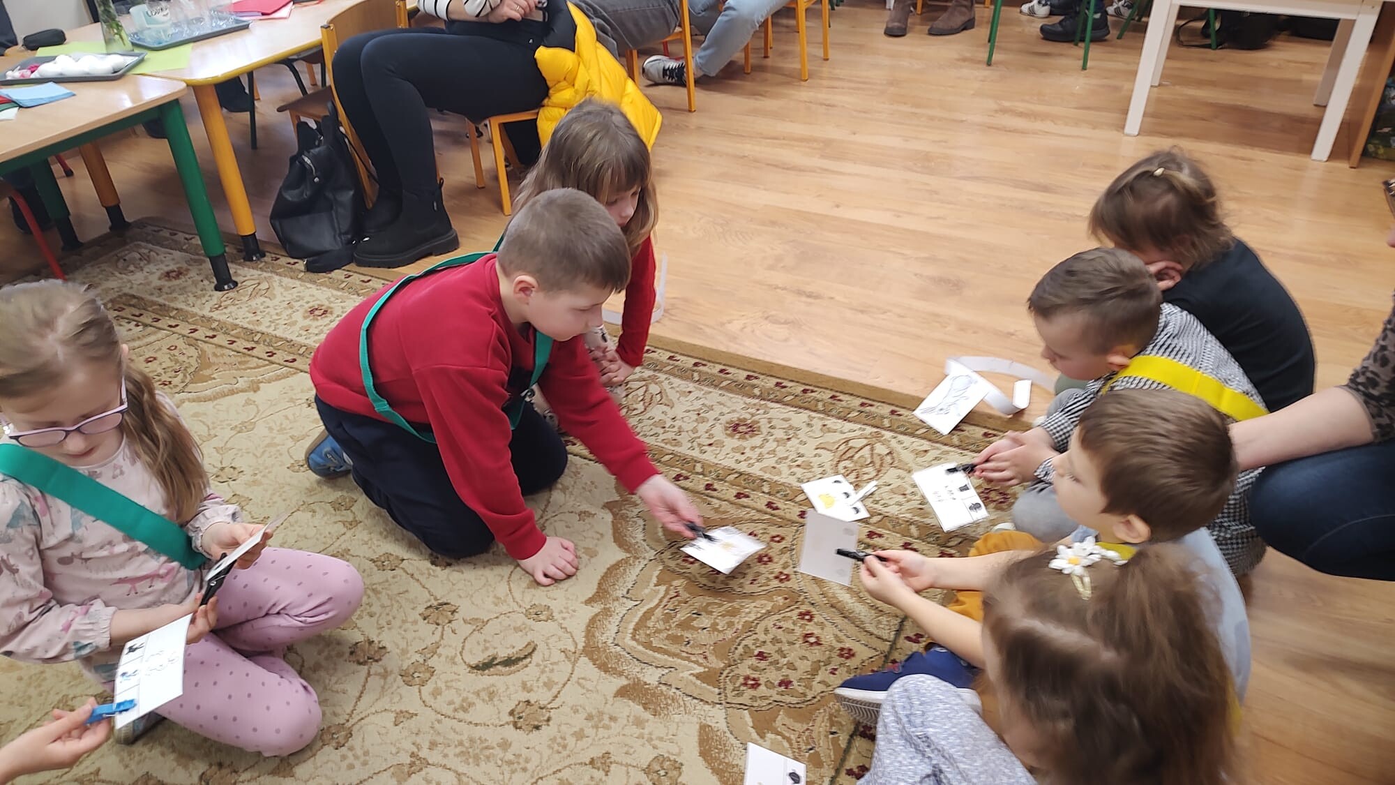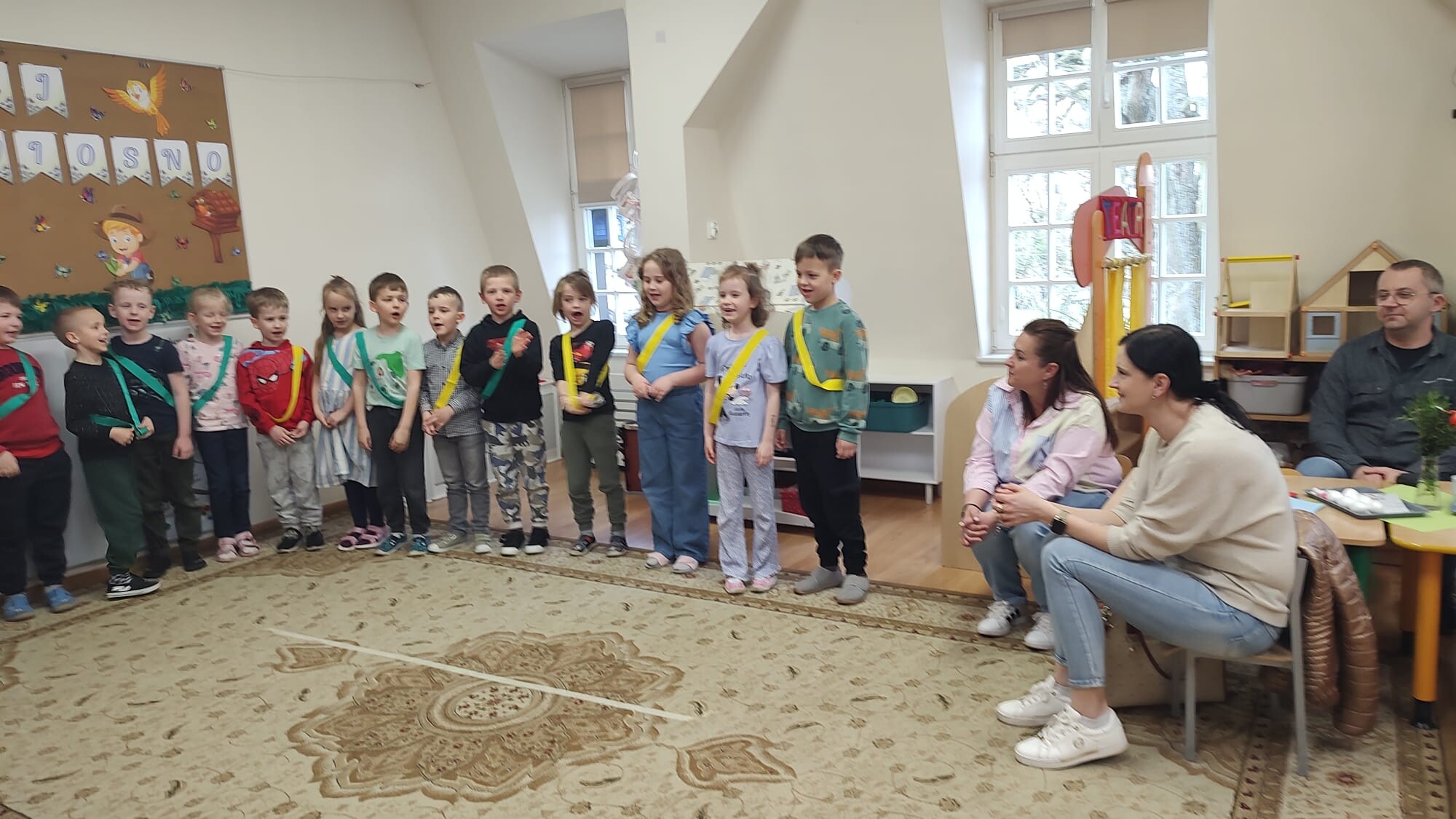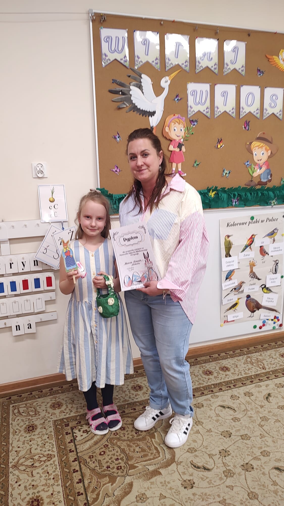 Następnie przedszkolaki wzięły udział we wspólnych zabawach dydaktycznych. Przygotowane aktywności miały na celu rozwijanie współpracy, spostrzegawczości oraz wiedzy o tradycjach wielkanocnych. Za aktywny udział i zaangażowanie dzieci zdobywały specjalne wyróżnienie – dyplom „Pomocnika Zajączka”, co było dla nich ogromną motywacją i powodem do dumy.