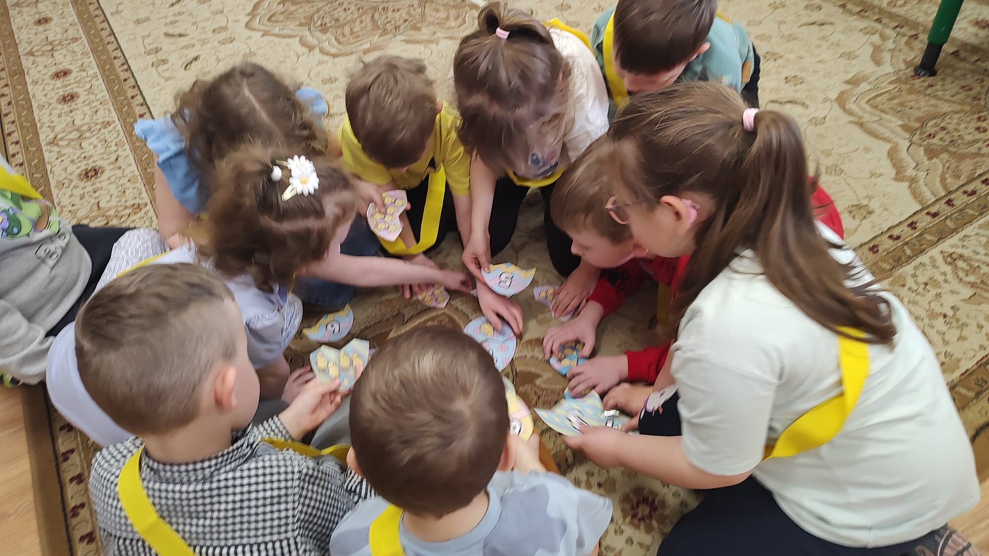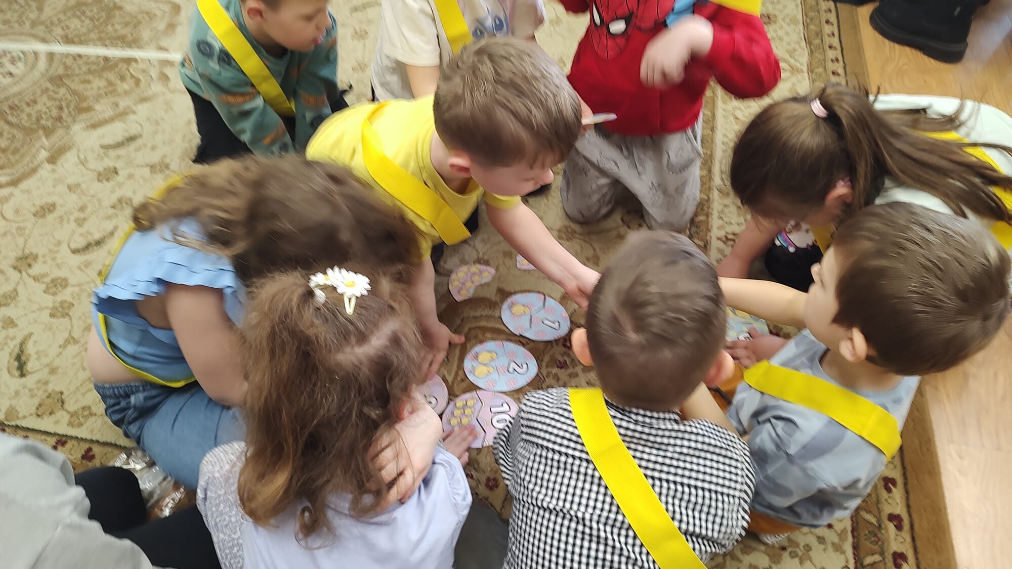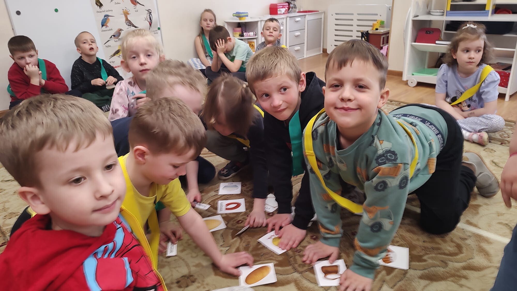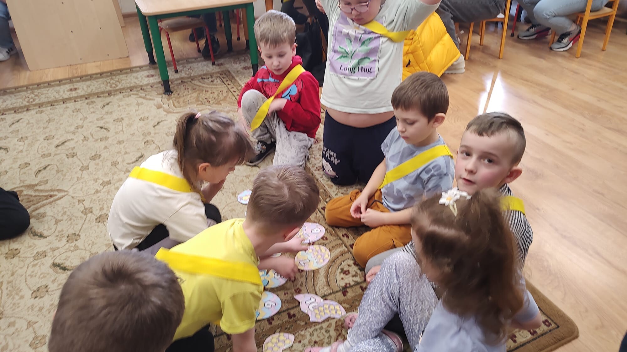 Następnie przedszkolaki wzięły udział we wspólnych zabawach dydaktycznych. Przygotowane aktywności miały na celu rozwijanie współpracy, spostrzegawczości oraz wiedzy o tradycjach wielkanocnych. Za aktywny udział i zaangażowanie dzieci zdobywały specjalne wyróżnienie – dyplom „Pomocnika Zajączka”, co było dla nich ogromną motywacją i powodem do dumy.