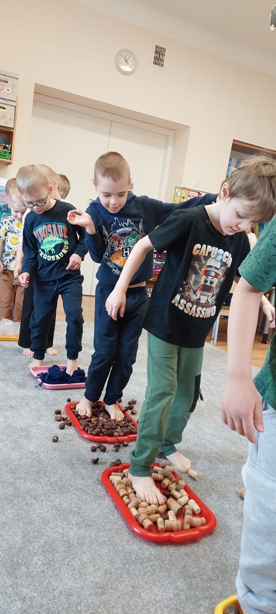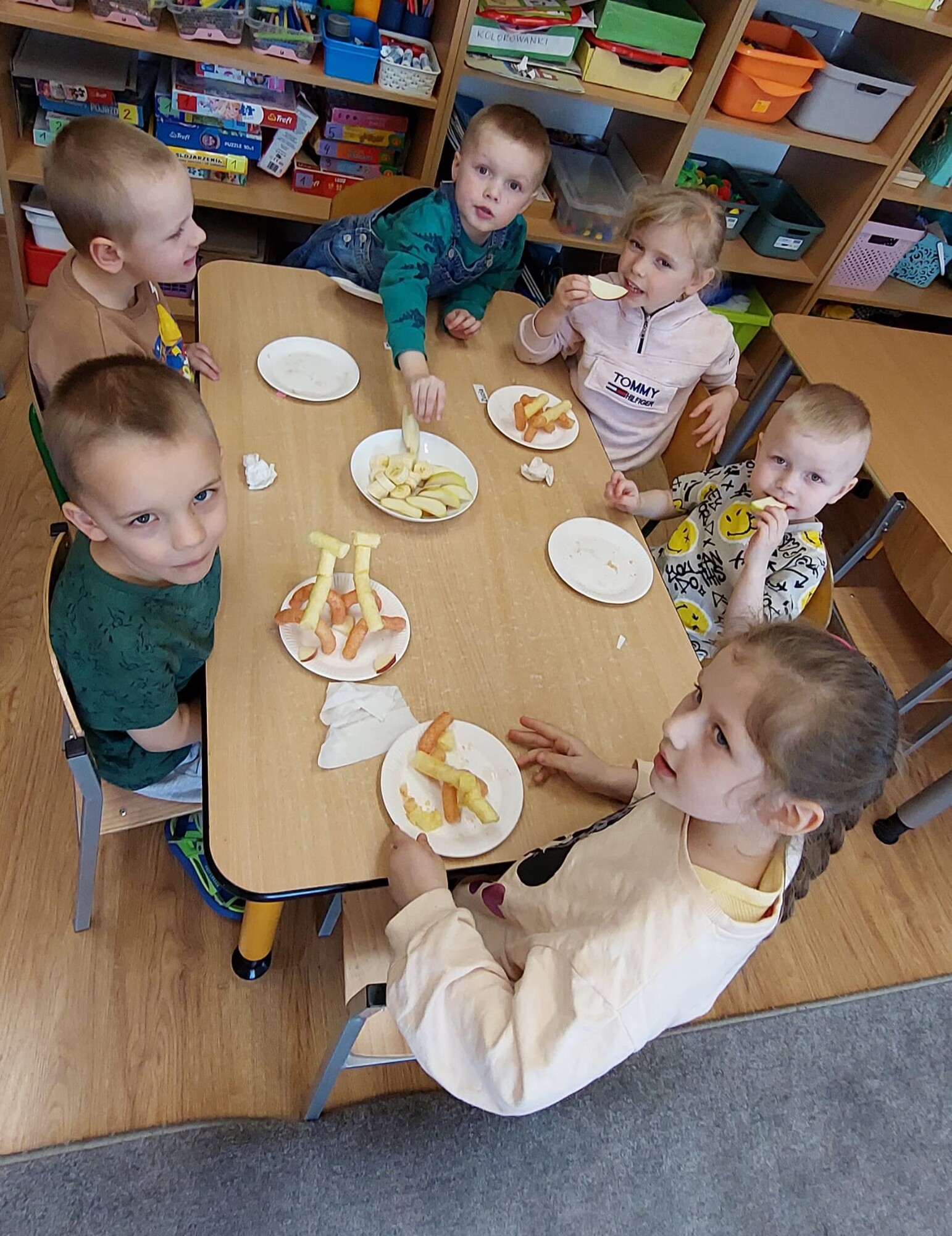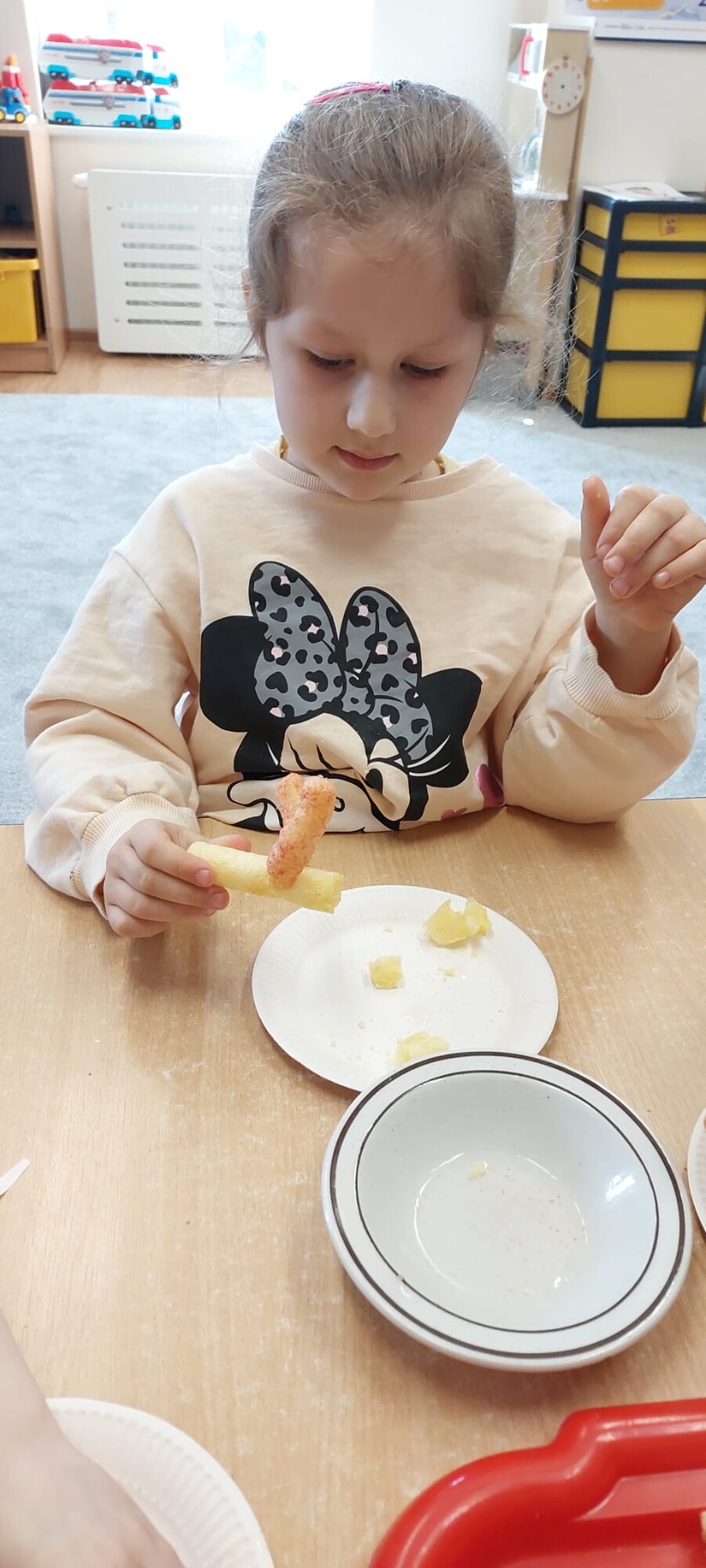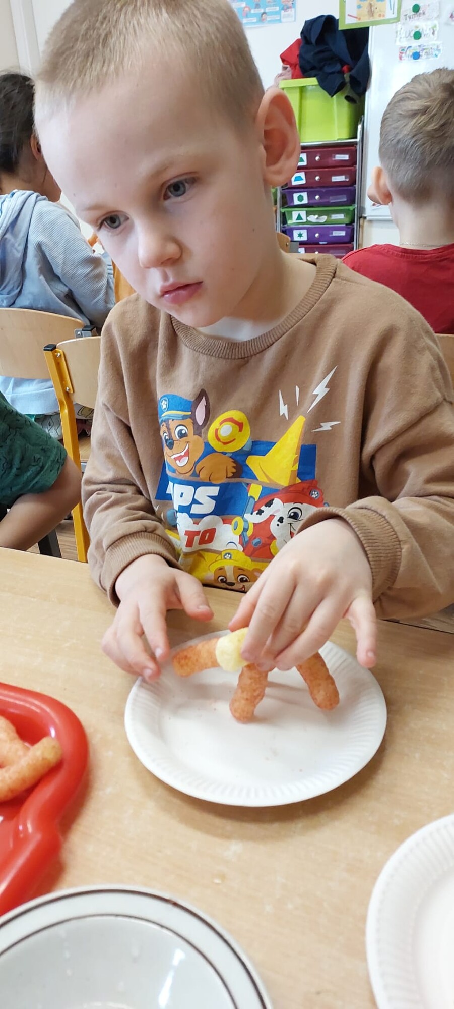 Dzieci z grupy „Biedronki” poznawały świat poprzez różnorodne doświadczenia angażujące zmysły: dotyk, słuch, smak, wzrok i węch. Podczas zajęć badały różne faktury, rozpoznawały zapachy owoców oraz próbowały ich smaku, rozwijając swoją wrażliwość sensoryczną.