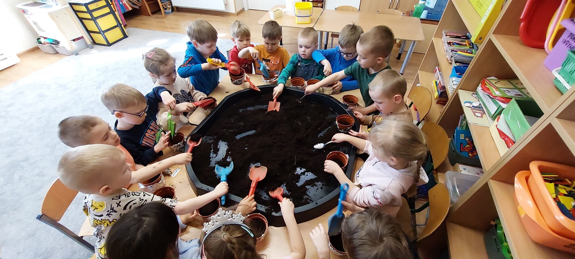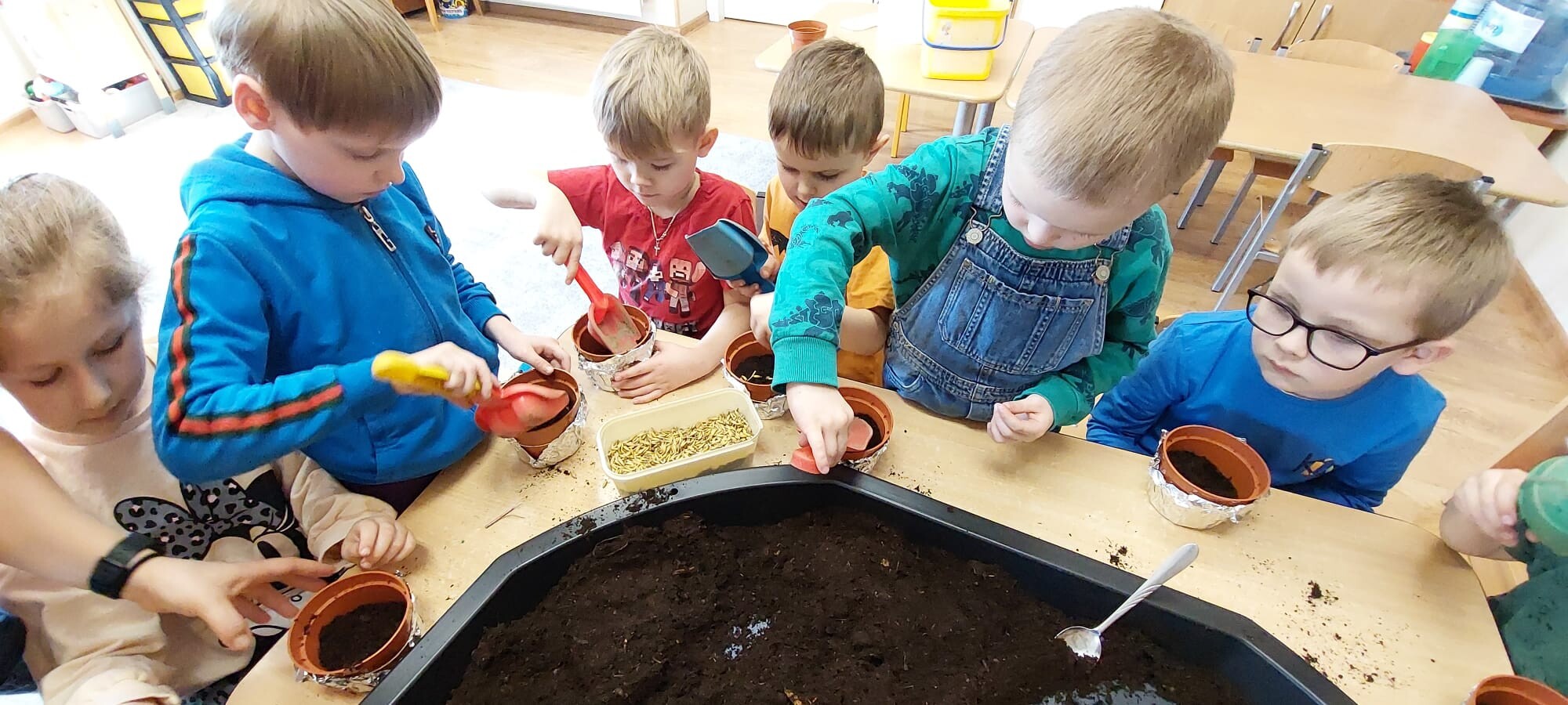 Przedszkolaki z zaangażowaniem uczestniczyły także w działaniach twórczych, konstruując zwierzęta ze smakowych chrupek. Dodatkowo poznawały strukturę ziaren owsa podczas ich wysiewu do doniczek, przygotowując rośliny na wielkanocny stół.