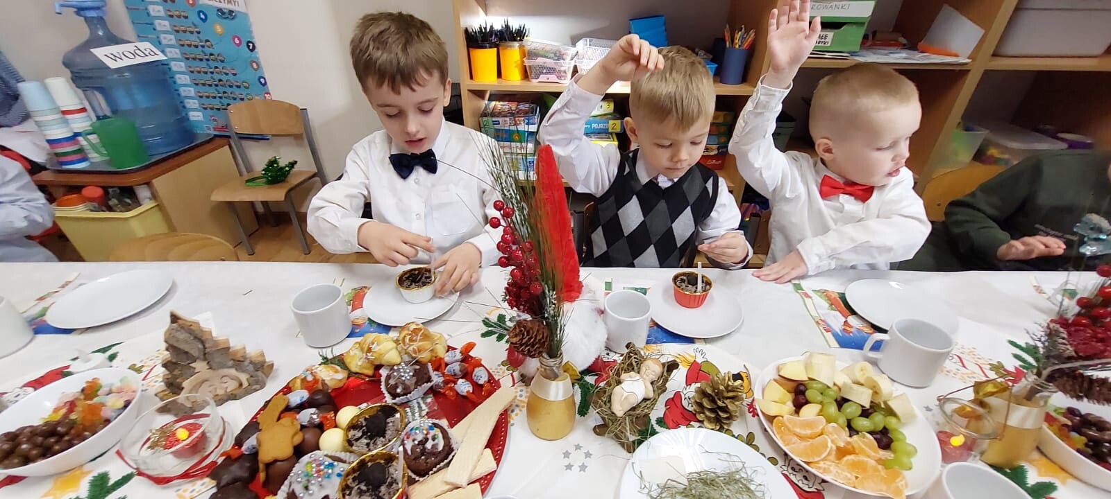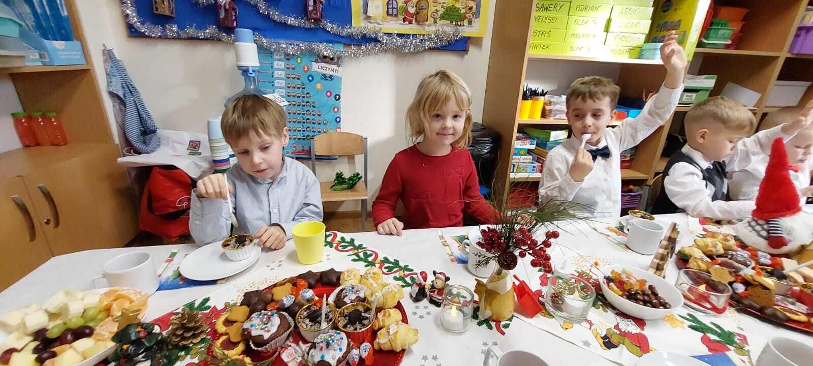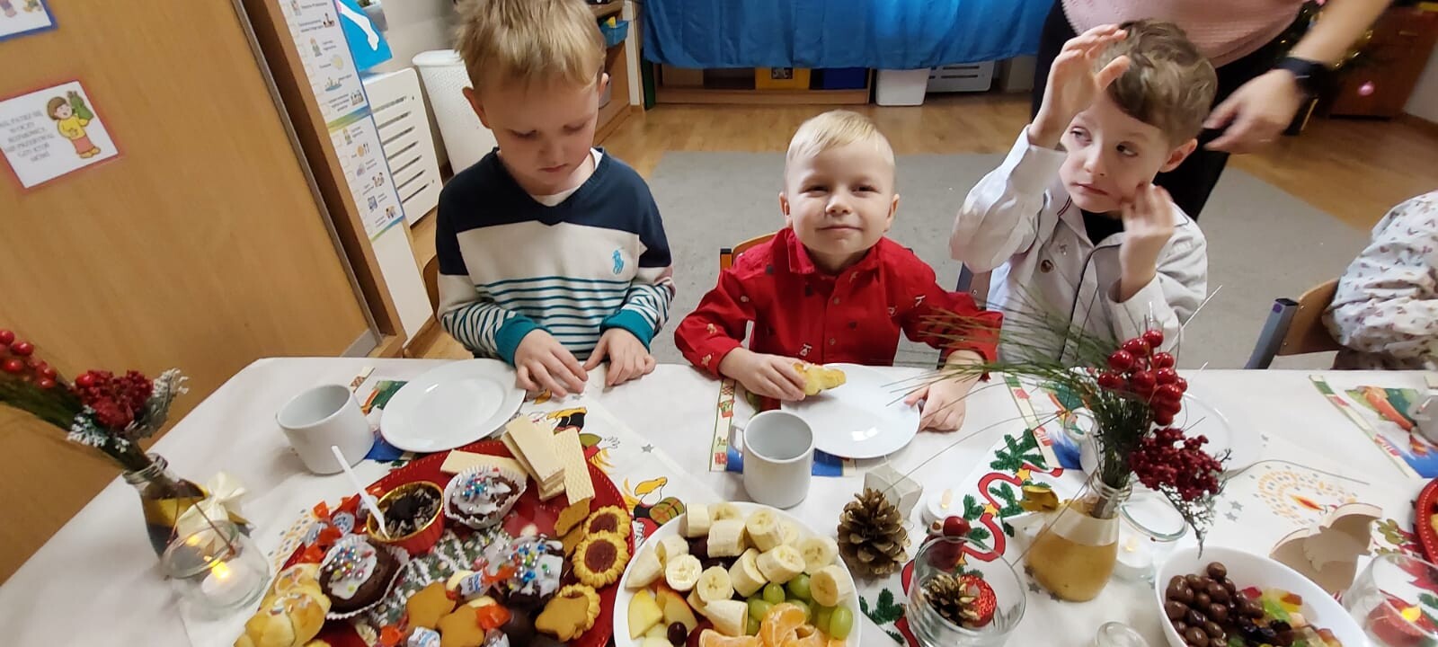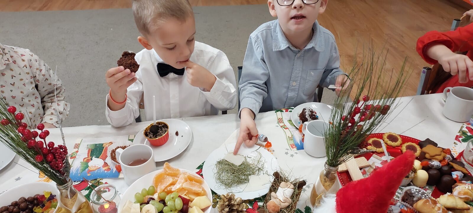 Po tej wyjątkowej części przedszkolaki zasiadły do wspólnego stołu, aby spróbować słodkości przygotowanych przez rodziców. Był to czas budowania poczucia wspólnoty oraz poznawania i pielęgnowania bożonarodzeniowych zwyczajów.