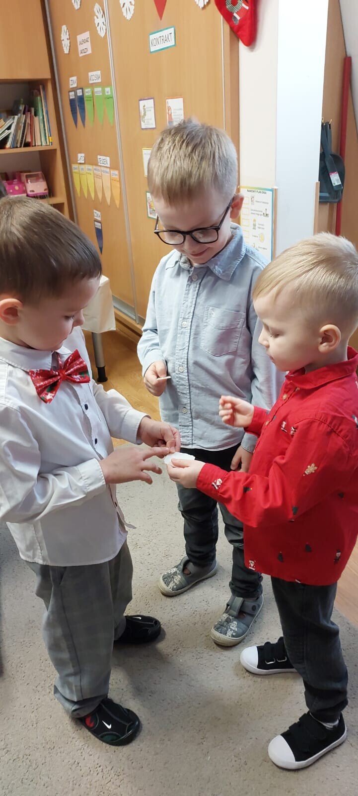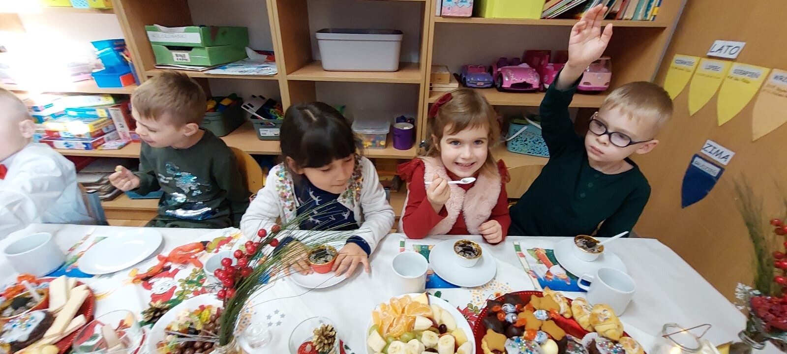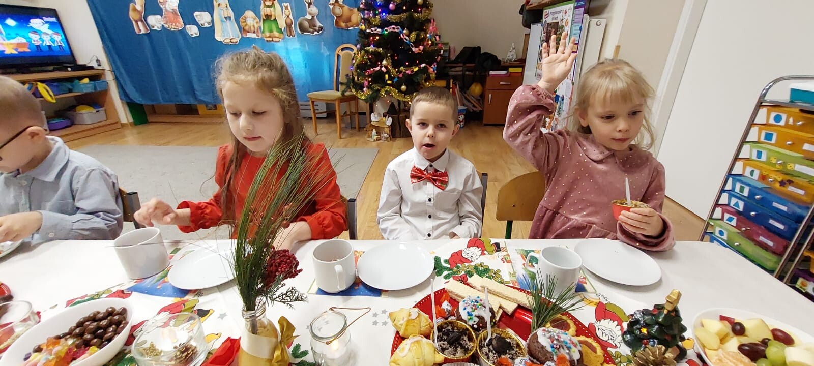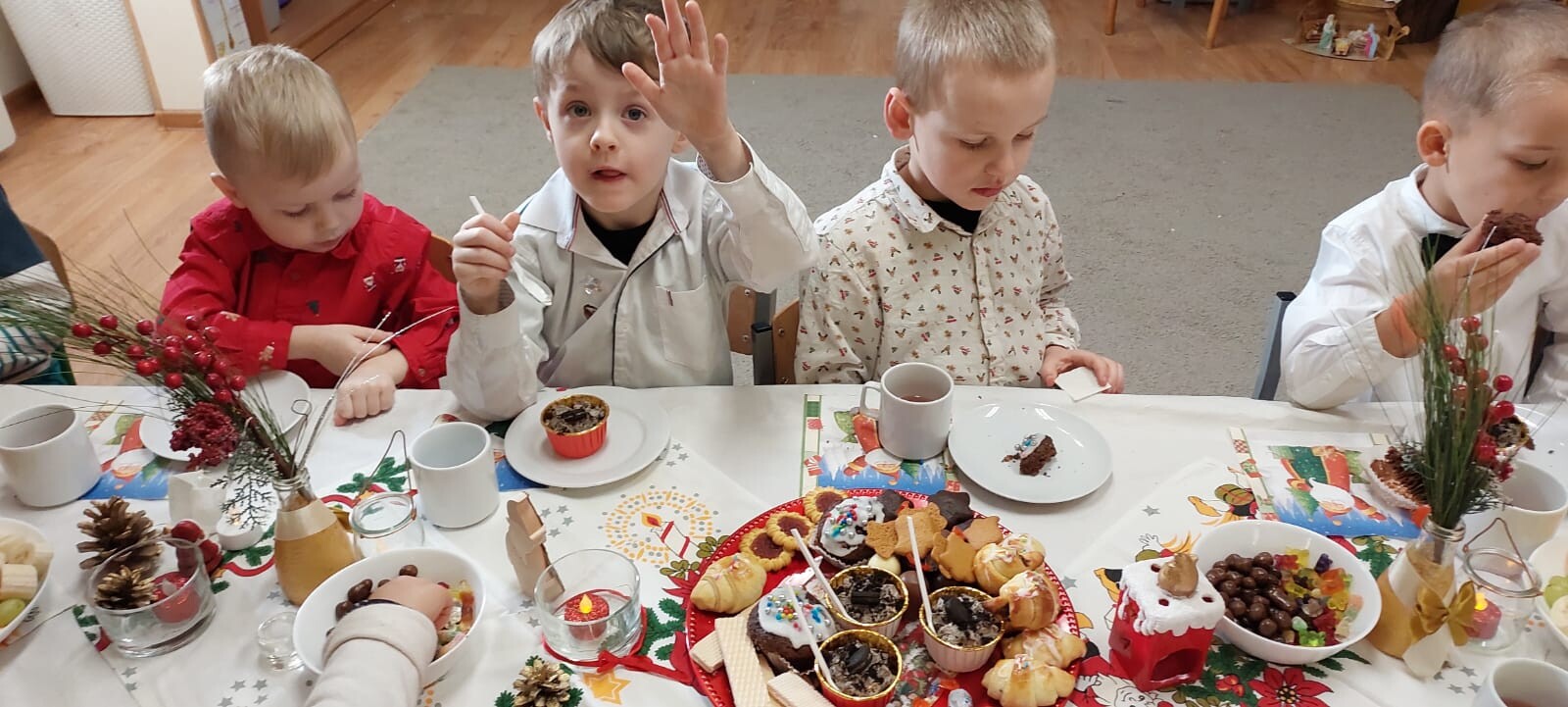 Po tej wyjątkowej części przedszkolaki zasiadły do wspólnego stołu, aby spróbować słodkości przygotowanych przez rodziców. Był to czas budowania poczucia wspólnoty oraz poznawania i pielęgnowania bożonarodzeniowych zwyczajów.