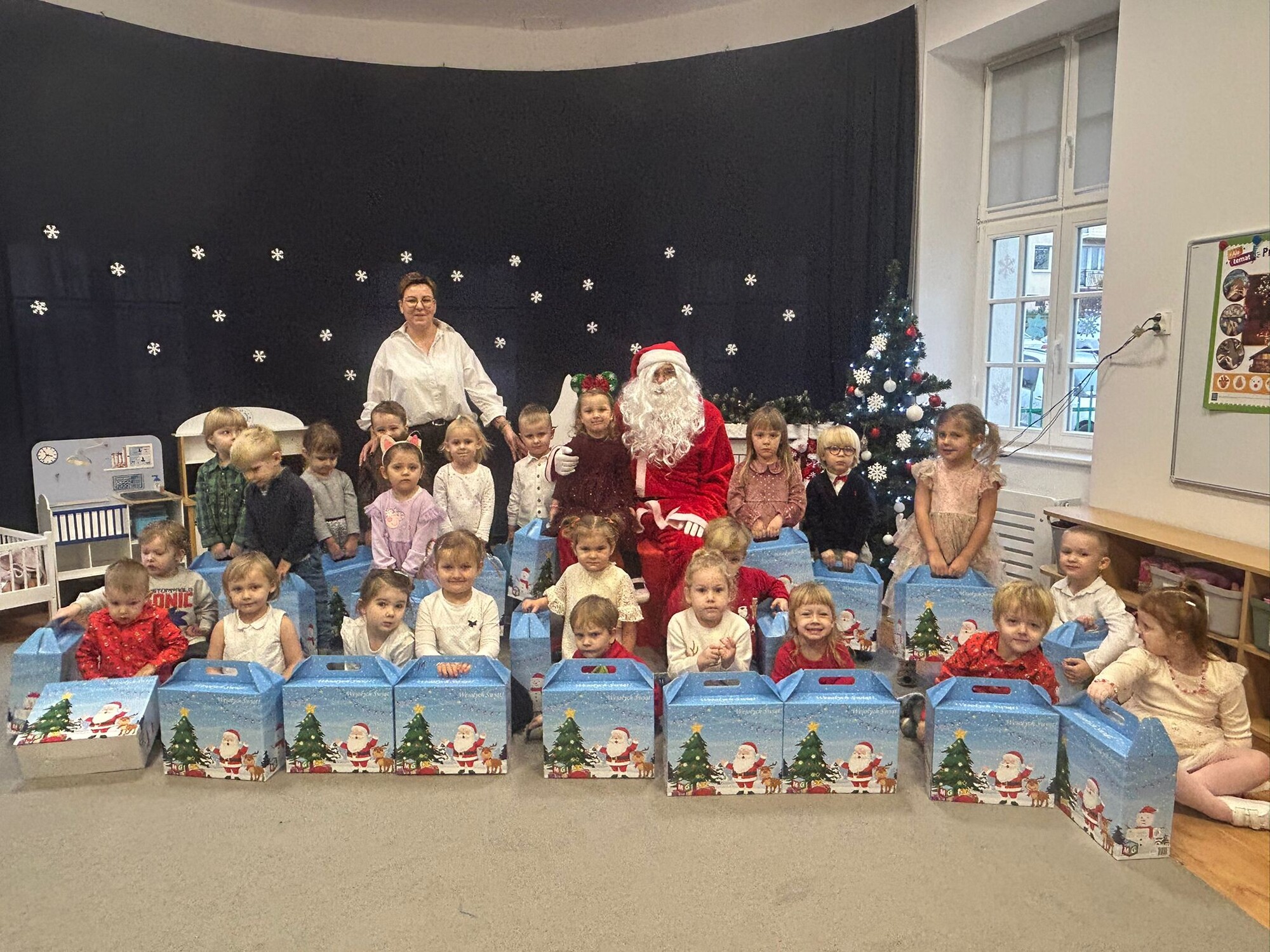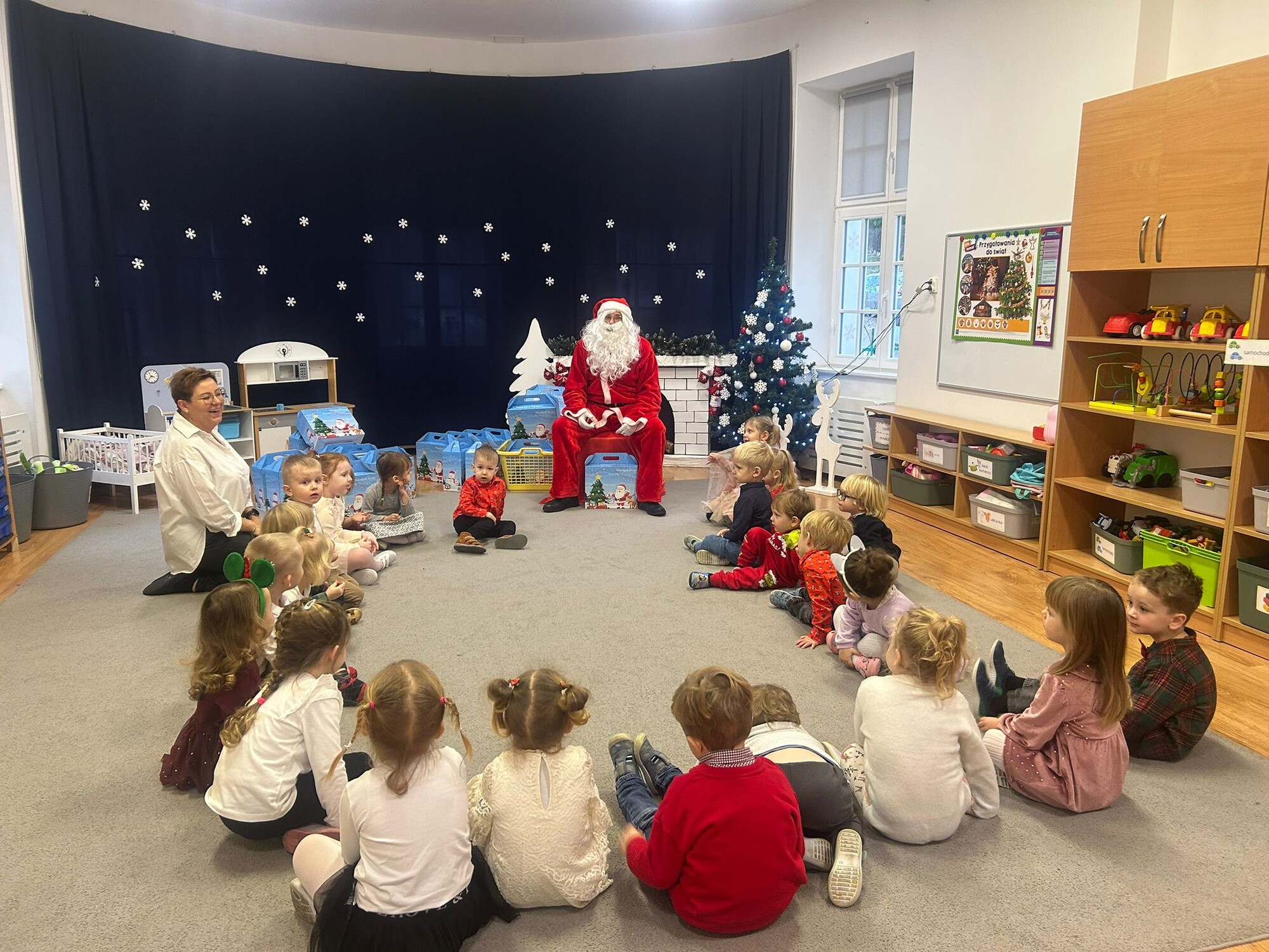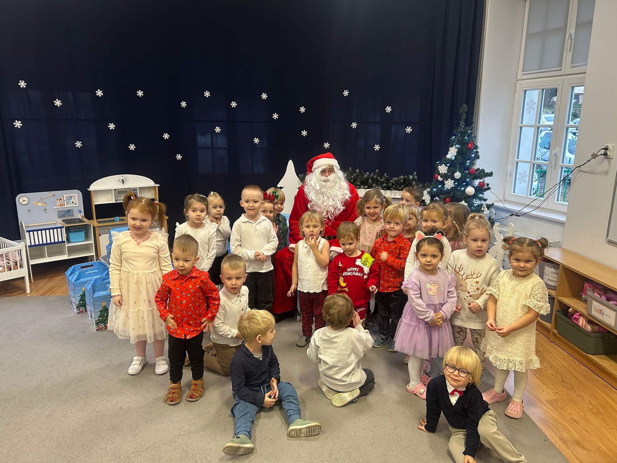 Dzieci wraz paniami wspólnie dzieliły się opłatkiem, śpiewały kolędy i cieszyły się chwilami spędzonymi razem. Niezwykłą niespodzianką była wizyta Świętego Mikołaja, który obdarował przedszkolaki pięknymi prezentami i wywołał wiele uśmiechów na twarzach dzieci.
