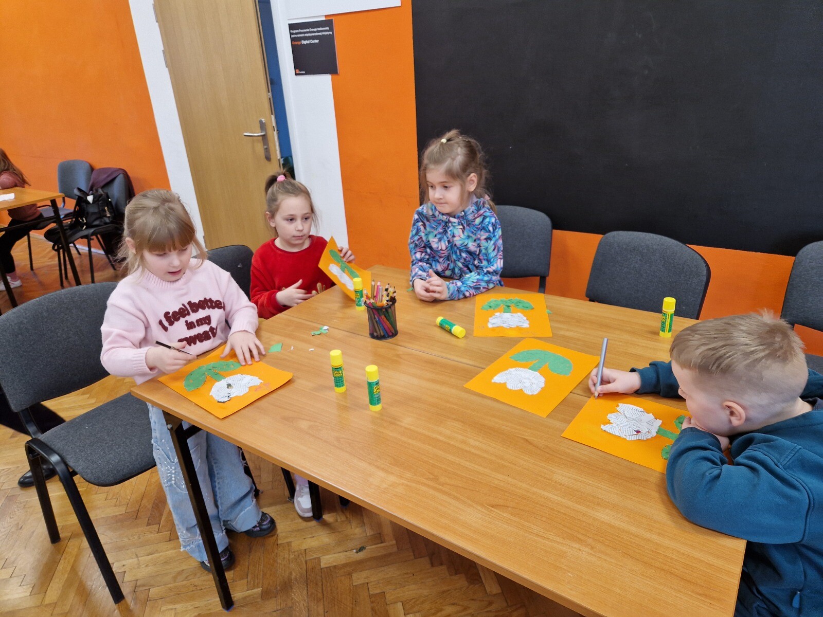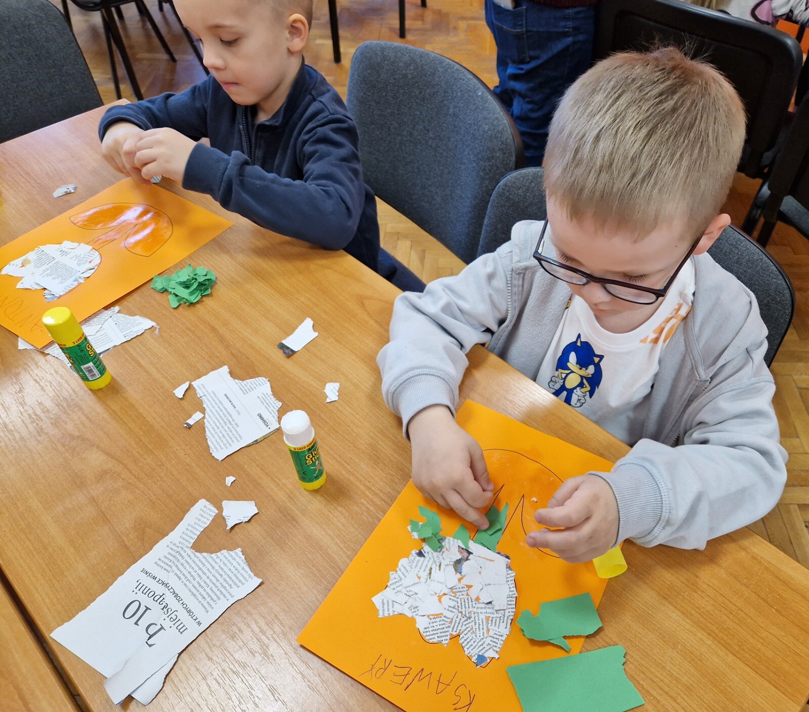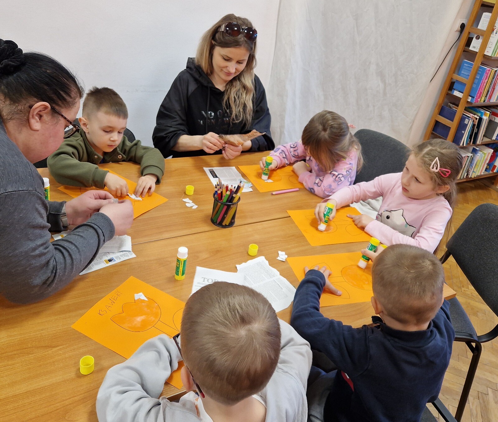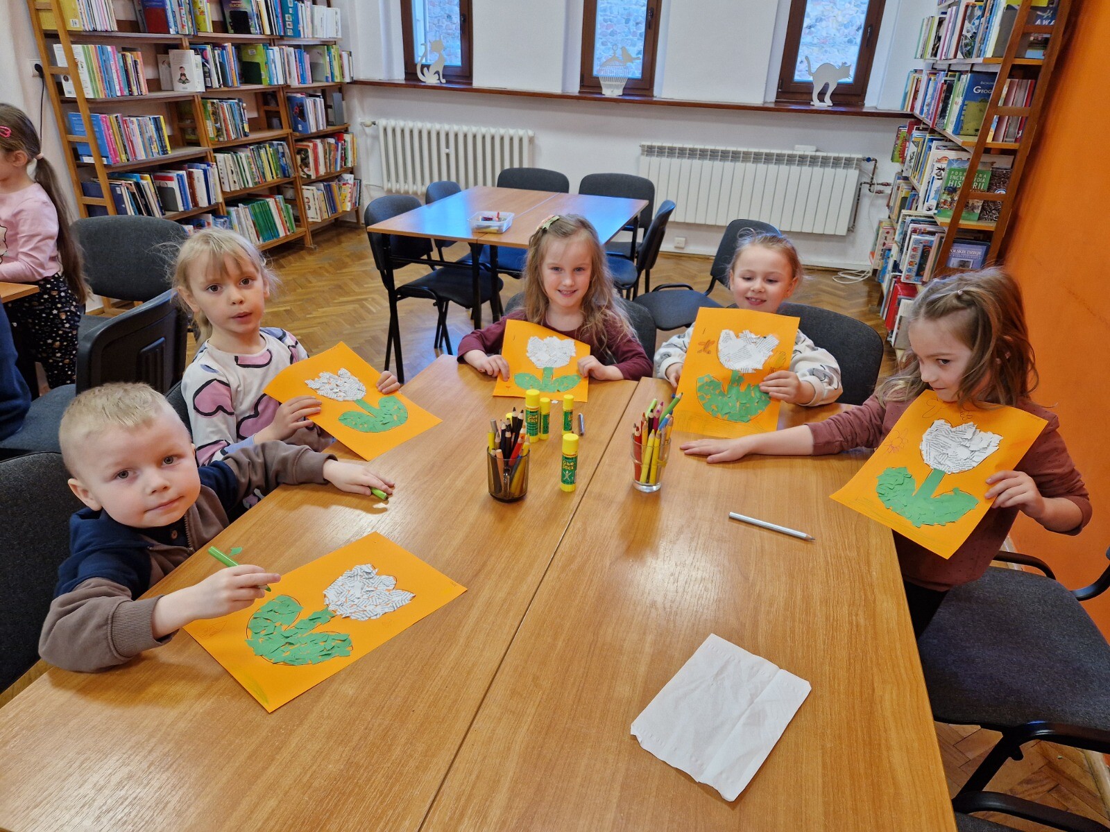 Na początku uczestnicy z dużym zaangażowaniem wykonali własnoręcznie piękne tulipany z gazet oraz kolorowego papieru, rozwijając swoją kreatywność i zdolności manualne. Następnie dzieci przystąpiły do rozwiązywania krzyżówki, której hasłem była „wiosna” – przewodni temat całego spotkania. Zadanie zostało wykonane bardzo sprawnie dzięki współpracy i wzajemnej pomocy.