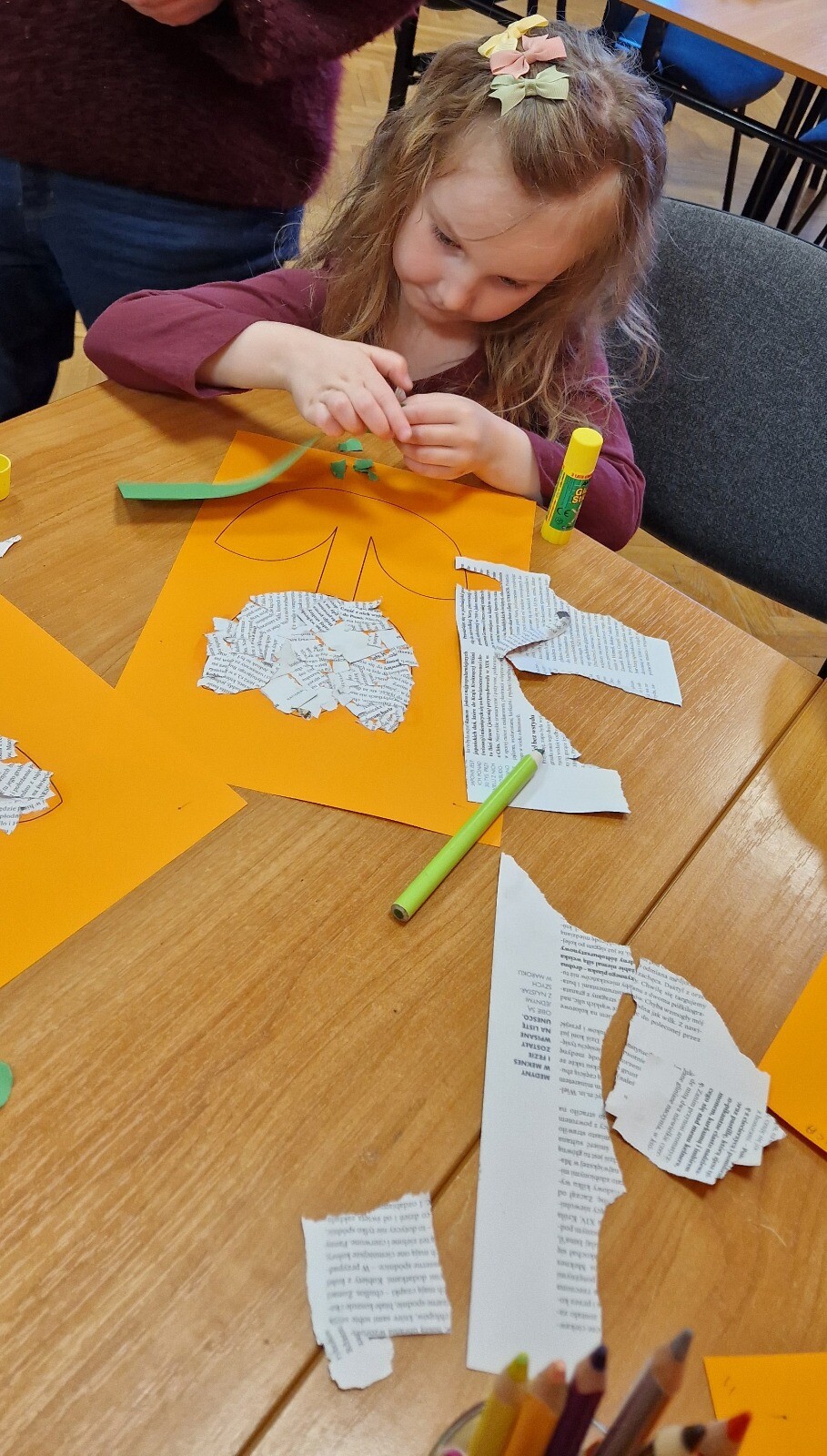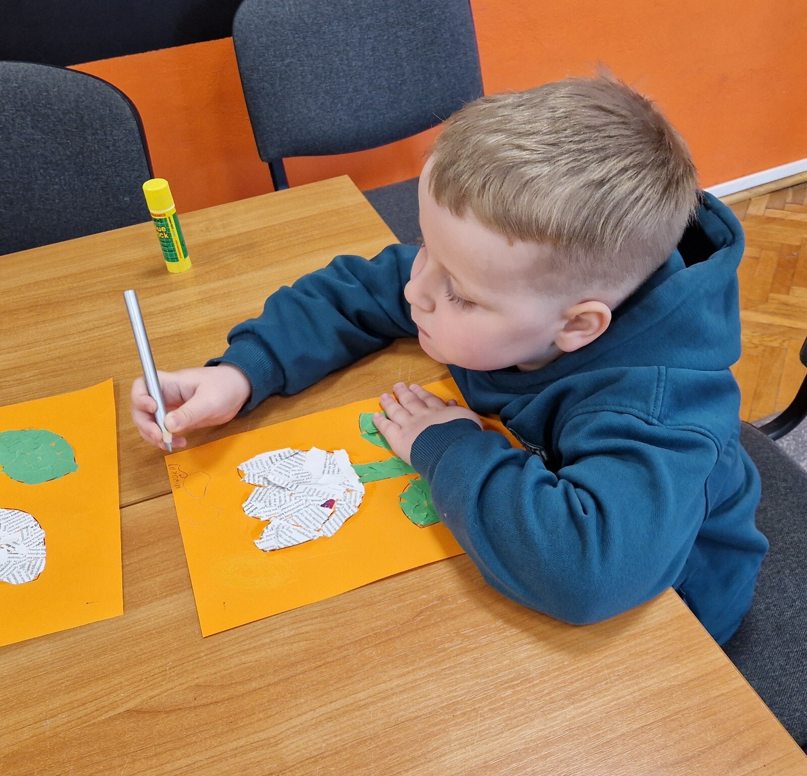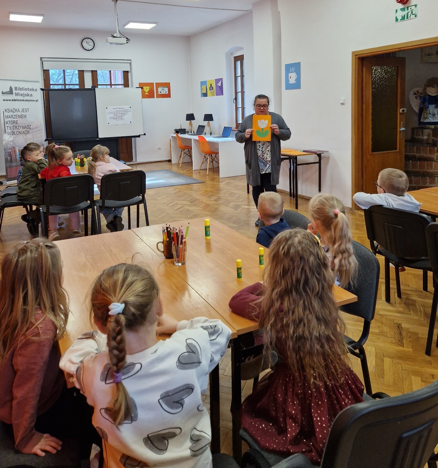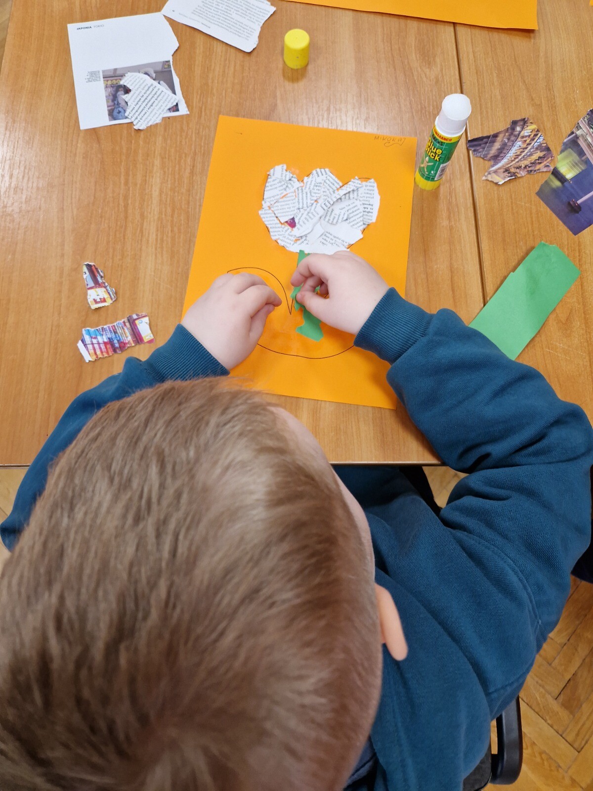 Na początku uczestnicy z dużym zaangażowaniem wykonali własnoręcznie piękne tulipany z gazet oraz kolorowego papieru, rozwijając swoją kreatywność i zdolności manualne. Następnie dzieci przystąpiły do rozwiązywania krzyżówki, której hasłem była „wiosna” – przewodni temat całego spotkania. Zadanie zostało wykonane bardzo sprawnie dzięki współpracy i wzajemnej pomocy.