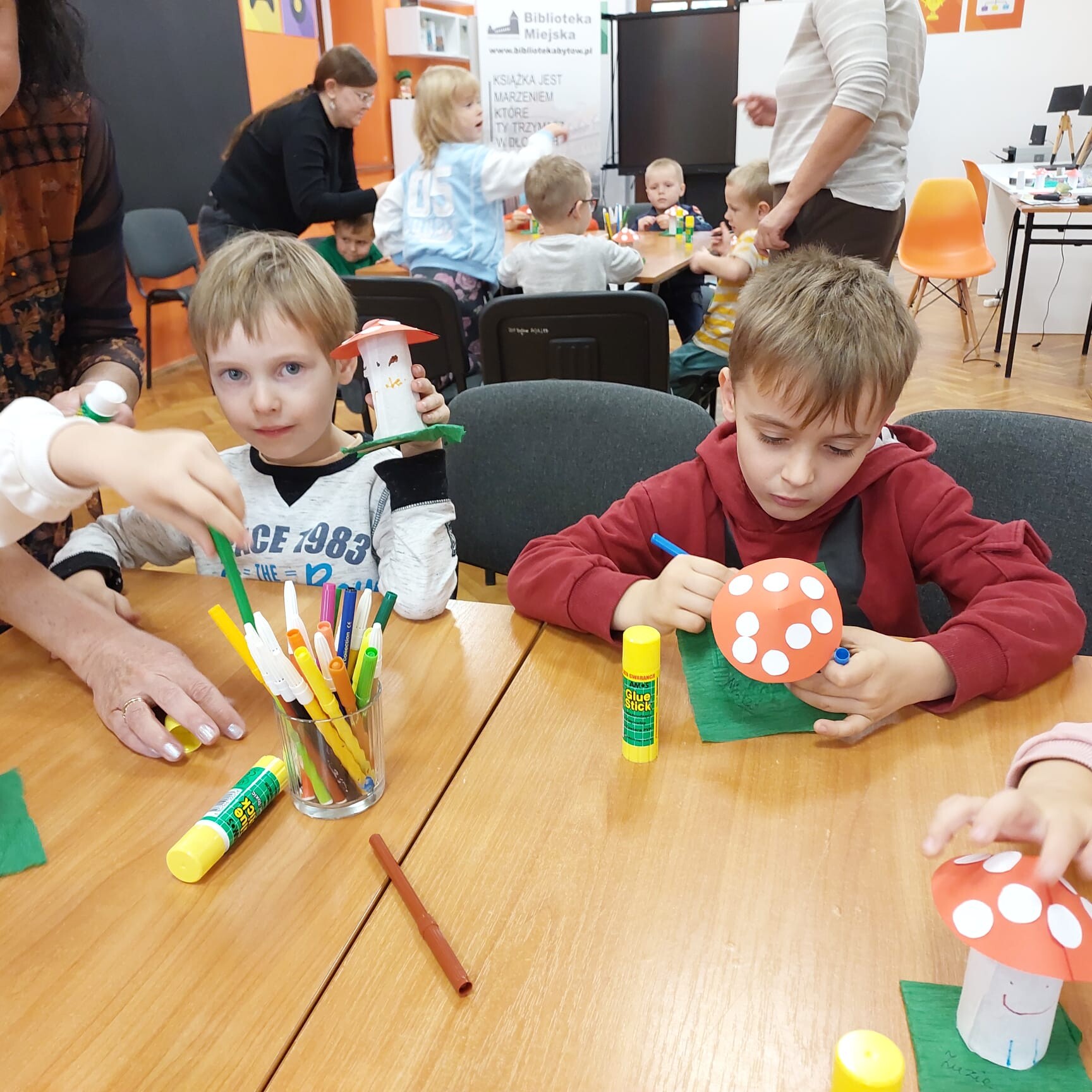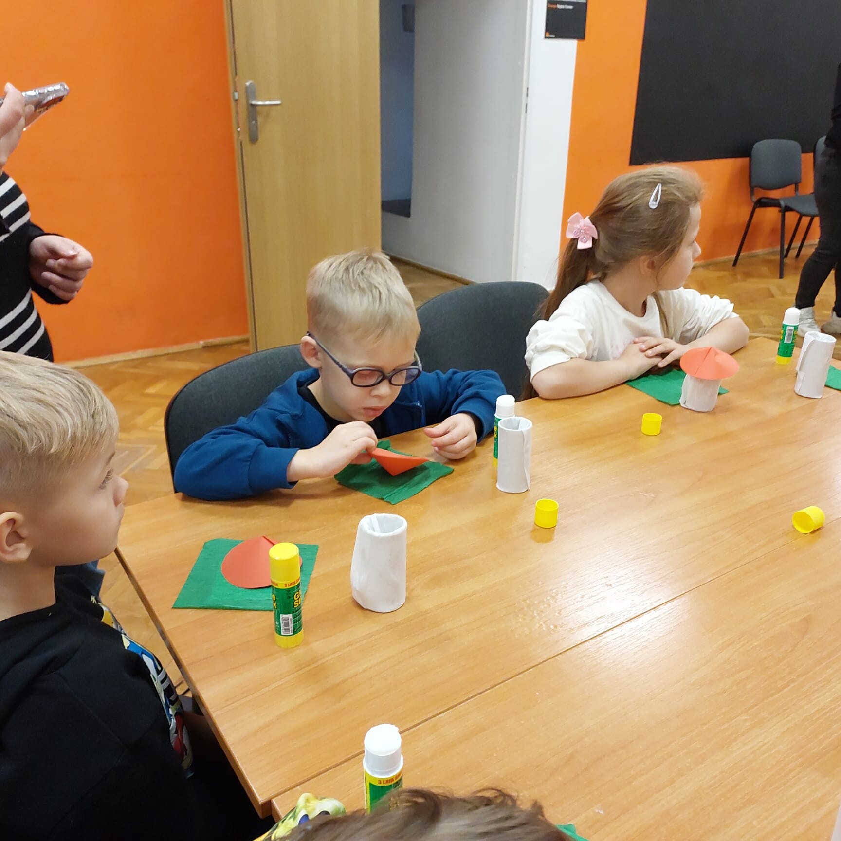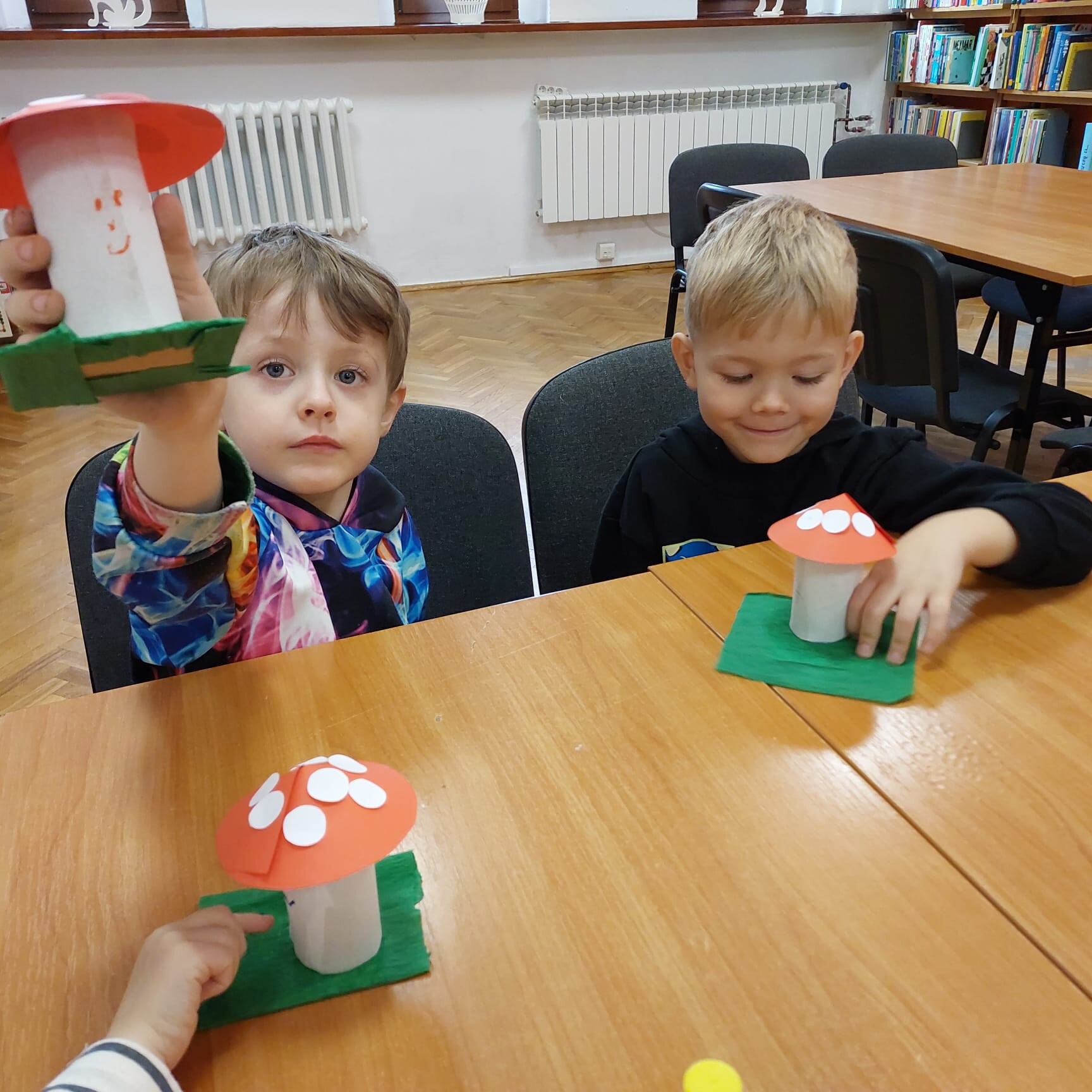 Podczas spotkania dzieci dowiedziały się, na czym polega praca pań bibliotekarek oraz jak wiele ciekawych form spędzania czasu oferuje biblioteka. Z przygotowanych przez panie materiałów przedszkolaki wykonały własne muchomorki, a wirtualna wyprawa do zaczarowanego lasu i zabawy w nim dostarczyły im wielu emocji i radości.