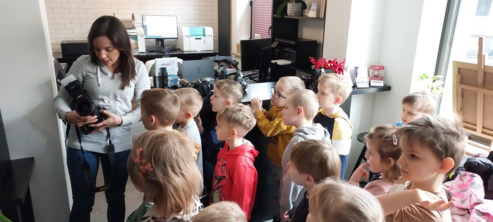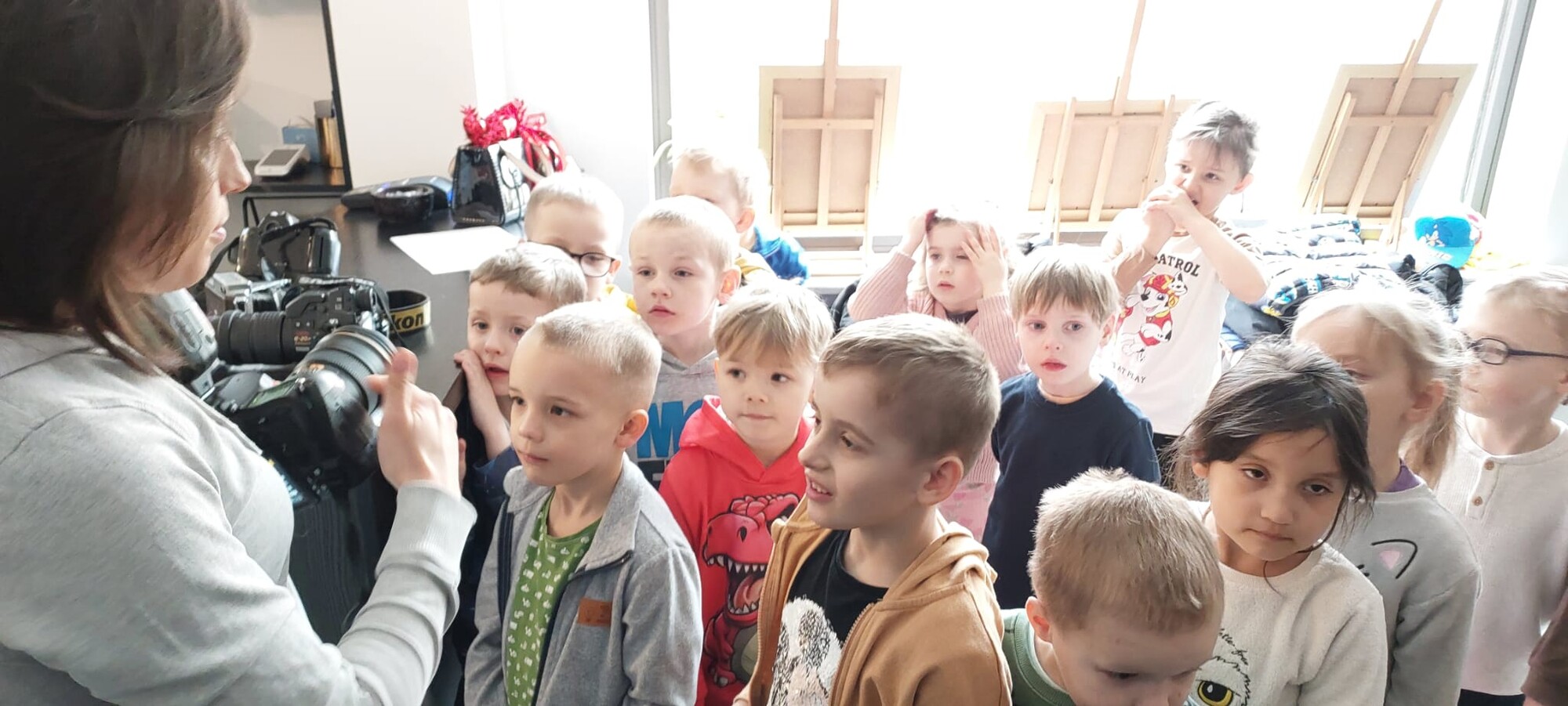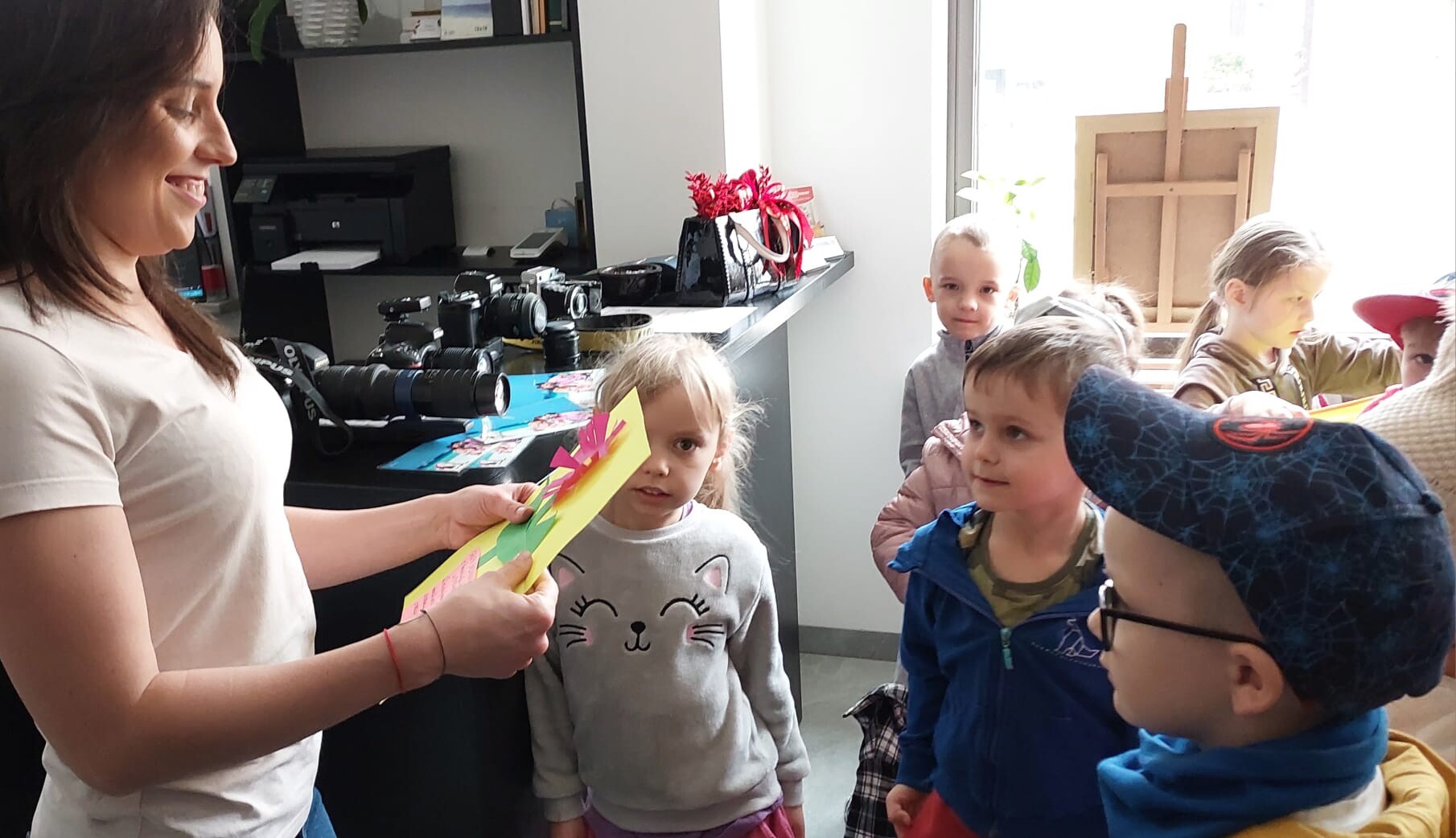 Podczas spotkania dzieci dowiedziały się, jakie są rodzaje fotografii, a także miały okazję obejrzeć zarówno dawne, jak i współczesne aparaty fotograficzne. Z dużym zainteresowaniem obserwowały pracę pani fotograf podczas sesji z klientami.